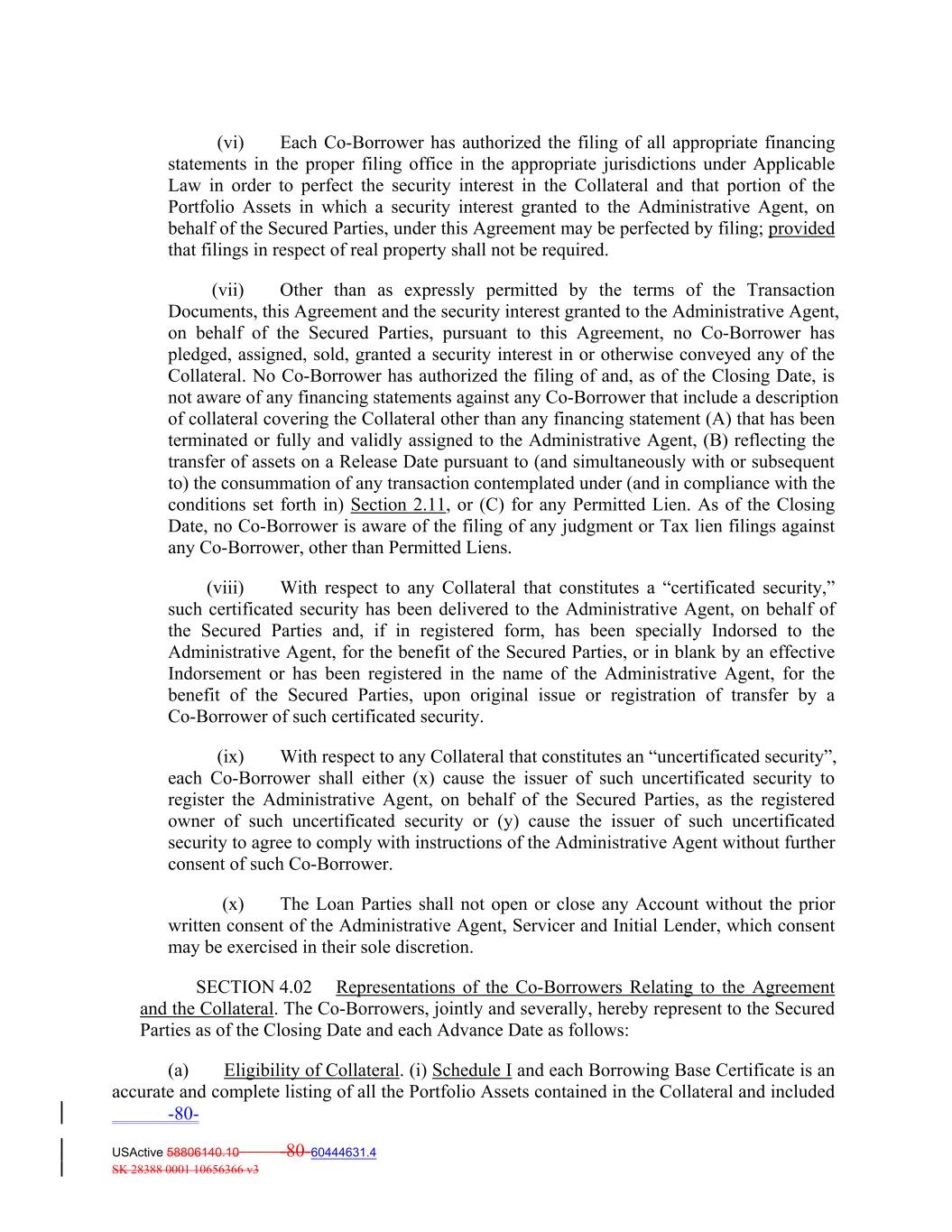 (vi) Each Co‐Borrower has authorized the filing of all appropriate financing statements in the proper filing office in the appropriate jurisdictions under Applicable Law in order to perfect the security interest in the Collateral and that portion of the Portfolio Assets in which a security interest granted to the Administrative Agent, on behalf of the Secured Parties, under this Agreement may be perfected by filing; provided that filings in respect of real property shall not be required. (vii) Other than as expressly permitted by the terms of the Transaction Documents, this Agreement and the security interest granted to the Administrative Agent, on behalf of the Secured Parties, pursuant to this Agreement, no Co‐Borrower has pledged, assigned, sold, granted a security interest in or otherwise conveyed any of the Collateral. No Co‐Borrower has authorized the filing of and, as of the Closing Date, is not aware of any financing statements against any Co‐Borrower that include a description of collateral covering the Collateral other than any financing statement (A) that has been terminated or fully and validly assigned to the Administrative Agent, (B) reflecting the transfer of assets on a Release Date pursuant to (and simultaneously with or subsequent to) the consummation of any transaction contemplated under (and in compliance with the conditions set forth in) Section 2.11, or (C) for any Permitted Lien. As of the Closing Date, no Co‐Borrower is aware of the filing of any judgment or Tax lien filings against any Co‐Borrower, other than Permitted Liens. (viii) With respect to any Collateral that constitutes a “certificated security,” such certificated security has been delivered to the Administrative Agent, on behalf of the Secured Parties and, if in registered form, has been specially Indorsed to the Administrative Agent, for the benefit of the Secured Parties, or in blank by an effective Indorsement or has been registered in the name of the Administrative Agent, for the benefit of the Secured Parties, upon original issue or registration of transfer by a Co‐Borrower of such certificated security. (ix) With respect to any Collateral that constitutes an “uncertificated security”, each Co‐Borrower shall either (x) cause the issuer of such uncertificated security to register the Administrative Agent, on behalf of the Secured Parties, as the registered owner of such uncertificated security or (y) cause the issuer of such uncertificated security to agree to comply with instructions of the Administrative Agent without further consent of such Co‐Borrower. (x) The Loan Parties shall not open or close any Account without the prior written consent of the Administrative Agent, Servicer and Initial Lender, which consent may be exercised in their sole discretion. SECTION 4.02 Representations of the Co‐Borrowers Relating to the Agreement and the Collateral. The Co‐Borrowers, jointly and severally, hereby represent to the Secured Parties as of the Closing Date and each Advance Date as follows: (a) Eligibility of Collateral. (i) Schedule I and each Borrowing Base Certificate is an accurate and complete listing of all the Portfolio Assets contained in the Collateral and included -80- USActive 58806140.10 -80-60444631.4 SK 28388 0001 10656366 v3