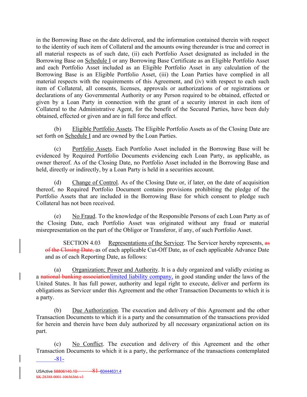 in the Borrowing Base on the date delivered, and the information contained therein with respect to the identity of such item of Collateral and the amounts owing thereunder is true and correct in all material respects as of such date, (ii) each Portfolio Asset designated as included in the Borrowing Base on Schedule I or any Borrowing Base Certificate as an Eligible Portfolio Asset and each Portfolio Asset included as an Eligible Portfolio Asset in any calculation of the Borrowing Base is an Eligible Portfolio Asset, (iii) the Loan Parties have complied in all material respects with the requirements of this Agreement, and (iv) with respect to each such item of Collateral, all consents, licenses, approvals or authorizations of or registrations or declarations of any Governmental Authority or any Person required to be obtained, effected or given by a Loan Party in connection with the grant of a security interest in each item of Collateral to the Administrative Agent, for the benefit of the Secured Parties, have been duly obtained, effected or given and are in full force and effect. (b) Eligible Portfolio Assets. The Eligible Portfolio Assets as of the Closing Date are set forth on Schedule I and are owned by the Loan Parties. (c) Portfolio Assets. Each Portfolio Asset included in the Borrowing Base will be evidenced by Required Portfolio Documents evidencing each Loan Party, as applicable, as owner thereof. As of the Closing Date, no Portfolio Asset included in the Borrowing Base and held, directly or indirectly, by a Loan Party is held in a securities account. (d) Change of Control. As of the Closing Date or, if later, on the date of acquisition thereof, no Required Portfolio Document contains provisions prohibiting the pledge of the Portfolio Assets that are included in the Borrowing Base for which consent to pledge such Collateral has not been received. (e) No Fraud. To the knowledge of the Responsible Persons of each Loan Party as of the Closing Date, each Portfolio Asset was originated without any fraud or material misrepresentation on the part of the Obligor or Transferor, if any, of such Portfolio Asset. SECTION 4.03 Representations of the Servicer. The Servicer hereby represents, as of the Closing Date, as of each applicable Cut‐Off Date, as of each applicable Advance Date and as of each Reporting Date, as follows: (a) Organization; Power and Authority. It is a duly organized and validly existing as a national banking associationlimited liability company, in good standing under the laws of the United States. It has full power, authority and legal right to execute, deliver and perform its obligations as Servicer under this Agreement and the other Transaction Documents to which it is a party. (b) Due Authorization. The execution and delivery of this Agreement and the other Transaction Documents to which it is a party and the consummation of the transactions provided for herein and therein have been duly authorized by all necessary organizational action on its part. (c) No Conflict. The execution and delivery of this Agreement and the other Transaction Documents to which it is a party, the performance of the transactions contemplated -81- USActive 58806140.10 -81-60444631.4 SK 28388 0001 10656366 v3