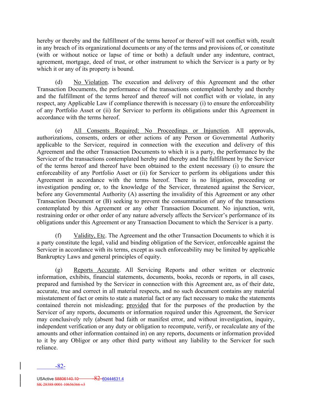 hereby or thereby and the fulfillment of the terms hereof or thereof will not conflict with, result in any breach of its organizational documents or any of the terms and provisions of, or constitute (with or without notice or lapse of time or both) a default under any indenture, contract, agreement, mortgage, deed of trust, or other instrument to which the Servicer is a party or by which it or any of its property is bound. (d) No Violation. The execution and delivery of this Agreement and the other Transaction Documents, the performance of the transactions contemplated hereby and thereby and the fulfillment of the terms hereof and thereof will not conflict with or violate, in any respect, any Applicable Law if compliance therewith is necessary (i) to ensure the enforceability of any Portfolio Asset or (ii) for Servicer to perform its obligations under this Agreement in accordance with the terms hereof. (e) All Consents Required; No Proceedings or Injunction. All approvals, authorizations, consents, orders or other actions of any Person or Governmental Authority applicable to the Servicer, required in connection with the execution and delivery of this Agreement and the other Transaction Documents to which it is a party, the performance by the Servicer of the transactions contemplated hereby and thereby and the fulfillment by the Servicer of the terms hereof and thereof have been obtained to the extent necessary (i) to ensure the enforceability of any Portfolio Asset or (ii) for Servicer to perform its obligations under this Agreement in accordance with the terms hereof. There is no litigation, proceeding or investigation pending or, to the knowledge of the Servicer, threatened against the Servicer, before any Governmental Authority (A) asserting the invalidity of this Agreement or any other Transaction Document or (B) seeking to prevent the consummation of any of the transactions contemplated by this Agreement or any other Transaction Document. No injunction, writ, restraining order or other order of any nature adversely affects the Servicer’s performance of its obligations under this Agreement or any Transaction Document to which the Servicer is a party. (f) Validity, Etc. The Agreement and the other Transaction Documents to which it is a party constitute the legal, valid and binding obligation of the Servicer, enforceable against the Servicer in accordance with its terms, except as such enforceability may be limited by applicable Bankruptcy Laws and general principles of equity. (g) Reports Accurate. All Servicing Reports and other written or electronic information, exhibits, financial statements, documents, books, records or reports, in all cases, prepared and furnished by the Servicer in connection with this Agreement are, as of their date, accurate, true and correct in all material respects, and no such document contains any material misstatement of fact or omits to state a material fact or any fact necessary to make the statements contained therein not misleading; provided that for the purposes of the production by the Servicer of any reports, documents or information required under this Agreement, the Servicer may conclusively rely (absent bad faith or manifest error, and without investigation, inquiry, independent verification or any duty or obligation to recompute, verify, or recalculate any of the amounts and other information contained in) on any reports, documents or information provided to it by any Obligor or any other third party without any liability to the Servicer for such reliance. -82- USActive 58806140.10 -82-60444631.4 SK 28388 0001 10656366 v3