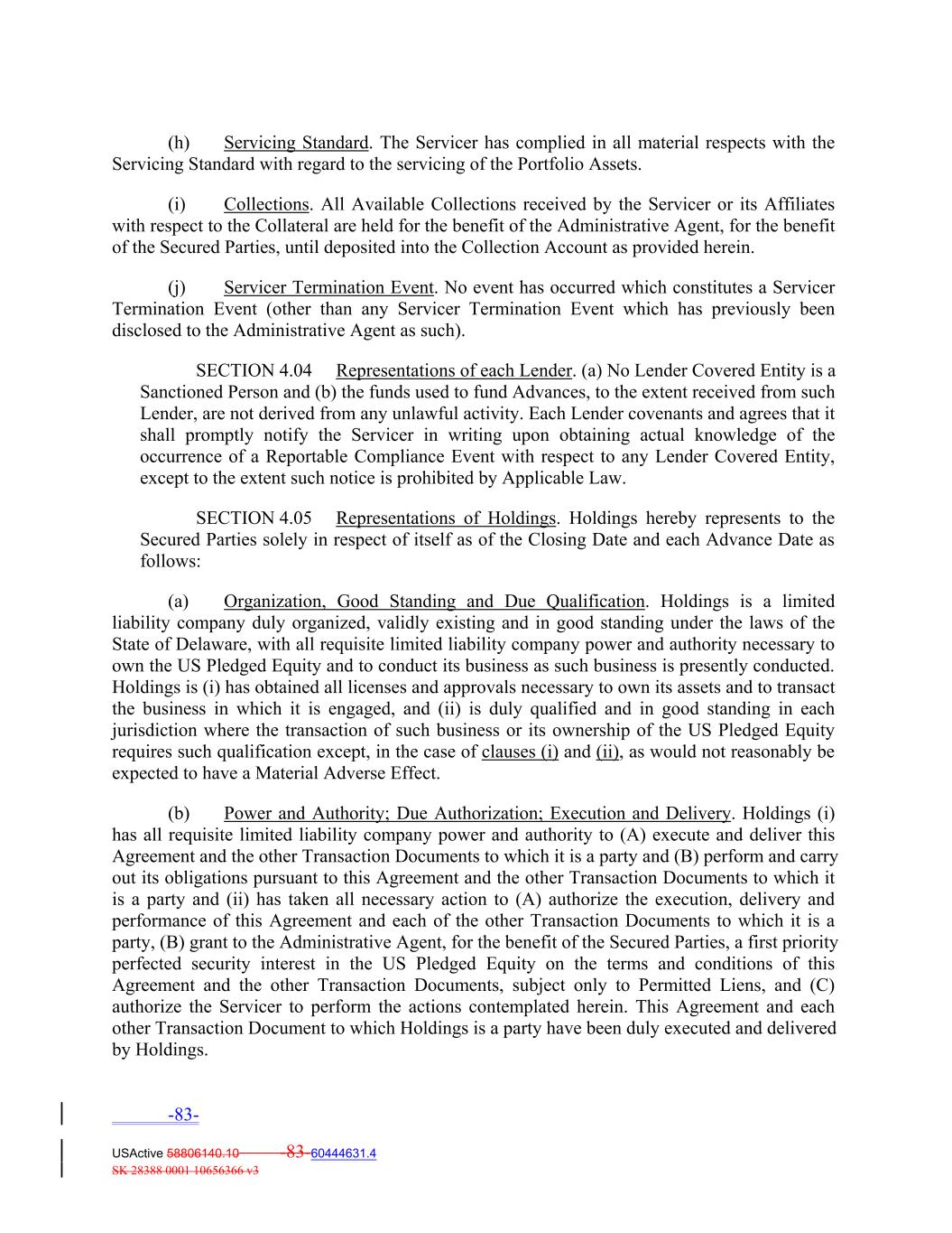 (h) Servicing Standard. The Servicer has complied in all material respects with the Servicing Standard with regard to the servicing of the Portfolio Assets. (i) Collections. All Available Collections received by the Servicer or its Affiliates with respect to the Collateral are held for the benefit of the Administrative Agent, for the benefit of the Secured Parties, until deposited into the Collection Account as provided herein. (j) Servicer Termination Event. No event has occurred which constitutes a Servicer Termination Event (other than any Servicer Termination Event which has previously been disclosed to the Administrative Agent as such). SECTION 4.04 Representations of each Lender. (a) No Lender Covered Entity is a Sanctioned Person and (b) the funds used to fund Advances, to the extent received from such Lender, are not derived from any unlawful activity. Each Lender covenants and agrees that it shall promptly notify the Servicer in writing upon obtaining actual knowledge of the occurrence of a Reportable Compliance Event with respect to any Lender Covered Entity, except to the extent such notice is prohibited by Applicable Law. SECTION 4.05 Representations of Holdings. Holdings hereby represents to the Secured Parties solely in respect of itself as of the Closing Date and each Advance Date as follows: (a) Organization, Good Standing and Due Qualification. Holdings is a limited liability company duly organized, validly existing and in good standing under the laws of the State of Delaware, with all requisite limited liability company power and authority necessary to own the US Pledged Equity and to conduct its business as such business is presently conducted. Holdings is (i) has obtained all licenses and approvals necessary to own its assets and to transact the business in which it is engaged, and (ii) is duly qualified and in good standing in each jurisdiction where the transaction of such business or its ownership of the US Pledged Equity requires such qualification except, in the case of clauses (i) and (ii), as would not reasonably be expected to have a Material Adverse Effect. (b) Power and Authority; Due Authorization; Execution and Delivery. Holdings (i) has all requisite limited liability company power and authority to (A) execute and deliver this Agreement and the other Transaction Documents to which it is a party and (B) perform and carry out its obligations pursuant to this Agreement and the other Transaction Documents to which it is a party and (ii) has taken all necessary action to (A) authorize the execution, delivery and performance of this Agreement and each of the other Transaction Documents to which it is a party, (B) grant to the Administrative Agent, for the benefit of the Secured Parties, a first priority perfected security interest in the US Pledged Equity on the terms and conditions of this Agreement and the other Transaction Documents, subject only to Permitted Liens, and (C) authorize the Servicer to perform the actions contemplated herein. This Agreement and each other Transaction Document to which Holdings is a party have been duly executed and delivered by Holdings. -83- USActive 58806140.10 -83-60444631.4 SK 28388 0001 10656366 v3
