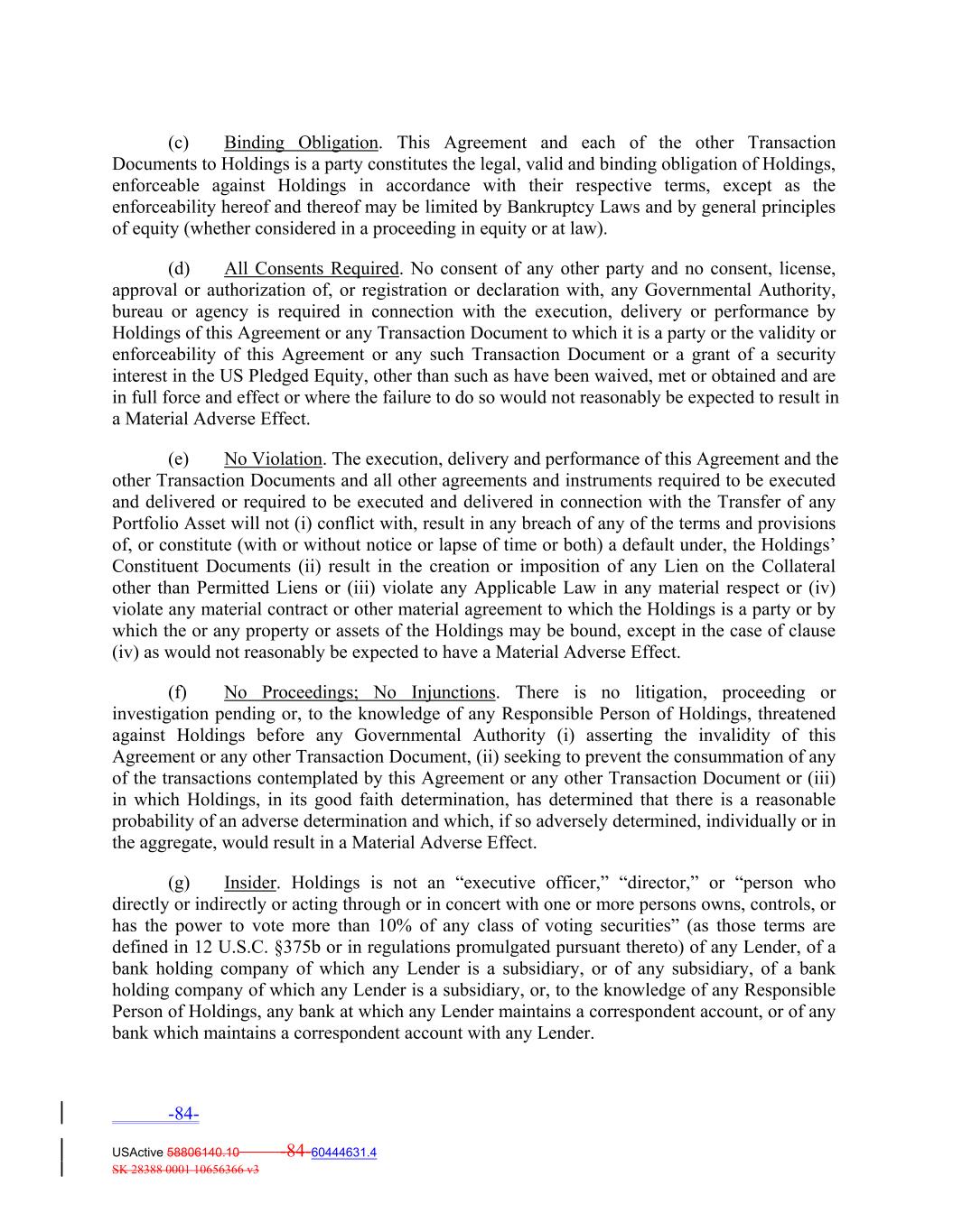 (c) Binding Obligation. This Agreement and each of the other Transaction Documents to Holdings is a party constitutes the legal, valid and binding obligation of Holdings, enforceable against Holdings in accordance with their respective terms, except as the enforceability hereof and thereof may be limited by Bankruptcy Laws and by general principles of equity (whether considered in a proceeding in equity or at law). (d) All Consents Required. No consent of any other party and no consent, license, approval or authorization of, or registration or declaration with, any Governmental Authority, bureau or agency is required in connection with the execution, delivery or performance by Holdings of this Agreement or any Transaction Document to which it is a party or the validity or enforceability of this Agreement or any such Transaction Document or a grant of a security interest in the US Pledged Equity, other than such as have been waived, met or obtained and are in full force and effect or where the failure to do so would not reasonably be expected to result in a Material Adverse Effect. (e) No Violation. The execution, delivery and performance of this Agreement and the other Transaction Documents and all other agreements and instruments required to be executed and delivered or required to be executed and delivered in connection with the Transfer of any Portfolio Asset will not (i) conflict with, result in any breach of any of the terms and provisions of, or constitute (with or without notice or lapse of time or both) a default under, the Holdings’ Constituent Documents (ii) result in the creation or imposition of any Lien on the Collateral other than Permitted Liens or (iii) violate any Applicable Law in any material respect or (iv) violate any material contract or other material agreement to which the Holdings is a party or by which the or any property or assets of the Holdings may be bound, except in the case of clause (iv) as would not reasonably be expected to have a Material Adverse Effect. (f) No Proceedings; No Injunctions. There is no litigation, proceeding or investigation pending or, to the knowledge of any Responsible Person of Holdings, threatened against Holdings before any Governmental Authority (i) asserting the invalidity of this Agreement or any other Transaction Document, (ii) seeking to prevent the consummation of any of the transactions contemplated by this Agreement or any other Transaction Document or (iii) in which Holdings, in its good faith determination, has determined that there is a reasonable probability of an adverse determination and which, if so adversely determined, individually or in the aggregate, would result in a Material Adverse Effect. (g) Insider. Holdings is not an “executive officer,” “director,” or “person who directly or indirectly or acting through or in concert with one or more persons owns, controls, or has the power to vote more than 10% of any class of voting securities” (as those terms are defined in 12 U.S.C. §375b or in regulations promulgated pursuant thereto) of any Lender, of a bank holding company of which any Lender is a subsidiary, or of any subsidiary, of a bank holding company of which any Lender is a subsidiary, or, to the knowledge of any Responsible Person of Holdings, any bank at which any Lender maintains a correspondent account, or of any bank which maintains a correspondent account with any Lender. -84- USActive 58806140.10 -84-60444631.4 SK 28388 0001 10656366 v3