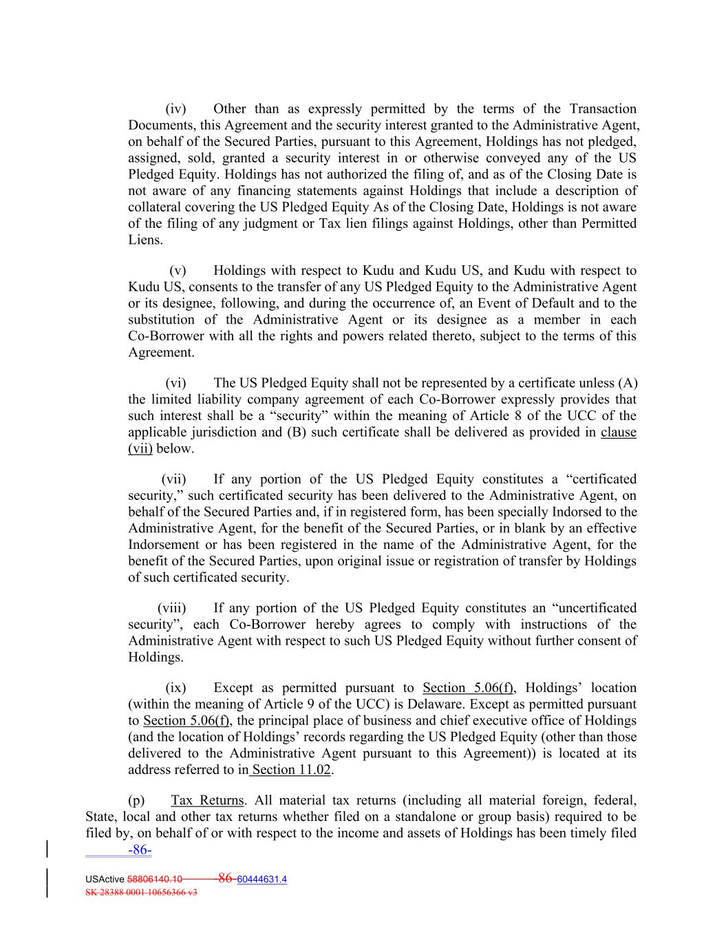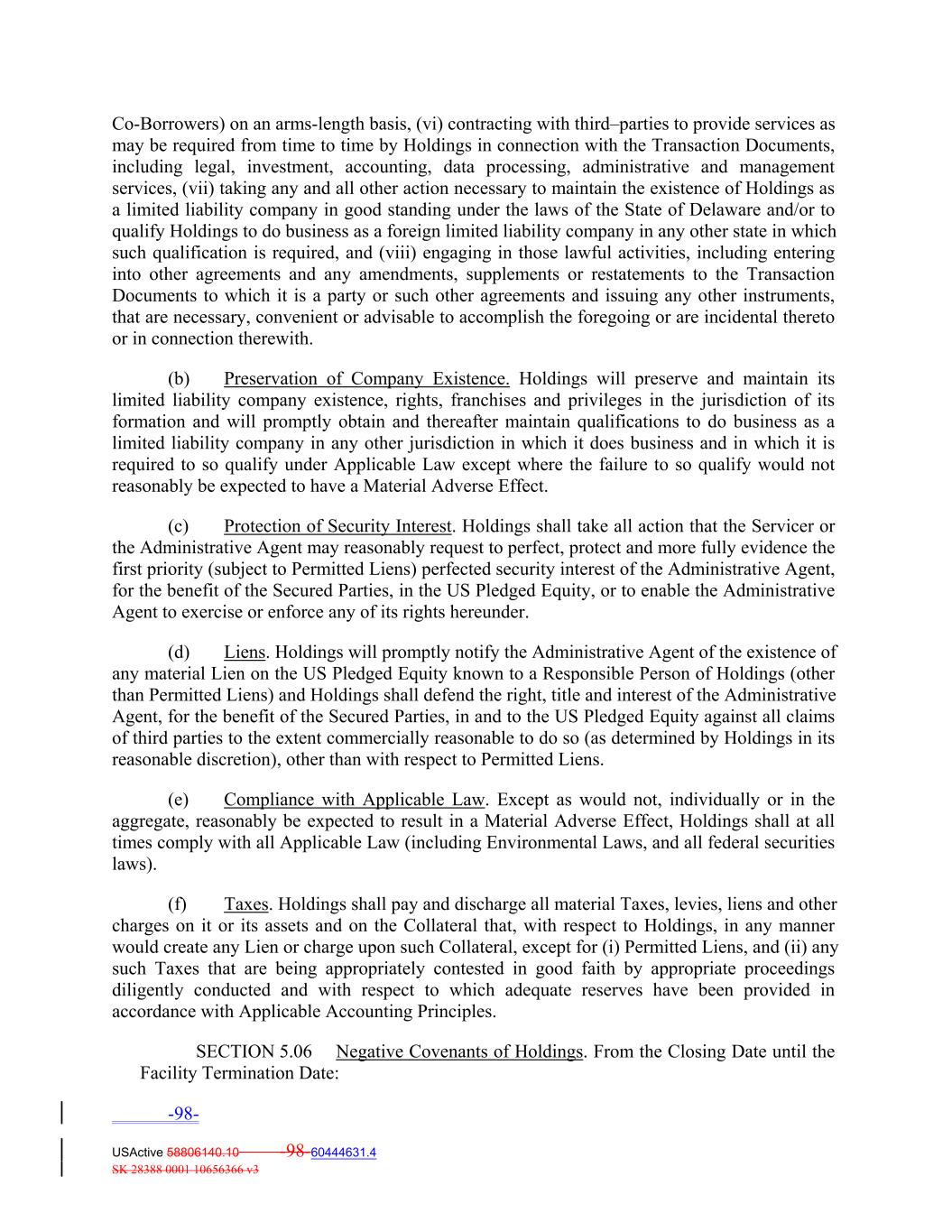 Co‐Borrowers) on an arms‐length basis, (vi) contracting with third–parties to provide services as may be required from time to time by Holdings in connection with the Transaction Documents, including legal, investment, accounting, data processing, administrative and management services, (vii) taking any and all other action necessary to maintain the existence of Holdings as a limited liability company in good standing under the laws of the State of Delaware and/or to qualify Holdings to do business as a foreign limited liability company in any other state in which such qualification is required, and (viii) engaging in those lawful activities, including entering into other agreements and any amendments, supplements or restatements to the Transaction Documents to which it is a party or such other agreements and issuing any other instruments, that are necessary, convenient or advisable to accomplish the foregoing or are incidental thereto or in connection therewith. (b) Preservation of Company Existence. Holdings will preserve and maintain its limited liability company existence, rights, franchises and privileges in the jurisdiction of its formation and will promptly obtain and thereafter maintain qualifications to do business as a limited liability company in any other jurisdiction in which it does business and in which it is required to so qualify under Applicable Law except where the failure to so qualify would not reasonably be expected to have a Material Adverse Effect. (c) Protection of Security Interest. Holdings shall take all action that the Servicer or the Administrative Agent may reasonably request to perfect, protect and more fully evidence the first priority (subject to Permitted Liens) perfected security interest of the Administrative Agent, for the benefit of the Secured Parties, in the US Pledged Equity, or to enable the Administrative Agent to exercise or enforce any of its rights hereunder. (d) Liens. Holdings will promptly notify the Administrative Agent of the existence of any material Lien on the US Pledged Equity known to a Responsible Person of Holdings (other than Permitted Liens) and Holdings shall defend the right, title and interest of the Administrative Agent, for the benefit of the Secured Parties, in and to the US Pledged Equity against all claims of third parties to the extent commercially reasonable to do so (as determined by Holdings in its reasonable discretion), other than with respect to Permitted Liens. (e) Compliance with Applicable Law. Except as would not, individually or in the aggregate, reasonably be expected to result in a Material Adverse Effect, Holdings shall at all times comply with all Applicable Law (including Environmental Laws, and all federal securities laws). (f) Taxes. Holdings shall pay and discharge all material Taxes, levies, liens and other charges on it or its assets and on the Collateral that, with respect to Holdings, in any manner would create any Lien or charge upon such Collateral, except for (i) Permitted Liens, and (ii) any such Taxes that are being appropriately contested in good faith by appropriate proceedings diligently conducted and with respect to which adequate reserves have been provided in accordance with Applicable Accounting Principles. SECTION 5.06 Negative Covenants of Holdings. From the Closing Date until the Facility Termination Date: -98- USActive 58806140.10 -98-60444631.4 SK 28388 0001 10656366 v3