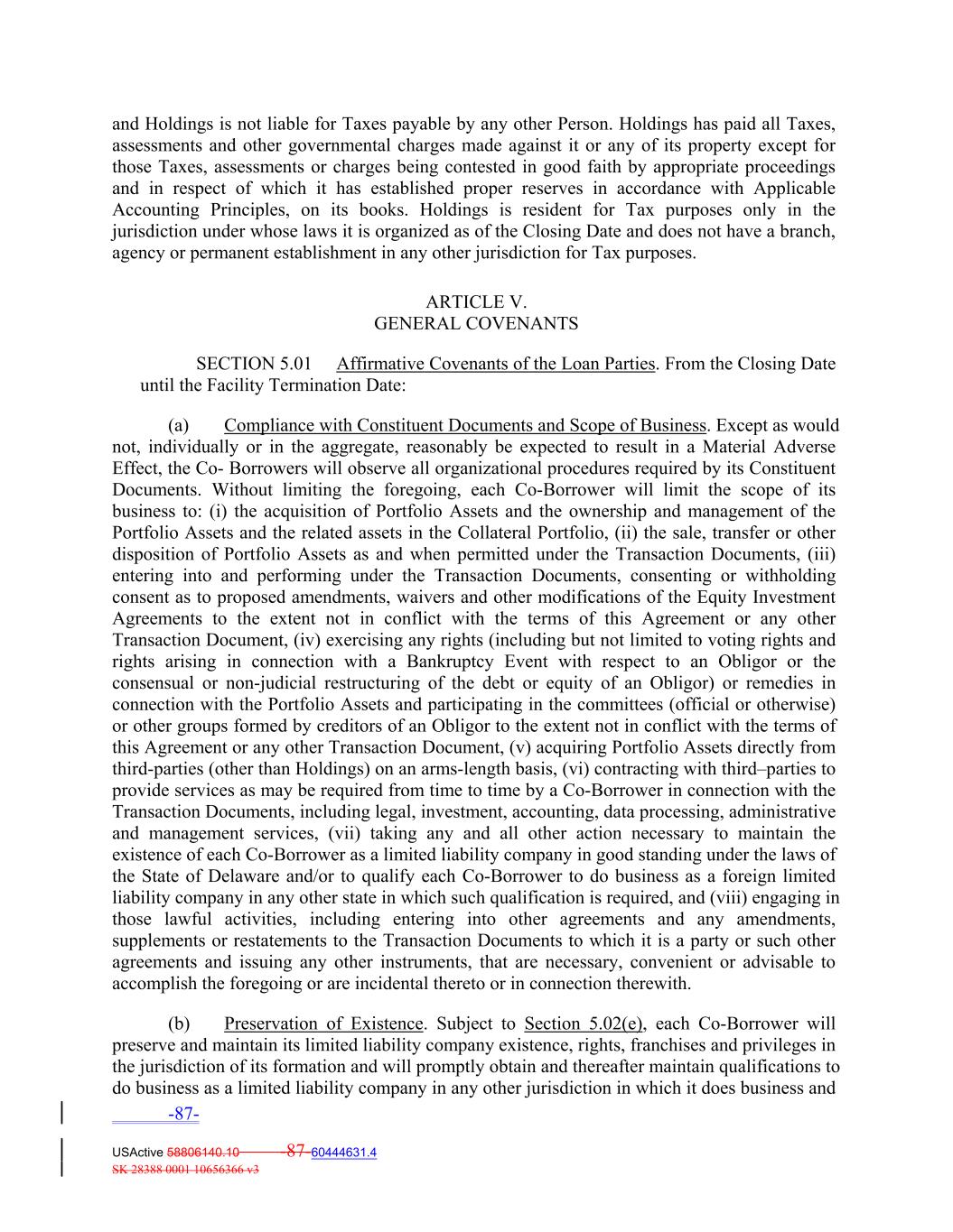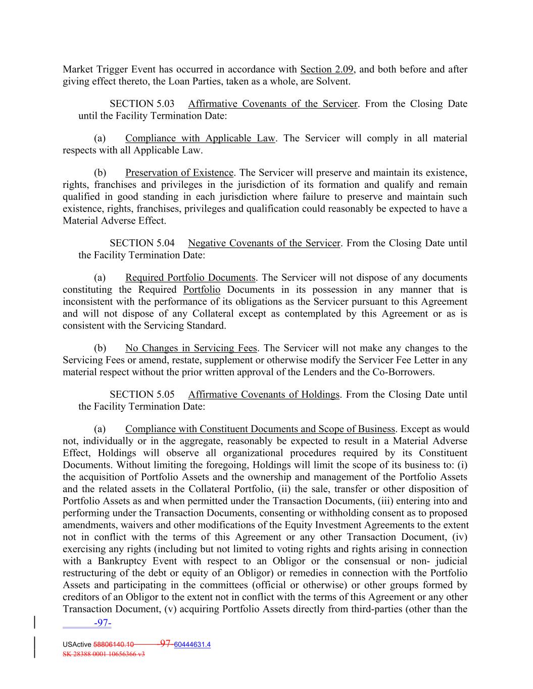 Market Trigger Event has occurred in accordance with Section 2.09, and both before and after giving effect thereto, the Loan Parties, taken as a whole, are Solvent. SECTION 5.03 Affirmative Covenants of the Servicer. From the Closing Date until the Facility Termination Date: (a) Compliance with Applicable Law. The Servicer will comply in all material respects with all Applicable Law. (b) Preservation of Existence. The Servicer will preserve and maintain its existence, rights, franchises and privileges in the jurisdiction of its formation and qualify and remain qualified in good standing in each jurisdiction where failure to preserve and maintain such existence, rights, franchises, privileges and qualification could reasonably be expected to have a Material Adverse Effect. SECTION 5.04 Negative Covenants of the Servicer. From the Closing Date until the Facility Termination Date: (a) Required Portfolio Documents. The Servicer will not dispose of any documents constituting the Required Portfolio Documents in its possession in any manner that is inconsistent with the performance of its obligations as the Servicer pursuant to this Agreement and will not dispose of any Collateral except as contemplated by this Agreement or as is consistent with the Servicing Standard. (b) No Changes in Servicing Fees. The Servicer will not make any changes to the Servicing Fees or amend, restate, supplement or otherwise modify the Servicer Fee Letter in any material respect without the prior written approval of the Lenders and the Co‐Borrowers. SECTION 5.05 Affirmative Covenants of Holdings. From the Closing Date until the Facility Termination Date: (a) Compliance with Constituent Documents and Scope of Business. Except as would not, individually or in the aggregate, reasonably be expected to result in a Material Adverse Effect, Holdings will observe all organizational procedures required by its Constituent Documents. Without limiting the foregoing, Holdings will limit the scope of its business to: (i) the acquisition of Portfolio Assets and the ownership and management of the Portfolio Assets and the related assets in the Collateral Portfolio, (ii) the sale, transfer or other disposition of Portfolio Assets as and when permitted under the Transaction Documents, (iii) entering into and performing under the Transaction Documents, consenting or withholding consent as to proposed amendments, waivers and other modifications of the Equity Investment Agreements to the extent not in conflict with the terms of this Agreement or any other Transaction Document, (iv) exercising any rights (including but not limited to voting rights and rights arising in connection with a Bankruptcy Event with respect to an Obligor or the consensual or non‐ judicial restructuring of the debt or equity of an Obligor) or remedies in connection with the Portfolio Assets and participating in the committees (official or otherwise) or other groups formed by creditors of an Obligor to the extent not in conflict with the terms of this Agreement or any other Transaction Document, (v) acquiring Portfolio Assets directly from third‐parties (other than the -97- USActive 58806140.10 -97-60444631.4 SK 28388 0001 10656366 v3