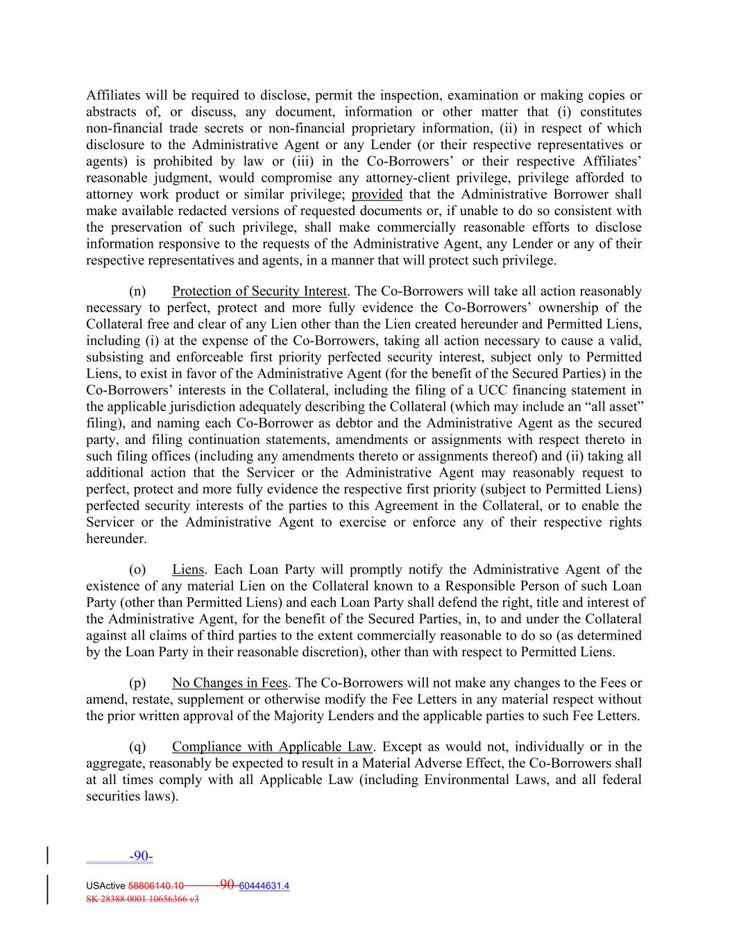Affiliates will be required to disclose, permit the inspection, examination or making copies or abstracts of, or discuss, any document, information or other matter that (i) constitutes non‐financial trade secrets or non‐financial proprietary information, (ii) in respect of which disclosure to the Administrative Agent or any Lender (or their respective representatives or agents) is prohibited by law or (iii) in the Co‐Borrowers’ or their respective Affiliates’ reasonable judgment, would compromise any attorney‐client privilege, privilege afforded to attorney work product or similar privilege; provided that the Administrative Borrower shall make available redacted versions of requested documents or, if unable to do so consistent with the preservation of such privilege, shall make commercially reasonable efforts to disclose information responsive to the requests of the Administrative Agent, any Lender or any of their respective representatives and agents, in a manner that will protect such privilege. (n) Protection of Security Interest. The Co‐Borrowers will take all action reasonably necessary to perfect, protect and more fully evidence the Co‐Borrowers’ ownership of the Collateral free and clear of any Lien other than the Lien created hereunder and Permitted Liens, including (i) at the expense of the Co‐Borrowers, taking all action necessary to cause a valid, subsisting and enforceable first priority perfected security interest, subject only to Permitted Liens, to exist in favor of the Administrative Agent (for the benefit of the Secured Parties) in the Co‐Borrowers’ interests in the Collateral, including the filing of a UCC financing statement in the applicable jurisdiction adequately describing the Collateral (which may include an “all asset” filing), and naming each Co‐Borrower as debtor and the Administrative Agent as the secured party, and filing continuation statements, amendments or assignments with respect thereto in such filing offices (including any amendments thereto or assignments thereof) and (ii) taking all additional action that the Servicer or the Administrative Agent may reasonably request to perfect, protect and more fully evidence the respective first priority (subject to Permitted Liens) perfected security interests of the parties to this Agreement in the Collateral, or to enable the Servicer or the Administrative Agent to exercise or enforce any of their respective rights hereunder. (o) Liens. Each Loan Party will promptly notify the Administrative Agent of the existence of any material Lien on the Collateral known to a Responsible Person of such Loan Party (other than Permitted Liens) and each Loan Party shall defend the right, title and interest of the Administrative Agent, for the benefit of the Secured Parties, in, to and under the Collateral against all claims of third parties to the extent commercially reasonable to do so (as determined by the Loan Party in their reasonable discretion), other than with respect to Permitted Liens. (p) No Changes in Fees. The Co‐Borrowers will not make any changes to the Fees or amend, restate, supplement or otherwise modify the Fee Letters in any material respect without the prior written approval of the Majority Lenders and the applicable parties to such Fee Letters. (q) Compliance with Applicable Law. Except as would not, individually or in the aggregate, reasonably be expected to result in a Material Adverse Effect, the Co‐Borrowers shall at all times comply with all Applicable Law (including Environmental Laws, and all federal securities laws). -90- USActive 58806140.10 -90-60444631.4 SK 28388 0001 10656366 v3