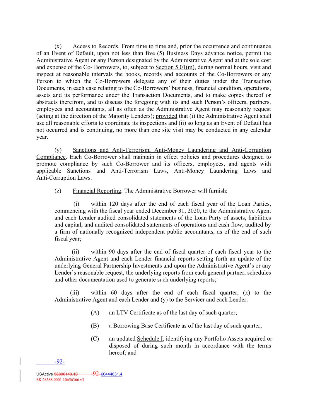(x) Access to Records. From time to time and, prior the occurrence and continuance of an Event of Default, upon not less than five (5) Business Days advance notice, permit the Administrative Agent or any Person designated by the Administrative Agent and at the sole cost and expense of the Co‐ Borrowers, to, subject to Section 5.01(m), during normal hours, visit and inspect at reasonable intervals the books, records and accounts of the Co‐Borrowers or any Person to which the Co‐Borrowers delegate any of their duties under the Transaction Documents, in each case relating to the Co‐Borrowers’ business, financial condition, operations, assets and its performance under the Transaction Documents, and to make copies thereof or abstracts therefrom, and to discuss the foregoing with its and such Person’s officers, partners, employees and accountants, all as often as the Administrative Agent may reasonably request (acting at the direction of the Majority Lenders); provided that (i) the Administrative Agent shall use all reasonable efforts to coordinate its inspections and (ii) so long as an Event of Default has not occurred and is continuing, no more than one site visit may be conducted in any calendar year. (y) Sanctions and Anti‐Terrorism, Anti‐Money Laundering and Anti‐Corruption Compliance. Each Co‐Borrower shall maintain in effect policies and procedures designed to promote compliance by such Co‐Borrower and its officers, employees, and agents with applicable Sanctions and Anti‐Terrorism Laws, Anti‐Money Laundering Laws and Anti‐Corruption Laws. (z) Financial Reporting. The Administrative Borrower will furnish: (i) within 120 days after the end of each fiscal year of the Loan Parties, commencing with the fiscal year ended December 31, 2020, to the Administrative Agent and each Lender audited consolidated statements of the Loan Party of assets, liabilities and capital, and audited consolidated statements of operations and cash flow, audited by a firm of nationally recognized independent public accountants, as of the end of such fiscal year; (ii) within 90 days after the end of fiscal quarter of each fiscal year to the Administrative Agent and each Lender financial reports setting forth an update of the underlying General Partnership Investments and upon the Administrative Agent’s or any Lender’s reasonable request, the underlying reports from each general partner, schedules and other documentation used to generate such underlying reports; (iii) within 60 days after the end of each fiscal quarter, (x) to the Administrative Agent and each Lender and (y) to the Servicer and each Lender: (A) an LTV Certificate as of the last day of such quarter; (B) a Borrowing Base Certificate as of the last day of such quarter; (C) an updated Schedule I, identifying any Portfolio Assets acquired or disposed of during such month in accordance with the terms hereof; and -92- USActive 58806140.10 -92-60444631.4 SK 28388 0001 10656366 v3