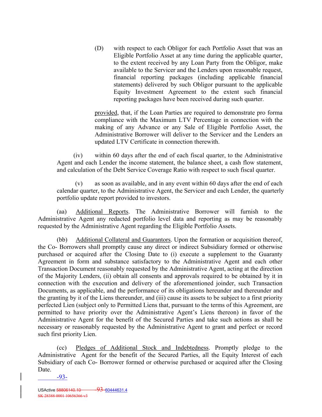 (D) with respect to each Obligor for each Portfolio Asset that was an Eligible Portfolio Asset at any time during the applicable quarter, to the extent received by any Loan Party from the Obligor, make available to the Servicer and the Lenders upon reasonable request, financial reporting packages (including applicable financial statements) delivered by such Obligor pursuant to the applicable Equity Investment Agreement to the extent such financial reporting packages have been received during such quarter. provided, that, if the Loan Parties are required to demonstrate pro forma compliance with the Maximum LTV Percentage in connection with the making of any Advance or any Sale of Eligible Portfolio Asset, the Administrative Borrower will deliver to the Servicer and the Lenders an updated LTV Certificate in connection therewith. (iv) within 60 days after the end of each fiscal quarter, to the Administrative Agent and each Lender the income statement, the balance sheet, a cash flow statement, and calculation of the Debt Service Coverage Ratio with respect to such fiscal quarter. (v) as soon as available, and in any event within 60 days after the end of each calendar quarter, to the Administrative Agent, the Servicer and each Lender, the quarterly portfolio update report provided to investors. (aa) Additional Reports. The Administrative Borrower will furnish to the Administrative Agent any redacted portfolio level data and reporting as may be reasonably requested by the Administrative Agent regarding the Eligible Portfolio Assets. (bb) Additional Collateral and Guarantors. Upon the formation or acquisition thereof, the Co‐ Borrowers shall promptly cause any direct or indirect Subsidiary formed or otherwise purchased or acquired after the Closing Date to (i) execute a supplement to the Guaranty Agreement in form and substance satisfactory to the Administrative Agent and each other Transaction Document reasonably requested by the Administrative Agent, acting at the direction of the Majority Lenders, (ii) obtain all consents and approvals required to be obtained by it in connection with the execution and delivery of the aforementioned joinder, such Transaction Documents, as applicable, and the performance of its obligations hereunder and thereunder and the granting by it of the Liens thereunder, and (iii) cause its assets to be subject to a first priority perfected Lien (subject only to Permitted Liens that, pursuant to the terms of this Agreement, are permitted to have priority over the Administrative Agent’s Liens thereon) in favor of the Administrative Agent for the benefit of the Secured Parties and take such actions as shall be necessary or reasonably requested by the Administrative Agent to grant and perfect or record such first priority Lien. (cc) Pledges of Additional Stock and Indebtedness. Promptly pledge to the Administrative Agent for the benefit of the Secured Parties, all the Equity Interest of each Subsidiary of each Co‐ Borrower formed or otherwise purchased or acquired after the Closing Date. -93- USActive 58806140.10 -93-60444631.4 SK 28388 0001 10656366 v3