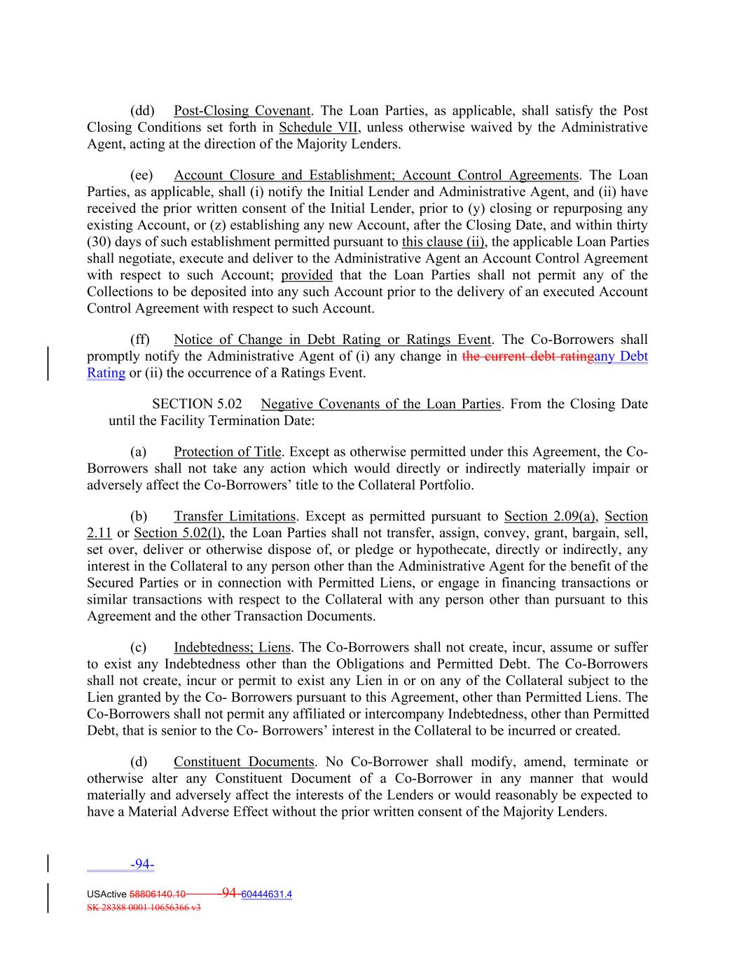 (dd) Post‐Closing Covenant. The Loan Parties, as applicable, shall satisfy the Post Closing Conditions set forth in Schedule VII, unless otherwise waived by the Administrative Agent, acting at the direction of the Majority Lenders. (ee) Account Closure and Establishment; Account Control Agreements. The Loan Parties, as applicable, shall (i) notify the Initial Lender and Administrative Agent, and (ii) have received the prior written consent of the Initial Lender, prior to (y) closing or repurposing any existing Account, or (z) establishing any new Account, after the Closing Date, and within thirty (30) days of such establishment permitted pursuant to this clause (ii), the applicable Loan Parties shall negotiate, execute and deliver to the Administrative Agent an Account Control Agreement with respect to such Account; provided that the Loan Parties shall not permit any of the Collections to be deposited into any such Account prior to the delivery of an executed Account Control Agreement with respect to such Account. (ff) Notice of Change in Debt Rating or Ratings Event. The Co-Borrowers shall promptly notify the Administrative Agent of (i) any change in the current debt ratingany Debt Rating or (ii) the occurrence of a Ratings Event. SECTION 5.02 Negative Covenants of the Loan Parties. From the Closing Date until the Facility Termination Date: (a) Protection of Title. Except as otherwise permitted under this Agreement, the Co‐ Borrowers shall not take any action which would directly or indirectly materially impair or adversely affect the Co‐Borrowers’ title to the Collateral Portfolio. (b) Transfer Limitations. Except as permitted pursuant to Section 2.09(a), Section 2.11 or Section 5.02(l), the Loan Parties shall not transfer, assign, convey, grant, bargain, sell, set over, deliver or otherwise dispose of, or pledge or hypothecate, directly or indirectly, any interest in the Collateral to any person other than the Administrative Agent for the benefit of the Secured Parties or in connection with Permitted Liens, or engage in financing transactions or similar transactions with respect to the Collateral with any person other than pursuant to this Agreement and the other Transaction Documents. (c) Indebtedness; Liens. The Co‐Borrowers shall not create, incur, assume or suffer to exist any Indebtedness other than the Obligations and Permitted Debt. The Co‐Borrowers shall not create, incur or permit to exist any Lien in or on any of the Collateral subject to the Lien granted by the Co‐ Borrowers pursuant to this Agreement, other than Permitted Liens. The Co‐Borrowers shall not permit any affiliated or intercompany Indebtedness, other than Permitted Debt, that is senior to the Co‐ Borrowers’ interest in the Collateral to be incurred or created. (d) Constituent Documents. No Co‐Borrower shall modify, amend, terminate or otherwise alter any Constituent Document of a Co‐Borrower in any manner that would materially and adversely affect the interests of the Lenders or would reasonably be expected to have a Material Adverse Effect without the prior written consent of the Majority Lenders. -94- USActive 58806140.10 -94-60444631.4 SK 28388 0001 10656366 v3