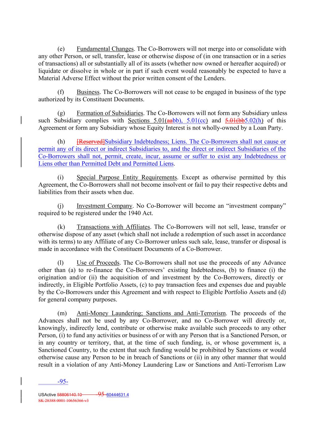 (e) Fundamental Changes. The Co‐Borrowers will not merge into or consolidate with any other Person, or sell, transfer, lease or otherwise dispose of (in one transaction or in a series of transactions) all or substantially all of its assets (whether now owned or hereafter acquired) or liquidate or dissolve in whole or in part if such event would reasonably be expected to have a Material Adverse Effect without the prior written consent of the Lenders. (f) Business. The Co‐Borrowers will not cease to be engaged in business of the type authorized by its Constituent Documents. (g) Formation of Subsidiaries. The Co‐Borrowers will not form any Subsidiary unless such Subsidiary complies with Sections 5.01(aabb), 5.01(cc) and 5.01(bb5.02(h) of this Agreement or form any Subsidiary whose Equity Interest is not wholly‐owned by a Loan Party. (h) [Reserved]Subsidiary Indebtedness; Liens. The Co-Borrowers shall not cause or permit any of its direct or indirect Subsidiaries to, and the direct or indirect Subsidiaries of the Co-Borrowers shall not, permit, create, incur, assume or suffer to exist any Indebtedness or Liens other than Permitted Debt and Permitted Liens. (i) Special Purpose Entity Requirements. Except as otherwise permitted by this Agreement, the Co‐Borrowers shall not become insolvent or fail to pay their respective debts and liabilities from their assets when due. (j) Investment Company. No Co‐Borrower will become an “investment company” required to be registered under the 1940 Act. (k) Transactions with Affiliates. The Co‐Borrowers will not sell, lease, transfer or otherwise dispose of any asset (which shall not include a redemption of such asset in accordance with its terms) to any Affiliate of any Co‐Borrower unless such sale, lease, transfer or disposal is made in accordance with the Constituent Documents of a Co‐Borrower. (l) Use of Proceeds. The Co‐Borrowers shall not use the proceeds of any Advance other than (a) to re‐finance the Co‐Borrowers’ existing Indebtedness, (b) to finance (i) the origination and/or (ii) the acquisition of and investment by the Co‐Borrowers, directly or indirectly, in Eligible Portfolio Assets, (c) to pay transaction fees and expenses due and payable by the Co‐Borrowers under this Agreement and with respect to Eligible Portfolio Assets and (d) for general company purposes. (m) Anti‐Money Laundering; Sanctions and Anti‐Terrorism. The proceeds of the Advances shall not be used by any Co‐Borrower, and no Co‐Borrower will directly or, knowingly, indirectly lend, contribute or otherwise make available such proceeds to any other Person, (i) to fund any activities or business of or with any Person that is a Sanctioned Person, or in any country or territory, that, at the time of such funding, is, or whose government is, a Sanctioned Country, to the extent that such funding would be prohibited by Sanctions or would otherwise cause any Person to be in breach of Sanctions or (ii) in any other manner that would result in a violation of any Anti‐Money Laundering Law or Sanctions and Anti‐Terrorism Law -95- USActive 58806140.10 -95-60444631.4 SK 28388 0001 10656366 v3