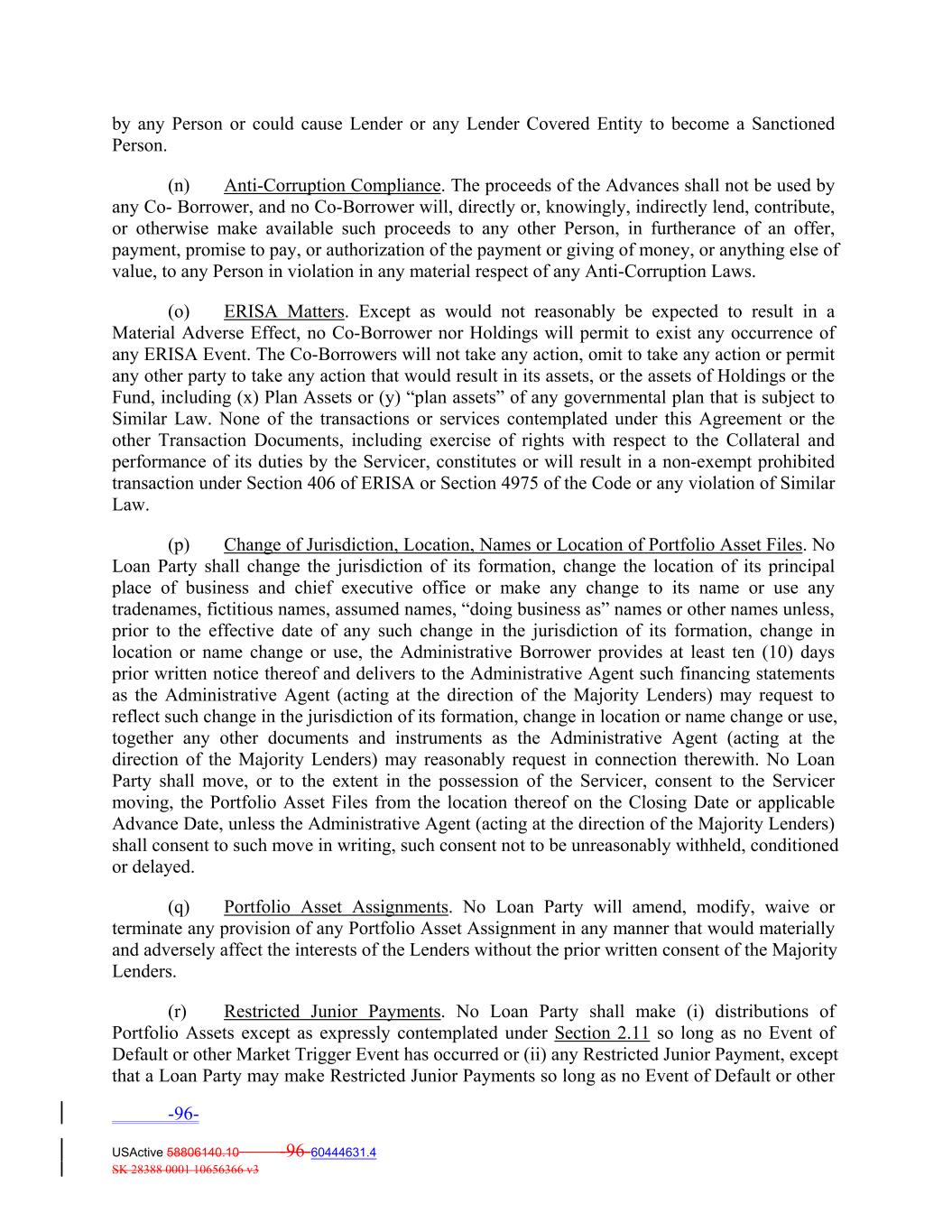 by any Person or could cause Lender or any Lender Covered Entity to become a Sanctioned Person. (n) Anti‐Corruption Compliance. The proceeds of the Advances shall not be used by any Co‐ Borrower, and no Co‐Borrower will, directly or, knowingly, indirectly lend, contribute, or otherwise make available such proceeds to any other Person, in furtherance of an offer, payment, promise to pay, or authorization of the payment or giving of money, or anything else of value, to any Person in violation in any material respect of any Anti‐Corruption Laws. (o) ERISA Matters. Except as would not reasonably be expected to result in a Material Adverse Effect, no Co‐Borrower nor Holdings will permit to exist any occurrence of any ERISA Event. The Co‐Borrowers will not take any action, omit to take any action or permit any other party to take any action that would result in its assets, or the assets of Holdings or the Fund, including (x) Plan Assets or (y) “plan assets” of any governmental plan that is subject to Similar Law. None of the transactions or services contemplated under this Agreement or the other Transaction Documents, including exercise of rights with respect to the Collateral and performance of its duties by the Servicer, constitutes or will result in a non‐exempt prohibited transaction under Section 406 of ERISA or Section 4975 of the Code or any violation of Similar Law. (p) Change of Jurisdiction, Location, Names or Location of Portfolio Asset Files. No Loan Party shall change the jurisdiction of its formation, change the location of its principal place of business and chief executive office or make any change to its name or use any tradenames, fictitious names, assumed names, “doing business as” names or other names unless, prior to the effective date of any such change in the jurisdiction of its formation, change in location or name change or use, the Administrative Borrower provides at least ten (10) days prior written notice thereof and delivers to the Administrative Agent such financing statements as the Administrative Agent (acting at the direction of the Majority Lenders) may request to reflect such change in the jurisdiction of its formation, change in location or name change or use, together any other documents and instruments as the Administrative Agent (acting at the direction of the Majority Lenders) may reasonably request in connection therewith. No Loan Party shall move, or to the extent in the possession of the Servicer, consent to the Servicer moving, the Portfolio Asset Files from the location thereof on the Closing Date or applicable Advance Date, unless the Administrative Agent (acting at the direction of the Majority Lenders) shall consent to such move in writing, such consent not to be unreasonably withheld, conditioned or delayed. (q) Portfolio Asset Assignments. No Loan Party will amend, modify, waive or terminate any provision of any Portfolio Asset Assignment in any manner that would materially and adversely affect the interests of the Lenders without the prior written consent of the Majority Lenders. (r) Restricted Junior Payments. No Loan Party shall make (i) distributions of Portfolio Assets except as expressly contemplated under Section 2.11 so long as no Event of Default or other Market Trigger Event has occurred or (ii) any Restricted Junior Payment, except that a Loan Party may make Restricted Junior Payments so long as no Event of Default or other -96- USActive 58806140.10 -96-60444631.4 SK 28388 0001 10656366 v3