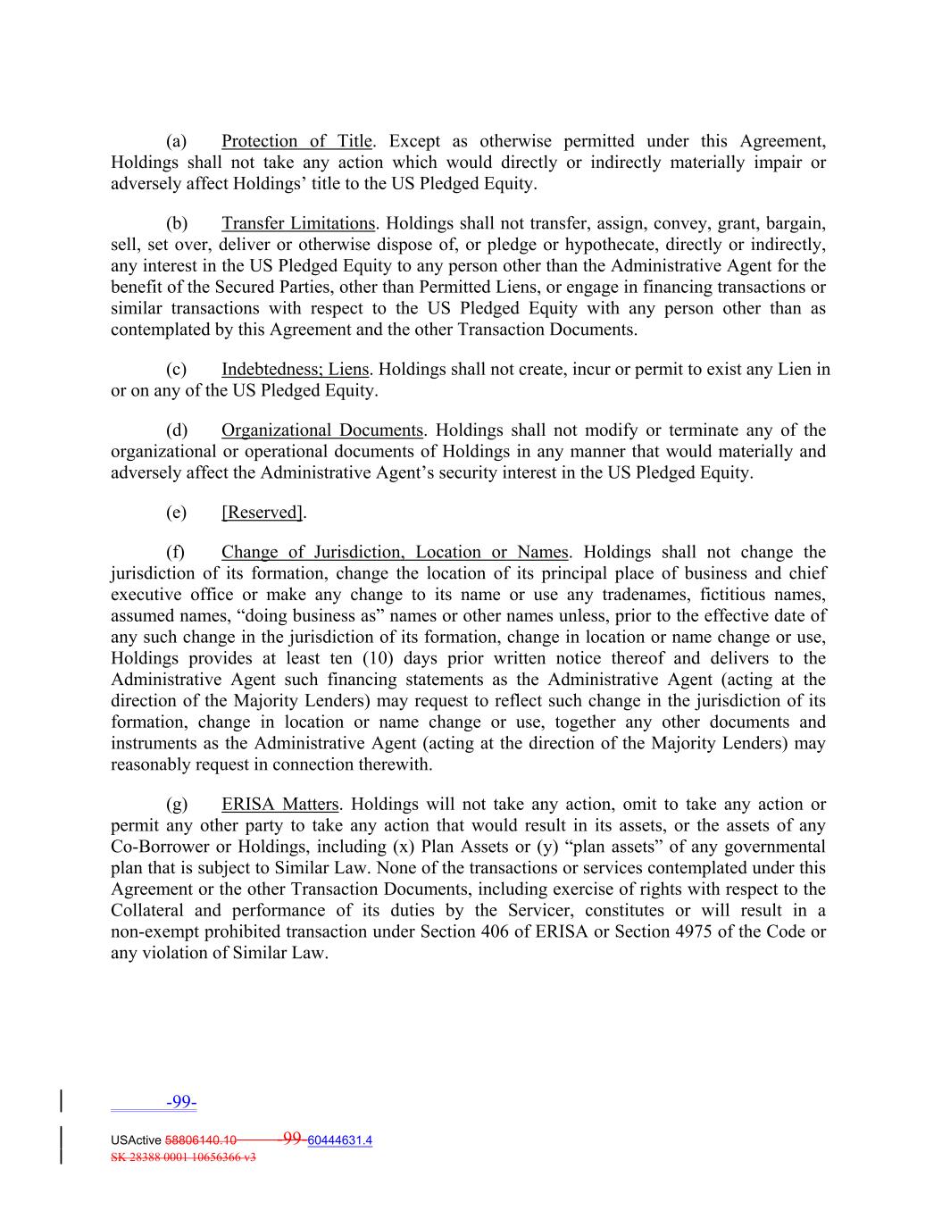 (a) Protection of Title. Except as otherwise permitted under this Agreement, Holdings shall not take any action which would directly or indirectly materially impair or adversely affect Holdings’ title to the US Pledged Equity. (b) Transfer Limitations. Holdings shall not transfer, assign, convey, grant, bargain, sell, set over, deliver or otherwise dispose of, or pledge or hypothecate, directly or indirectly, any interest in the US Pledged Equity to any person other than the Administrative Agent for the benefit of the Secured Parties, other than Permitted Liens, or engage in financing transactions or similar transactions with respect to the US Pledged Equity with any person other than as contemplated by this Agreement and the other Transaction Documents. (c) Indebtedness; Liens. Holdings shall not create, incur or permit to exist any Lien in or on any of the US Pledged Equity. (d) Organizational Documents. Holdings shall not modify or terminate any of the organizational or operational documents of Holdings in any manner that would materially and adversely affect the Administrative Agent’s security interest in the US Pledged Equity. (e) [Reserved]. (f) Change of Jurisdiction, Location or Names. Holdings shall not change the jurisdiction of its formation, change the location of its principal place of business and chief executive office or make any change to its name or use any tradenames, fictitious names, assumed names, “doing business as” names or other names unless, prior to the effective date of any such change in the jurisdiction of its formation, change in location or name change or use, Holdings provides at least ten (10) days prior written notice thereof and delivers to the Administrative Agent such financing statements as the Administrative Agent (acting at the direction of the Majority Lenders) may request to reflect such change in the jurisdiction of its formation, change in location or name change or use, together any other documents and instruments as the Administrative Agent (acting at the direction of the Majority Lenders) may reasonably request in connection therewith. (g) ERISA Matters. Holdings will not take any action, omit to take any action or permit any other party to take any action that would result in its assets, or the assets of any Co‐Borrower or Holdings, including (x) Plan Assets or (y) “plan assets” of any governmental plan that is subject to Similar Law. None of the transactions or services contemplated under this Agreement or the other Transaction Documents, including exercise of rights with respect to the Collateral and performance of its duties by the Servicer, constitutes or will result in a non‐exempt prohibited transaction under Section 406 of ERISA or Section 4975 of the Code or any violation of Similar Law. -99- USActive 58806140.10 -99-60444631.4 SK 28388 0001 10656366 v3