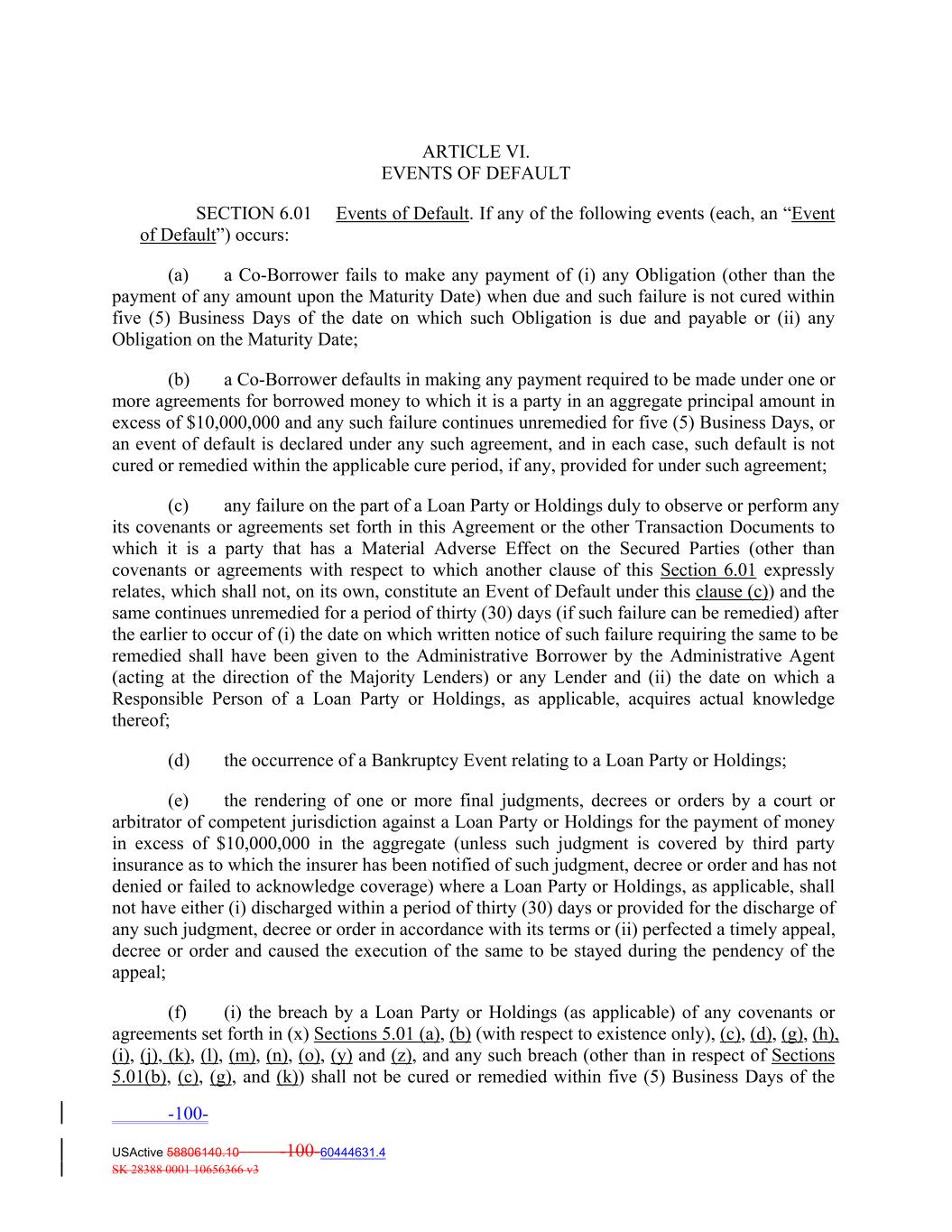 ARTICLE VI. EVENTS OF DEFAULT SECTION 6.01 Events of Default. If any of the following events (each, an “Event of Default”) occurs: (a) a Co‐Borrower fails to make any payment of (i) any Obligation (other than the payment of any amount upon the Maturity Date) when due and such failure is not cured within five (5) Business Days of the date on which such Obligation is due and payable or (ii) any Obligation on the Maturity Date; (b) a Co‐Borrower defaults in making any payment required to be made under one or more agreements for borrowed money to which it is a party in an aggregate principal amount in excess of $10,000,000 and any such failure continues unremedied for five (5) Business Days, or an event of default is declared under any such agreement, and in each case, such default is not cured or remedied within the applicable cure period, if any, provided for under such agreement; (c) any failure on the part of a Loan Party or Holdings duly to observe or perform any its covenants or agreements set forth in this Agreement or the other Transaction Documents to which it is a party that has a Material Adverse Effect on the Secured Parties (other than covenants or agreements with respect to which another clause of this Section 6.01 expressly relates, which shall not, on its own, constitute an Event of Default under this clause (c)) and the same continues unremedied for a period of thirty (30) days (if such failure can be remedied) after the earlier to occur of (i) the date on which written notice of such failure requiring the same to be remedied shall have been given to the Administrative Borrower by the Administrative Agent (acting at the direction of the Majority Lenders) or any Lender and (ii) the date on which a Responsible Person of a Loan Party or Holdings, as applicable, acquires actual knowledge thereof; (d) the occurrence of a Bankruptcy Event relating to a Loan Party or Holdings; (e) the rendering of one or more final judgments, decrees or orders by a court or arbitrator of competent jurisdiction against a Loan Party or Holdings for the payment of money in excess of $10,000,000 in the aggregate (unless such judgment is covered by third party insurance as to which the insurer has been notified of such judgment, decree or order and has not denied or failed to acknowledge coverage) where a Loan Party or Holdings, as applicable, shall not have either (i) discharged within a period of thirty (30) days or provided for the discharge of any such judgment, decree or order in accordance with its terms or (ii) perfected a timely appeal, decree or order and caused the execution of the same to be stayed during the pendency of the appeal; (f) (i) the breach by a Loan Party or Holdings (as applicable) of any covenants or agreements set forth in (x) Sections 5.01 (a), (b) (with respect to existence only), (c), (d), (g), (h), (i), (j), (k), (l), (m), (n), (o), (y) and (z), and any such breach (other than in respect of Sections 5.01(b), (c), (g), and (k)) shall not be cured or remedied within five (5) Business Days of the -100- USActive 58806140.10 -100-60444631.4 SK 28388 0001 10656366 v3