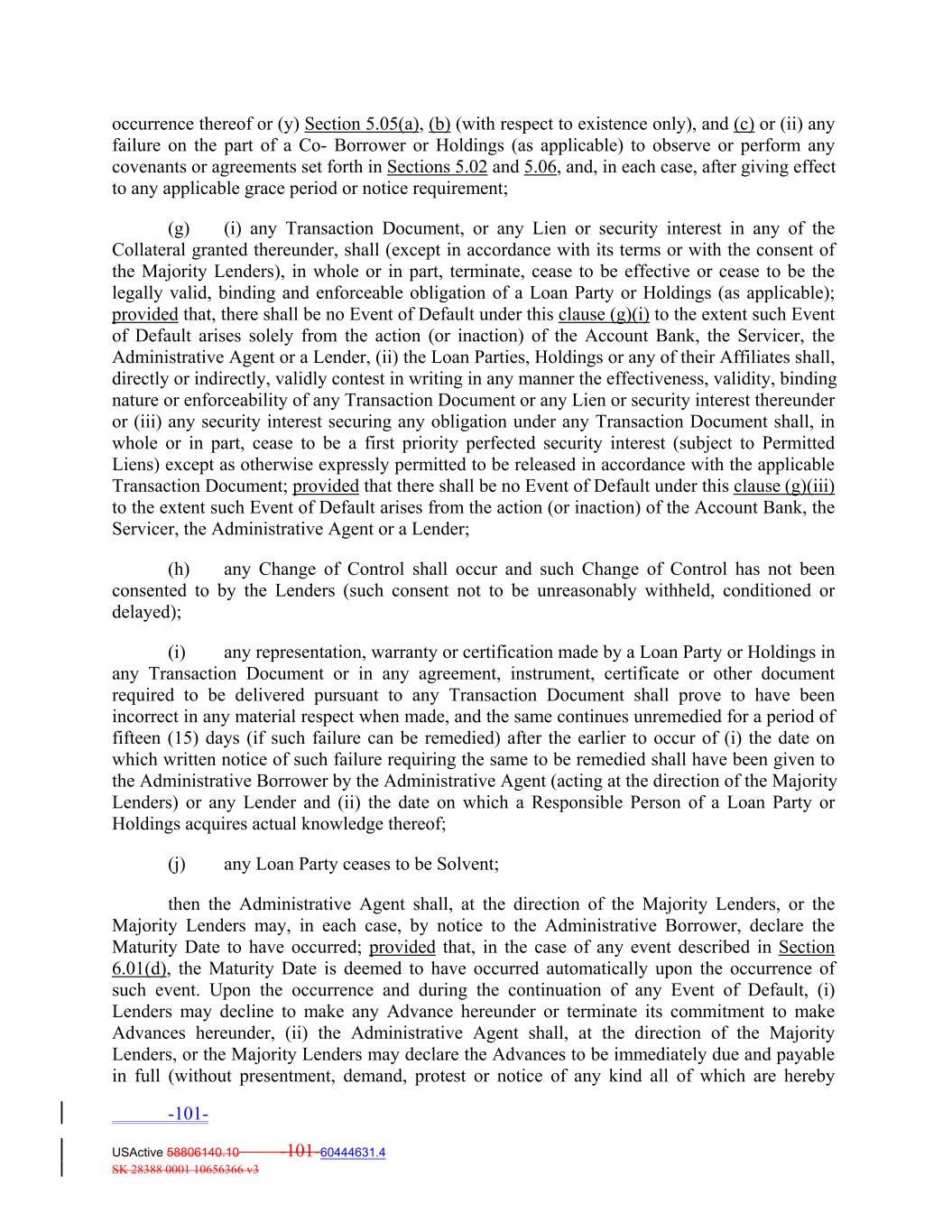 occurrence thereof or (y) Section 5.05(a), (b) (with respect to existence only), and (c) or (ii) any failure on the part of a Co‐ Borrower or Holdings (as applicable) to observe or perform any covenants or agreements set forth in Sections 5.02 and 5.06, and, in each case, after giving effect to any applicable grace period or notice requirement; (g) (i) any Transaction Document, or any Lien or security interest in any of the Collateral granted thereunder, shall (except in accordance with its terms or with the consent of the Majority Lenders), in whole or in part, terminate, cease to be effective or cease to be the legally valid, binding and enforceable obligation of a Loan Party or Holdings (as applicable); provided that, there shall be no Event of Default under this clause (g)(i) to the extent such Event of Default arises solely from the action (or inaction) of the Account Bank, the Servicer, the Administrative Agent or a Lender, (ii) the Loan Parties, Holdings or any of their Affiliates shall, directly or indirectly, validly contest in writing in any manner the effectiveness, validity, binding nature or enforceability of any Transaction Document or any Lien or security interest thereunder or (iii) any security interest securing any obligation under any Transaction Document shall, in whole or in part, cease to be a first priority perfected security interest (subject to Permitted Liens) except as otherwise expressly permitted to be released in accordance with the applicable Transaction Document; provided that there shall be no Event of Default under this clause (g)(iii) to the extent such Event of Default arises from the action (or inaction) of the Account Bank, the Servicer, the Administrative Agent or a Lender; (h) any Change of Control shall occur and such Change of Control has not been consented to by the Lenders (such consent not to be unreasonably withheld, conditioned or delayed); (i) any representation, warranty or certification made by a Loan Party or Holdings in any Transaction Document or in any agreement, instrument, certificate or other document required to be delivered pursuant to any Transaction Document shall prove to have been incorrect in any material respect when made, and the same continues unremedied for a period of fifteen (15) days (if such failure can be remedied) after the earlier to occur of (i) the date on which written notice of such failure requiring the same to be remedied shall have been given to the Administrative Borrower by the Administrative Agent (acting at the direction of the Majority Lenders) or any Lender and (ii) the date on which a Responsible Person of a Loan Party or Holdings acquires actual knowledge thereof; (j) any Loan Party ceases to be Solvent; then the Administrative Agent shall, at the direction of the Majority Lenders, or the Majority Lenders may, in each case, by notice to the Administrative Borrower, declare the Maturity Date to have occurred; provided that, in the case of any event described in Section 6.01(d), the Maturity Date is deemed to have occurred automatically upon the occurrence of such event. Upon the occurrence and during the continuation of any Event of Default, (i) Lenders may decline to make any Advance hereunder or terminate its commitment to make Advances hereunder, (ii) the Administrative Agent shall, at the direction of the Majority Lenders, or the Majority Lenders may declare the Advances to be immediately due and payable in full (without presentment, demand, protest or notice of any kind all of which are hereby -101- USActive 58806140.10 -101-60444631.4 SK 28388 0001 10656366 v3