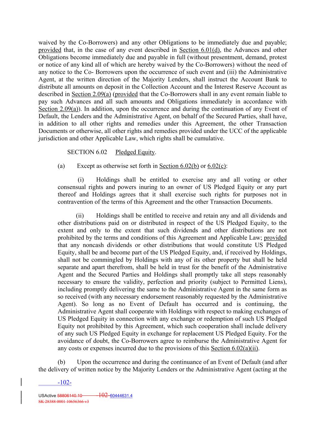 waived by the Co‐Borrowers) and any other Obligations to be immediately due and payable; provided that, in the case of any event described in Section 6.01(d), the Advances and other Obligations become immediately due and payable in full (without presentment, demand, protest or notice of any kind all of which are hereby waived by the Co‐Borrowers) without the need of any notice to the Co‐ Borrowers upon the occurrence of such event and (iii) the Administrative Agent, at the written direction of the Majority Lenders, shall instruct the Account Bank to distribute all amounts on deposit in the Collection Account and the Interest Reserve Account as described in Section 2.09(a) (provided that the Co‐Borrowers shall in any event remain liable to pay such Advances and all such amounts and Obligations immediately in accordance with Section 2.09(a)). In addition, upon the occurrence and during the continuation of any Event of Default, the Lenders and the Administrative Agent, on behalf of the Secured Parties, shall have, in addition to all other rights and remedies under this Agreement, the other Transaction Documents or otherwise, all other rights and remedies provided under the UCC of the applicable jurisdiction and other Applicable Law, which rights shall be cumulative. SECTION 6.02 Pledged Equity. (a) Except as otherwise set forth in Section 6.02(b) or 6.02(c): (i) Holdings shall be entitled to exercise any and all voting or other consensual rights and powers inuring to an owner of US Pledged Equity or any part thereof and Holdings agrees that it shall exercise such rights for purposes not in contravention of the terms of this Agreement and the other Transaction Documents. (ii) Holdings shall be entitled to receive and retain any and all dividends and other distributions paid on or distributed in respect of the US Pledged Equity, to the extent and only to the extent that such dividends and other distributions are not prohibited by the terms and conditions of this Agreement and Applicable Law; provided that any noncash dividends or other distributions that would constitute US Pledged Equity, shall be and become part of the US Pledged Equity, and, if received by Holdings, shall not be commingled by Holdings with any of its other property but shall be held separate and apart therefrom, shall be held in trust for the benefit of the Administrative Agent and the Secured Parties and Holdings shall promptly take all steps reasonably necessary to ensure the validity, perfection and priority (subject to Permitted Liens), including promptly delivering the same to the Administrative Agent in the same form as so received (with any necessary endorsement reasonably requested by the Administrative Agent). So long as no Event of Default has occurred and is continuing, the Administrative Agent shall cooperate with Holdings with respect to making exchanges of US Pledged Equity in connection with any exchange or redemption of such US Pledged Equity not prohibited by this Agreement, which such cooperation shall include delivery of any such US Pledged Equity in exchange for replacement US Pledged Equity. For the avoidance of doubt, the Co‐Borrowers agree to reimburse the Administrative Agent for any costs or expenses incurred due to the provisions of this Section 6.02(a)(ii). (b) Upon the occurrence and during the continuance of an Event of Default (and after the delivery of written notice by the Majority Lenders or the Administrative Agent (acting at the -102- USActive 58806140.10 -102-60444631.4 SK 28388 0001 10656366 v3