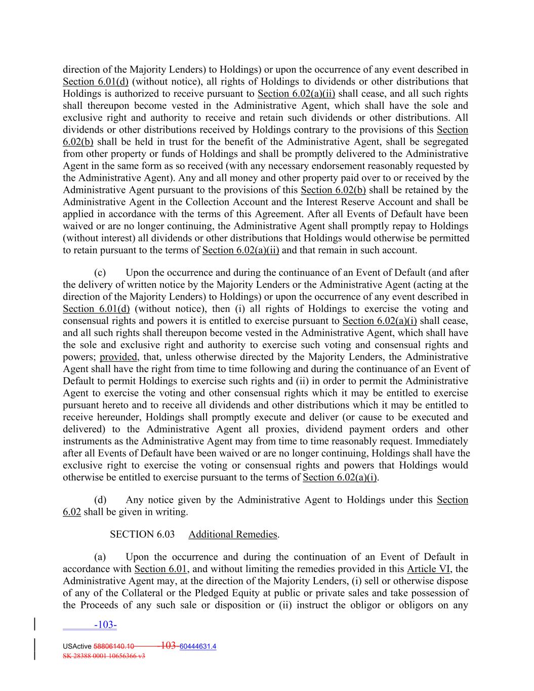 direction of the Majority Lenders) to Holdings) or upon the occurrence of any event described in Section 6.01(d) (without notice), all rights of Holdings to dividends or other distributions that Holdings is authorized to receive pursuant to Section 6.02(a)(ii) shall cease, and all such rights shall thereupon become vested in the Administrative Agent, which shall have the sole and exclusive right and authority to receive and retain such dividends or other distributions. All dividends or other distributions received by Holdings contrary to the provisions of this Section 6.02(b) shall be held in trust for the benefit of the Administrative Agent, shall be segregated from other property or funds of Holdings and shall be promptly delivered to the Administrative Agent in the same form as so received (with any necessary endorsement reasonably requested by the Administrative Agent). Any and all money and other property paid over to or received by the Administrative Agent pursuant to the provisions of this Section 6.02(b) shall be retained by the Administrative Agent in the Collection Account and the Interest Reserve Account and shall be applied in accordance with the terms of this Agreement. After all Events of Default have been waived or are no longer continuing, the Administrative Agent shall promptly repay to Holdings (without interest) all dividends or other distributions that Holdings would otherwise be permitted to retain pursuant to the terms of Section 6.02(a)(ii) and that remain in such account. (c) Upon the occurrence and during the continuance of an Event of Default (and after the delivery of written notice by the Majority Lenders or the Administrative Agent (acting at the direction of the Majority Lenders) to Holdings) or upon the occurrence of any event described in Section 6.01(d) (without notice), then (i) all rights of Holdings to exercise the voting and consensual rights and powers it is entitled to exercise pursuant to Section 6.02(a)(i) shall cease, and all such rights shall thereupon become vested in the Administrative Agent, which shall have the sole and exclusive right and authority to exercise such voting and consensual rights and powers; provided, that, unless otherwise directed by the Majority Lenders, the Administrative Agent shall have the right from time to time following and during the continuance of an Event of Default to permit Holdings to exercise such rights and (ii) in order to permit the Administrative Agent to exercise the voting and other consensual rights which it may be entitled to exercise pursuant hereto and to receive all dividends and other distributions which it may be entitled to receive hereunder, Holdings shall promptly execute and deliver (or cause to be executed and delivered) to the Administrative Agent all proxies, dividend payment orders and other instruments as the Administrative Agent may from time to time reasonably request. Immediately after all Events of Default have been waived or are no longer continuing, Holdings shall have the exclusive right to exercise the voting or consensual rights and powers that Holdings would otherwise be entitled to exercise pursuant to the terms of Section 6.02(a)(i). (d) Any notice given by the Administrative Agent to Holdings under this Section 6.02 shall be given in writing. SECTION 6.03 Additional Remedies. (a) Upon the occurrence and during the continuation of an Event of Default in accordance with Section 6.01, and without limiting the remedies provided in this Article VI, the Administrative Agent may, at the direction of the Majority Lenders, (i) sell or otherwise dispose of any of the Collateral or the Pledged Equity at public or private sales and take possession of the Proceeds of any such sale or disposition or (ii) instruct the obligor or obligors on any -103- USActive 58806140.10 -103-60444631.4 SK 28388 0001 10656366 v3