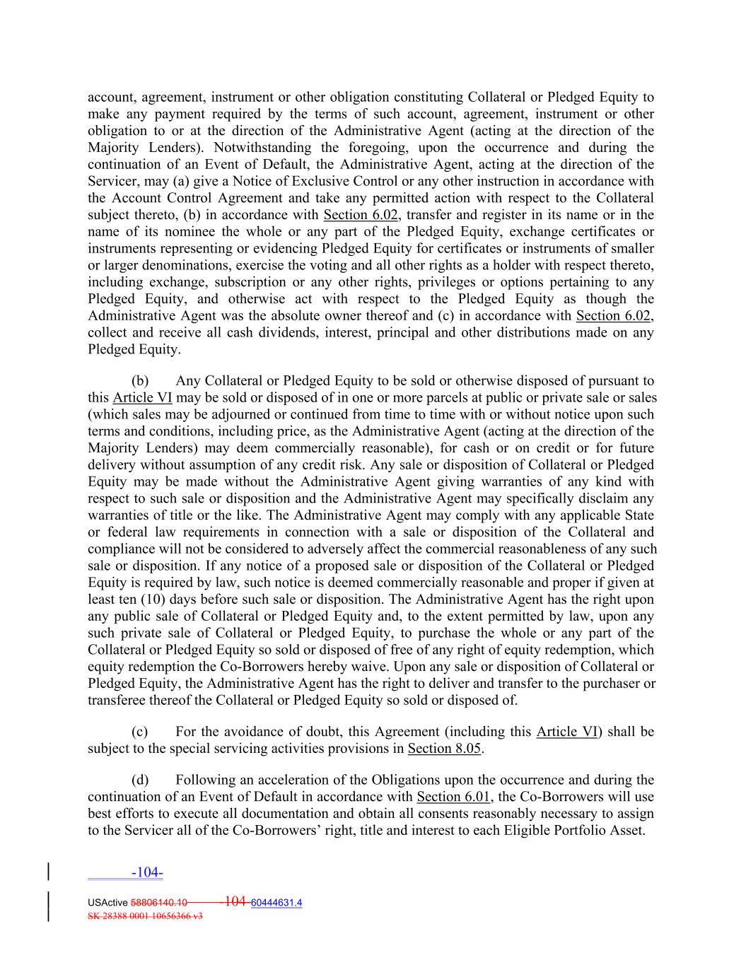 account, agreement, instrument or other obligation constituting Collateral or Pledged Equity to make any payment required by the terms of such account, agreement, instrument or other obligation to or at the direction of the Administrative Agent (acting at the direction of the Majority Lenders). Notwithstanding the foregoing, upon the occurrence and during the continuation of an Event of Default, the Administrative Agent, acting at the direction of the Servicer, may (a) give a Notice of Exclusive Control or any other instruction in accordance with the Account Control Agreement and take any permitted action with respect to the Collateral subject thereto, (b) in accordance with Section 6.02, transfer and register in its name or in the name of its nominee the whole or any part of the Pledged Equity, exchange certificates or instruments representing or evidencing Pledged Equity for certificates or instruments of smaller or larger denominations, exercise the voting and all other rights as a holder with respect thereto, including exchange, subscription or any other rights, privileges or options pertaining to any Pledged Equity, and otherwise act with respect to the Pledged Equity as though the Administrative Agent was the absolute owner thereof and (c) in accordance with Section 6.02, collect and receive all cash dividends, interest, principal and other distributions made on any Pledged Equity. (b) Any Collateral or Pledged Equity to be sold or otherwise disposed of pursuant to this Article VI may be sold or disposed of in one or more parcels at public or private sale or sales (which sales may be adjourned or continued from time to time with or without notice upon such terms and conditions, including price, as the Administrative Agent (acting at the direction of the Majority Lenders) may deem commercially reasonable), for cash or on credit or for future delivery without assumption of any credit risk. Any sale or disposition of Collateral or Pledged Equity may be made without the Administrative Agent giving warranties of any kind with respect to such sale or disposition and the Administrative Agent may specifically disclaim any warranties of title or the like. The Administrative Agent may comply with any applicable State or federal law requirements in connection with a sale or disposition of the Collateral and compliance will not be considered to adversely affect the commercial reasonableness of any such sale or disposition. If any notice of a proposed sale or disposition of the Collateral or Pledged Equity is required by law, such notice is deemed commercially reasonable and proper if given at least ten (10) days before such sale or disposition. The Administrative Agent has the right upon any public sale of Collateral or Pledged Equity and, to the extent permitted by law, upon any such private sale of Collateral or Pledged Equity, to purchase the whole or any part of the Collateral or Pledged Equity so sold or disposed of free of any right of equity redemption, which equity redemption the Co‐Borrowers hereby waive. Upon any sale or disposition of Collateral or Pledged Equity, the Administrative Agent has the right to deliver and transfer to the purchaser or transferee thereof the Collateral or Pledged Equity so sold or disposed of. (c) For the avoidance of doubt, this Agreement (including this Article VI) shall be subject to the special servicing activities provisions in Section 8.05. (d) Following an acceleration of the Obligations upon the occurrence and during the continuation of an Event of Default in accordance with Section 6.01, the Co‐Borrowers will use best efforts to execute all documentation and obtain all consents reasonably necessary to assign to the Servicer all of the Co‐Borrowers’ right, title and interest to each Eligible Portfolio Asset. -104- USActive 58806140.10 -104-60444631.4 SK 28388 0001 10656366 v3