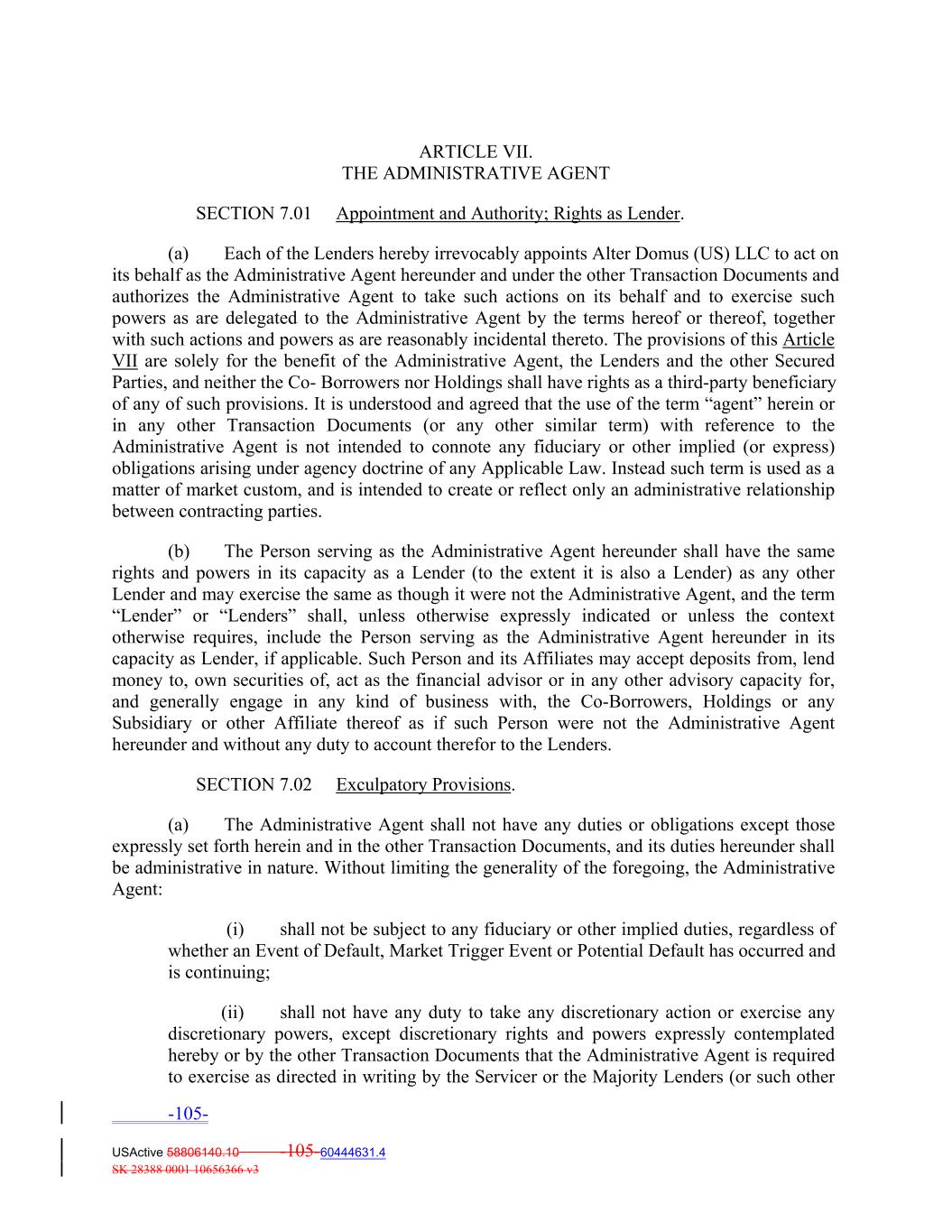 ARTICLE VII. THE ADMINISTRATIVE AGENT SECTION 7.01 Appointment and Authority; Rights as Lender. (a) Each of the Lenders hereby irrevocably appoints Alter Domus (US) LLC to act on its behalf as the Administrative Agent hereunder and under the other Transaction Documents and authorizes the Administrative Agent to take such actions on its behalf and to exercise such powers as are delegated to the Administrative Agent by the terms hereof or thereof, together with such actions and powers as are reasonably incidental thereto. The provisions of this Article VII are solely for the benefit of the Administrative Agent, the Lenders and the other Secured Parties, and neither the Co‐ Borrowers nor Holdings shall have rights as a third‐party beneficiary of any of such provisions. It is understood and agreed that the use of the term “agent” herein or in any other Transaction Documents (or any other similar term) with reference to the Administrative Agent is not intended to connote any fiduciary or other implied (or express) obligations arising under agency doctrine of any Applicable Law. Instead such term is used as a matter of market custom, and is intended to create or reflect only an administrative relationship between contracting parties. (b) The Person serving as the Administrative Agent hereunder shall have the same rights and powers in its capacity as a Lender (to the extent it is also a Lender) as any other Lender and may exercise the same as though it were not the Administrative Agent, and the term “Lender” or “Lenders” shall, unless otherwise expressly indicated or unless the context otherwise requires, include the Person serving as the Administrative Agent hereunder in its capacity as Lender, if applicable. Such Person and its Affiliates may accept deposits from, lend money to, own securities of, act as the financial advisor or in any other advisory capacity for, and generally engage in any kind of business with, the Co‐Borrowers, Holdings or any Subsidiary or other Affiliate thereof as if such Person were not the Administrative Agent hereunder and without any duty to account therefor to the Lenders. SECTION 7.02 Exculpatory Provisions. (a) The Administrative Agent shall not have any duties or obligations except those expressly set forth herein and in the other Transaction Documents, and its duties hereunder shall be administrative in nature. Without limiting the generality of the foregoing, the Administrative Agent: (i) shall not be subject to any fiduciary or other implied duties, regardless of whether an Event of Default, Market Trigger Event or Potential Default has occurred and is continuing; (ii) shall not have any duty to take any discretionary action or exercise any discretionary powers, except discretionary rights and powers expressly contemplated hereby or by the other Transaction Documents that the Administrative Agent is required to exercise as directed in writing by the Servicer or the Majority Lenders (or such other -105- USActive 58806140.10 -105-60444631.4 SK 28388 0001 10656366 v3