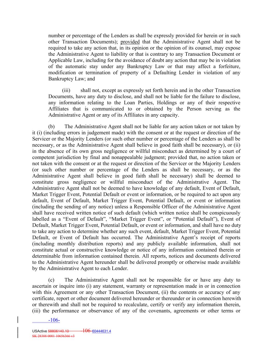 number or percentage of the Lenders as shall be expressly provided for herein or in such other Transaction Documents); provided that the Administrative Agent shall not be required to take any action that, in its opinion or the opinion of its counsel, may expose the Administrative Agent to liability or that is contrary to any Transaction Document or Applicable Law, including for the avoidance of doubt any action that may be in violation of the automatic stay under any Bankruptcy Law or that may affect a forfeiture, modification or termination of property of a Defaulting Lender in violation of any Bankruptcy Law; and (iii) shall not, except as expressly set forth herein and in the other Transaction Documents, have any duty to disclose, and shall not be liable for the failure to disclose, any information relating to the Loan Parties, Holdings or any of their respective Affiliates that is communicated to or obtained by the Person serving as the Administrative Agent or any of its Affiliates in any capacity. (b) The Administrative Agent shall not be liable for any action taken or not taken by it (i) (including errors in judgement made) with the consent or at the request or direction of the Servicer or the Majority Lenders (or such other number or percentage of the Lenders as shall be necessary, or as the Administrative Agent shall believe in good faith shall be necessary), or (ii) in the absence of its own gross negligence or willful misconduct as determined by a court of competent jurisdiction by final and nonappealable judgment; provided that, no action taken or not taken with the consent or at the request or direction of the Servicer or the Majority Lenders (or such other number or percentage of the Lenders as shall be necessary, or as the Administrative Agent shall believe in good faith shall be necessary) shall be deemed to constitute gross negligence or willful misconduct of the Administrative Agent. The Administrative Agent shall not be deemed to have knowledge of any default, Event of Default, Market Trigger Event, Potential Default or event or information, or be required to act upon any default, Event of Default, Market Trigger Event, Potential Default, or event or information (including the sending of any notice) unless a Responsible Officer of the Administrative Agent shall have received written notice of such default (which written notice shall be conspicuously labelled as a “Event of Default”, “Market Trigger Event”, or “Potential Default”), Event of Default, Market Trigger Event, Potential Default, or event or information, and shall have no duty to take any action to determine whether any such event, default, Market Trigger Event, Potential Default, or Event of Default has occurred. The Administrative Agent’s receipt of reports (including monthly distribution reports) and any publicly available information, shall not constitute actual or constructive knowledge or notice of any information contained therein or determinable from information contained therein. All reports, notices and documents delivered to the Administrative Agent hereunder shall be delivered promptly or otherwise made available by the Administrative Agent to each Lender. (c) The Administrative Agent shall not be responsible for or have any duty to ascertain or inquire into (i) any statement, warranty or representation made in or in connection with this Agreement or any other Transaction Document, (ii) the contents or accuracy of any certificate, report or other document delivered hereunder or thereunder or in connection herewith or therewith and shall not be required to recalculate, certify or verify any information therein, (iii) the performance or observance of any of the covenants, agreements or other terms or -106- USActive 58806140.10 -106-60444631.4 SK 28388 0001 10656366 v3