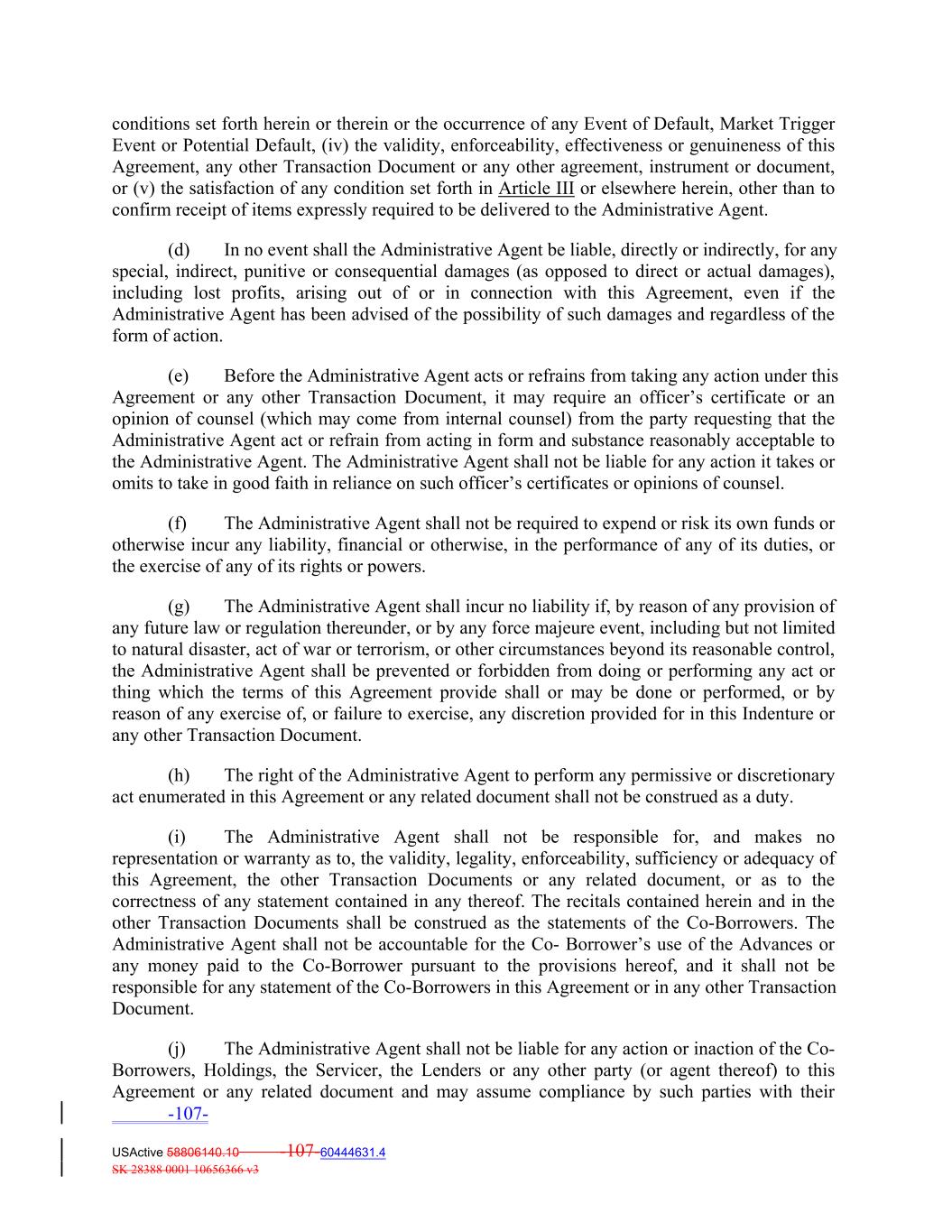 conditions set forth herein or therein or the occurrence of any Event of Default, Market Trigger Event or Potential Default, (iv) the validity, enforceability, effectiveness or genuineness of this Agreement, any other Transaction Document or any other agreement, instrument or document, or (v) the satisfaction of any condition set forth in Article III or elsewhere herein, other than to confirm receipt of items expressly required to be delivered to the Administrative Agent. (d) In no event shall the Administrative Agent be liable, directly or indirectly, for any special, indirect, punitive or consequential damages (as opposed to direct or actual damages), including lost profits, arising out of or in connection with this Agreement, even if the Administrative Agent has been advised of the possibility of such damages and regardless of the form of action. (e) Before the Administrative Agent acts or refrains from taking any action under this Agreement or any other Transaction Document, it may require an officer’s certificate or an opinion of counsel (which may come from internal counsel) from the party requesting that the Administrative Agent act or refrain from acting in form and substance reasonably acceptable to the Administrative Agent. The Administrative Agent shall not be liable for any action it takes or omits to take in good faith in reliance on such officer’s certificates or opinions of counsel. (f) The Administrative Agent shall not be required to expend or risk its own funds or otherwise incur any liability, financial or otherwise, in the performance of any of its duties, or the exercise of any of its rights or powers. (g) The Administrative Agent shall incur no liability if, by reason of any provision of any future law or regulation thereunder, or by any force majeure event, including but not limited to natural disaster, act of war or terrorism, or other circumstances beyond its reasonable control, the Administrative Agent shall be prevented or forbidden from doing or performing any act or thing which the terms of this Agreement provide shall or may be done or performed, or by reason of any exercise of, or failure to exercise, any discretion provided for in this Indenture or any other Transaction Document. (h) The right of the Administrative Agent to perform any permissive or discretionary act enumerated in this Agreement or any related document shall not be construed as a duty. (i) The Administrative Agent shall not be responsible for, and makes no representation or warranty as to, the validity, legality, enforceability, sufficiency or adequacy of this Agreement, the other Transaction Documents or any related document, or as to the correctness of any statement contained in any thereof. The recitals contained herein and in the other Transaction Documents shall be construed as the statements of the Co‐Borrowers. The Administrative Agent shall not be accountable for the Co‐ Borrower’s use of the Advances or any money paid to the Co‐Borrower pursuant to the provisions hereof, and it shall not be responsible for any statement of the Co‐Borrowers in this Agreement or in any other Transaction Document. (j) The Administrative Agent shall not be liable for any action or inaction of the Co‐ Borrowers, Holdings, the Servicer, the Lenders or any other party (or agent thereof) to this Agreement or any related document and may assume compliance by such parties with their -107- USActive 58806140.10 -107-60444631.4 SK 28388 0001 10656366 v3