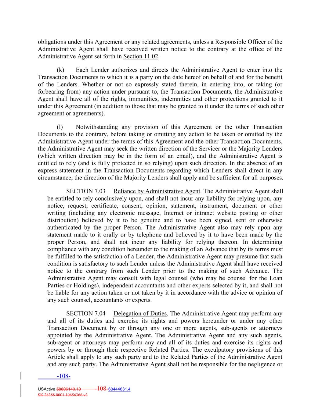obligations under this Agreement or any related agreements, unless a Responsible Officer of the Administrative Agent shall have received written notice to the contrary at the office of the Administrative Agent set forth in Section 11.02. (k) Each Lender authorizes and directs the Administrative Agent to enter into the Transaction Documents to which it is a party on the date hereof on behalf of and for the benefit of the Lenders. Whether or not so expressly stated therein, in entering into, or taking (or forbearing from) any action under pursuant to, the Transaction Documents, the Administrative Agent shall have all of the rights, immunities, indemnities and other protections granted to it under this Agreement (in addition to those that may be granted to it under the terms of such other agreement or agreements). (l) Notwithstanding any provision of this Agreement or the other Transaction Documents to the contrary, before taking or omitting any action to be taken or omitted by the Administrative Agent under the terms of this Agreement and the other Transaction Documents, the Administrative Agent may seek the written direction of the Servicer or the Majority Lenders (which written direction may be in the form of an email), and the Administrative Agent is entitled to rely (and is fully protected in so relying) upon such direction. In the absence of an express statement in the Transaction Documents regarding which Lenders shall direct in any circumstance, the direction of the Majority Lenders shall apply and be sufficient for all purposes. SECTION 7.03 Reliance by Administrative Agent. The Administrative Agent shall be entitled to rely conclusively upon, and shall not incur any liability for relying upon, any notice, request, certificate, consent, opinion, statement, instrument, document or other writing (including any electronic message, Internet or intranet website posting or other distribution) believed by it to be genuine and to have been signed, sent or otherwise authenticated by the proper Person. The Administrative Agent also may rely upon any statement made to it orally or by telephone and believed by it to have been made by the proper Person, and shall not incur any liability for relying thereon. In determining compliance with any condition hereunder to the making of an Advance that by its terms must be fulfilled to the satisfaction of a Lender, the Administrative Agent may presume that such condition is satisfactory to such Lender unless the Administrative Agent shall have received notice to the contrary from such Lender prior to the making of such Advance. The Administrative Agent may consult with legal counsel (who may be counsel for the Loan Parties or Holdings), independent accountants and other experts selected by it, and shall not be liable for any action taken or not taken by it in accordance with the advice or opinion of any such counsel, accountants or experts. SECTION 7.04 Delegation of Duties. The Administrative Agent may perform any and all of its duties and exercise its rights and powers hereunder or under any other Transaction Document by or through any one or more agents, sub‐agents or attorneys appointed by the Administrative Agent. The Administrative Agent and any such agents, sub‐agent or attorneys may perform any and all of its duties and exercise its rights and powers by or through their respective Related Parties. The exculpatory provisions of this Article shall apply to any such party and to the Related Parties of the Administrative Agent and any such party. The Administrative Agent shall not be responsible for the negligence or -108- USActive 58806140.10 -108-60444631.4 SK 28388 0001 10656366 v3