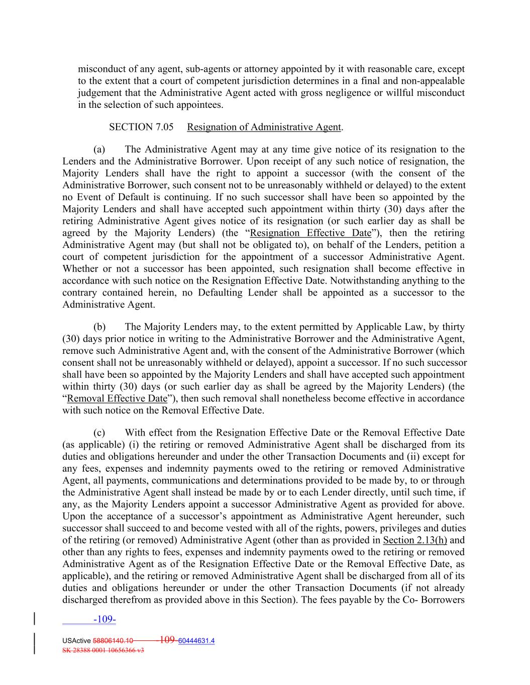 misconduct of any agent, sub‐agents or attorney appointed by it with reasonable care, except to the extent that a court of competent jurisdiction determines in a final and non‐appealable judgement that the Administrative Agent acted with gross negligence or willful misconduct in the selection of such appointees. SECTION 7.05 Resignation of Administrative Agent. (a) The Administrative Agent may at any time give notice of its resignation to the Lenders and the Administrative Borrower. Upon receipt of any such notice of resignation, the Majority Lenders shall have the right to appoint a successor (with the consent of the Administrative Borrower, such consent not to be unreasonably withheld or delayed) to the extent no Event of Default is continuing. If no such successor shall have been so appointed by the Majority Lenders and shall have accepted such appointment within thirty (30) days after the retiring Administrative Agent gives notice of its resignation (or such earlier day as shall be agreed by the Majority Lenders) (the “Resignation Effective Date”), then the retiring Administrative Agent may (but shall not be obligated to), on behalf of the Lenders, petition a court of competent jurisdiction for the appointment of a successor Administrative Agent. Whether or not a successor has been appointed, such resignation shall become effective in accordance with such notice on the Resignation Effective Date. Notwithstanding anything to the contrary contained herein, no Defaulting Lender shall be appointed as a successor to the Administrative Agent. (b) The Majority Lenders may, to the extent permitted by Applicable Law, by thirty (30) days prior notice in writing to the Administrative Borrower and the Administrative Agent, remove such Administrative Agent and, with the consent of the Administrative Borrower (which consent shall not be unreasonably withheld or delayed), appoint a successor. If no such successor shall have been so appointed by the Majority Lenders and shall have accepted such appointment within thirty (30) days (or such earlier day as shall be agreed by the Majority Lenders) (the “Removal Effective Date”), then such removal shall nonetheless become effective in accordance with such notice on the Removal Effective Date. (c) With effect from the Resignation Effective Date or the Removal Effective Date (as applicable) (i) the retiring or removed Administrative Agent shall be discharged from its duties and obligations hereunder and under the other Transaction Documents and (ii) except for any fees, expenses and indemnity payments owed to the retiring or removed Administrative Agent, all payments, communications and determinations provided to be made by, to or through the Administrative Agent shall instead be made by or to each Lender directly, until such time, if any, as the Majority Lenders appoint a successor Administrative Agent as provided for above. Upon the acceptance of a successor’s appointment as Administrative Agent hereunder, such successor shall succeed to and become vested with all of the rights, powers, privileges and duties of the retiring (or removed) Administrative Agent (other than as provided in Section 2.13(h) and other than any rights to fees, expenses and indemnity payments owed to the retiring or removed Administrative Agent as of the Resignation Effective Date or the Removal Effective Date, as applicable), and the retiring or removed Administrative Agent shall be discharged from all of its duties and obligations hereunder or under the other Transaction Documents (if not already discharged therefrom as provided above in this Section). The fees payable by the Co‐ Borrowers -109- USActive 58806140.10 -109-60444631.4 SK 28388 0001 10656366 v3