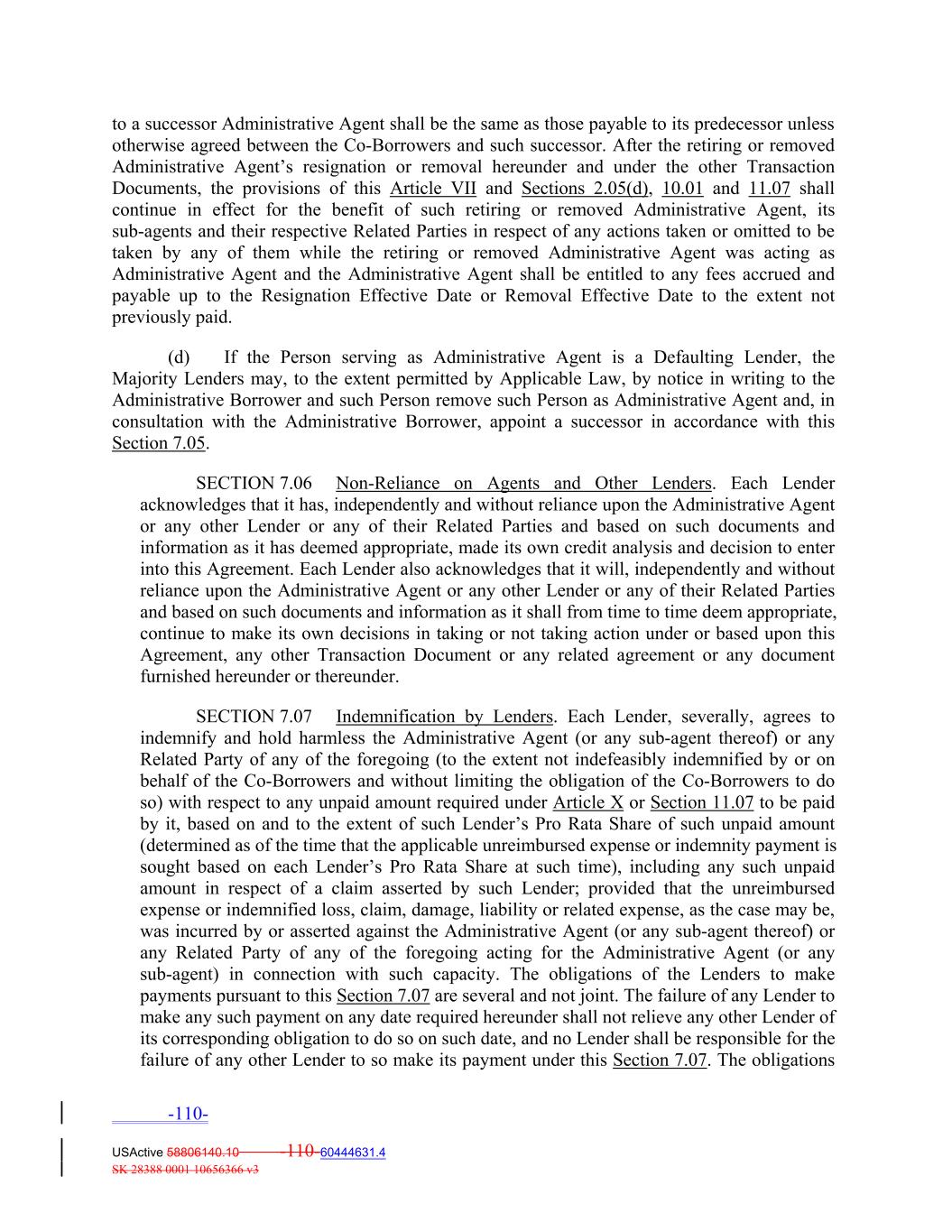 to a successor Administrative Agent shall be the same as those payable to its predecessor unless otherwise agreed between the Co‐Borrowers and such successor. After the retiring or removed Administrative Agent’s resignation or removal hereunder and under the other Transaction Documents, the provisions of this Article VII and Sections 2.05(d), 10.01 and 11.07 shall continue in effect for the benefit of such retiring or removed Administrative Agent, its sub‐agents and their respective Related Parties in respect of any actions taken or omitted to be taken by any of them while the retiring or removed Administrative Agent was acting as Administrative Agent and the Administrative Agent shall be entitled to any fees accrued and payable up to the Resignation Effective Date or Removal Effective Date to the extent not previously paid. (d) If the Person serving as Administrative Agent is a Defaulting Lender, the Majority Lenders may, to the extent permitted by Applicable Law, by notice in writing to the Administrative Borrower and such Person remove such Person as Administrative Agent and, in consultation with the Administrative Borrower, appoint a successor in accordance with this Section 7.05. SECTION 7.06 Non‐Reliance on Agents and Other Lenders. Each Lender acknowledges that it has, independently and without reliance upon the Administrative Agent or any other Lender or any of their Related Parties and based on such documents and information as it has deemed appropriate, made its own credit analysis and decision to enter into this Agreement. Each Lender also acknowledges that it will, independently and without reliance upon the Administrative Agent or any other Lender or any of their Related Parties and based on such documents and information as it shall from time to time deem appropriate, continue to make its own decisions in taking or not taking action under or based upon this Agreement, any other Transaction Document or any related agreement or any document furnished hereunder or thereunder. SECTION 7.07 Indemnification by Lenders. Each Lender, severally, agrees to indemnify and hold harmless the Administrative Agent (or any sub‐agent thereof) or any Related Party of any of the foregoing (to the extent not indefeasibly indemnified by or on behalf of the Co‐Borrowers and without limiting the obligation of the Co‐Borrowers to do so) with respect to any unpaid amount required under Article X or Section 11.07 to be paid by it, based on and to the extent of such Lender’s Pro Rata Share of such unpaid amount (determined as of the time that the applicable unreimbursed expense or indemnity payment is sought based on each Lender’s Pro Rata Share at such time), including any such unpaid amount in respect of a claim asserted by such Lender; provided that the unreimbursed expense or indemnified loss, claim, damage, liability or related expense, as the case may be, was incurred by or asserted against the Administrative Agent (or any sub‐agent thereof) or any Related Party of any of the foregoing acting for the Administrative Agent (or any sub‐agent) in connection with such capacity. The obligations of the Lenders to make payments pursuant to this Section 7.07 are several and not joint. The failure of any Lender to make any such payment on any date required hereunder shall not relieve any other Lender of its corresponding obligation to do so on such date, and no Lender shall be responsible for the failure of any other Lender to so make its payment under this Section 7.07. The obligations -110- USActive 58806140.10 -110-60444631.4 SK 28388 0001 10656366 v3