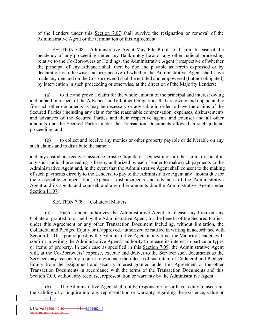 of the Lenders under this Section 7.07 shall survive the resignation or removal of the Administrative Agent or the termination of this Agreement. SECTION 7.08 Administrative Agent May File Proofs of Claim. In case of the pendency of any proceeding under any Bankruptcy Law or any other judicial proceeding relative to the Co‐Borrowers or Holdings, the Administrative Agent (irrespective of whether the principal of any Advance shall then be due and payable as herein expressed or by declaration or otherwise and irrespective of whether the Administrative Agent shall have made any demand on the Co‐Borrowers) shall be entitled and empowered (but not obligated) by intervention in such proceeding or otherwise, at the direction of the Majority Lenders: (a) to file and prove a claim for the whole amount of the principal and interest owing and unpaid in respect of the Advances and all other Obligations that are owing and unpaid and to file such other documents as may be necessary or advisable in order to have the claims of the Secured Parties (including any claim for the reasonable compensation, expenses, disbursements and advances of the Secured Parties and their respective agents and counsel and all other amounts due the Secured Parties under the Transaction Documents allowed in such judicial proceeding; and (b) to collect and receive any monies or other property payable or deliverable on any such claims and to distribute the same; and any custodian, receiver, assignee, trustee, liquidator, sequestrator or other similar official in any such judicial proceeding is hereby authorized by each Lender to make such payments to the Administrative Agent and, in the event that the Administrative Agent shall consent to the making of such payments directly to the Lenders, to pay to the Administrative Agent any amount due for the reasonable compensation, expenses, disbursements and advances of the Administrative Agent and its agents and counsel, and any other amounts due the Administrative Agent under Section 11.07. SECTION 7.09 Collateral Matters. (a) Each Lender authorizes the Administrative Agent to release any Lien on any Collateral granted to or held by the Administrative Agent, for the benefit of the Secured Parties, under this Agreement or any other Transaction Document including, without limitation, the Collateral and Pledged Equity or if approved, authorized or ratified in writing in accordance with Section 11.01. Upon request by the Administrative Agent at any time, the Majority Lenders will confirm in writing the Administrative Agent’s authority to release its interest in particular types or items of property. In each case as specified in this Section 7.09, the Administrative Agent will, at the Co‐Borrowers’ expense, execute and deliver to the Servicer such documents as the Servicer may reasonably request to evidence the release of such item of Collateral and Pledged Equity from the assignment and security interest granted under this Agreement or the other Transaction Documents in accordance with the terms of the Transaction Documents and this Section 7.09, without any recourse, representation or warranty by the Administrative Agent. (b) The Administrative Agent shall not be responsible for or have a duty to ascertain the validity of or inquire into any representation or warranty regarding the existence, value or -111- USActive 58806140.10 -111-60444631.4 SK 28388 0001 10656366 v3