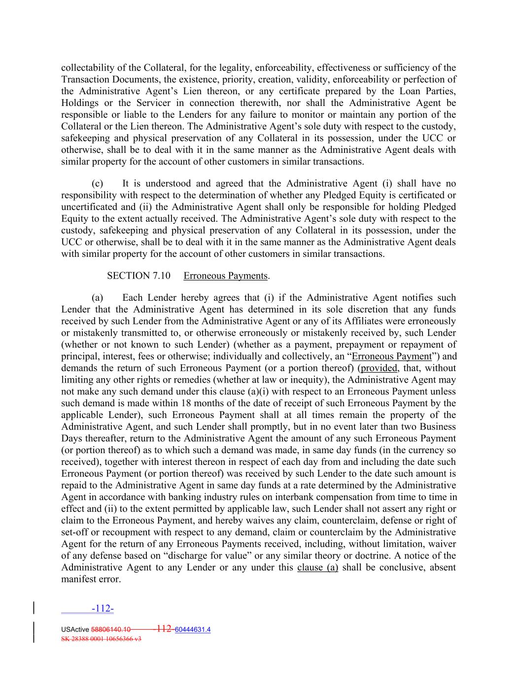 collectability of the Collateral, for the legality, enforceability, effectiveness or sufficiency of the Transaction Documents, the existence, priority, creation, validity, enforceability or perfection of the Administrative Agent’s Lien thereon, or any certificate prepared by the Loan Parties, Holdings or the Servicer in connection therewith, nor shall the Administrative Agent be responsible or liable to the Lenders for any failure to monitor or maintain any portion of the Collateral or the Lien thereon. The Administrative Agent’s sole duty with respect to the custody, safekeeping and physical preservation of any Collateral in its possession, under the UCC or otherwise, shall be to deal with it in the same manner as the Administrative Agent deals with similar property for the account of other customers in similar transactions. (c) It is understood and agreed that the Administrative Agent (i) shall have no responsibility with respect to the determination of whether any Pledged Equity is certificated or uncertificated and (ii) the Administrative Agent shall only be responsible for holding Pledged Equity to the extent actually received. The Administrative Agent’s sole duty with respect to the custody, safekeeping and physical preservation of any Collateral in its possession, under the UCC or otherwise, shall be to deal with it in the same manner as the Administrative Agent deals with similar property for the account of other customers in similar transactions. SECTION 7.10 Erroneous Payments. (a) Each Lender hereby agrees that (i) if the Administrative Agent notifies such Lender that the Administrative Agent has determined in its sole discretion that any funds received by such Lender from the Administrative Agent or any of its Affiliates were erroneously or mistakenly transmitted to, or otherwise erroneously or mistakenly received by, such Lender (whether or not known to such Lender) (whether as a payment, prepayment or repayment of principal, interest, fees or otherwise; individually and collectively, an “Erroneous Payment”) and demands the return of such Erroneous Payment (or a portion thereof) (provided, that, without limiting any other rights or remedies (whether at law or inequity), the Administrative Agent may not make any such demand under this clause (a)(i) with respect to an Erroneous Payment unless such demand is made within 18 months of the date of receipt of such Erroneous Payment by the applicable Lender), such Erroneous Payment shall at all times remain the property of the Administrative Agent, and such Lender shall promptly, but in no event later than two Business Days thereafter, return to the Administrative Agent the amount of any such Erroneous Payment (or portion thereof) as to which such a demand was made, in same day funds (in the currency so received), together with interest thereon in respect of each day from and including the date such Erroneous Payment (or portion thereof) was received by such Lender to the date such amount is repaid to the Administrative Agent in same day funds at a rate determined by the Administrative Agent in accordance with banking industry rules on interbank compensation from time to time in effect and (ii) to the extent permitted by applicable law, such Lender shall not assert any right or claim to the Erroneous Payment, and hereby waives any claim, counterclaim, defense or right of set‐off or recoupment with respect to any demand, claim or counterclaim by the Administrative Agent for the return of any Erroneous Payments received, including, without limitation, waiver of any defense based on “discharge for value” or any similar theory or doctrine. A notice of the Administrative Agent to any Lender or any under this clause (a) shall be conclusive, absent manifest error. -112- USActive 58806140.10 -112-60444631.4 SK 28388 0001 10656366 v3