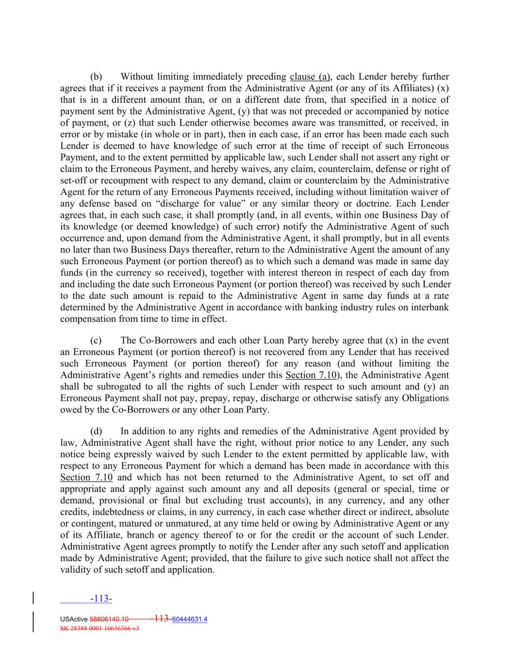 (b) Without limiting immediately preceding clause (a), each Lender hereby further agrees that if it receives a payment from the Administrative Agent (or any of its Affiliates) (x) that is in a different amount than, or on a different date from, that specified in a notice of payment sent by the Administrative Agent, (y) that was not preceded or accompanied by notice of payment, or (z) that such Lender otherwise becomes aware was transmitted, or received, in error or by mistake (in whole or in part), then in each case, if an error has been made each such Lender is deemed to have knowledge of such error at the time of receipt of such Erroneous Payment, and to the extent permitted by applicable law, such Lender shall not assert any right or claim to the Erroneous Payment, and hereby waives, any claim, counterclaim, defense or right of set‐off or recoupment with respect to any demand, claim or counterclaim by the Administrative Agent for the return of any Erroneous Payments received, including without limitation waiver of any defense based on “discharge for value” or any similar theory or doctrine. Each Lender agrees that, in each such case, it shall promptly (and, in all events, within one Business Day of its knowledge (or deemed knowledge) of such error) notify the Administrative Agent of such occurrence and, upon demand from the Administrative Agent, it shall promptly, but in all events no later than two Business Days thereafter, return to the Administrative Agent the amount of any such Erroneous Payment (or portion thereof) as to which such a demand was made in same day funds (in the currency so received), together with interest thereon in respect of each day from and including the date such Erroneous Payment (or portion thereof) was received by such Lender to the date such amount is repaid to the Administrative Agent in same day funds at a rate determined by the Administrative Agent in accordance with banking industry rules on interbank compensation from time to time in effect. (c) The Co‐Borrowers and each other Loan Party hereby agree that (x) in the event an Erroneous Payment (or portion thereof) is not recovered from any Lender that has received such Erroneous Payment (or portion thereof) for any reason (and without limiting the Administrative Agent’s rights and remedies under this Section 7.10), the Administrative Agent shall be subrogated to all the rights of such Lender with respect to such amount and (y) an Erroneous Payment shall not pay, prepay, repay, discharge or otherwise satisfy any Obligations owed by the Co‐Borrowers or any other Loan Party. (d) In addition to any rights and remedies of the Administrative Agent provided by law, Administrative Agent shall have the right, without prior notice to any Lender, any such notice being expressly waived by such Lender to the extent permitted by applicable law, with respect to any Erroneous Payment for which a demand has been made in accordance with this Section 7.10 and which has not been returned to the Administrative Agent, to set off and appropriate and apply against such amount any and all deposits (general or special, time or demand, provisional or final but excluding trust accounts), in any currency, and any other credits, indebtedness or claims, in any currency, in each case whether direct or indirect, absolute or contingent, matured or unmatured, at any time held or owing by Administrative Agent or any of its Affiliate, branch or agency thereof to or for the credit or the account of such Lender. Administrative Agent agrees promptly to notify the Lender after any such setoff and application made by Administrative Agent; provided, that the failure to give such notice shall not affect the validity of such setoff and application. -113- USActive 58806140.10 -113-60444631.4 SK 28388 0001 10656366 v3