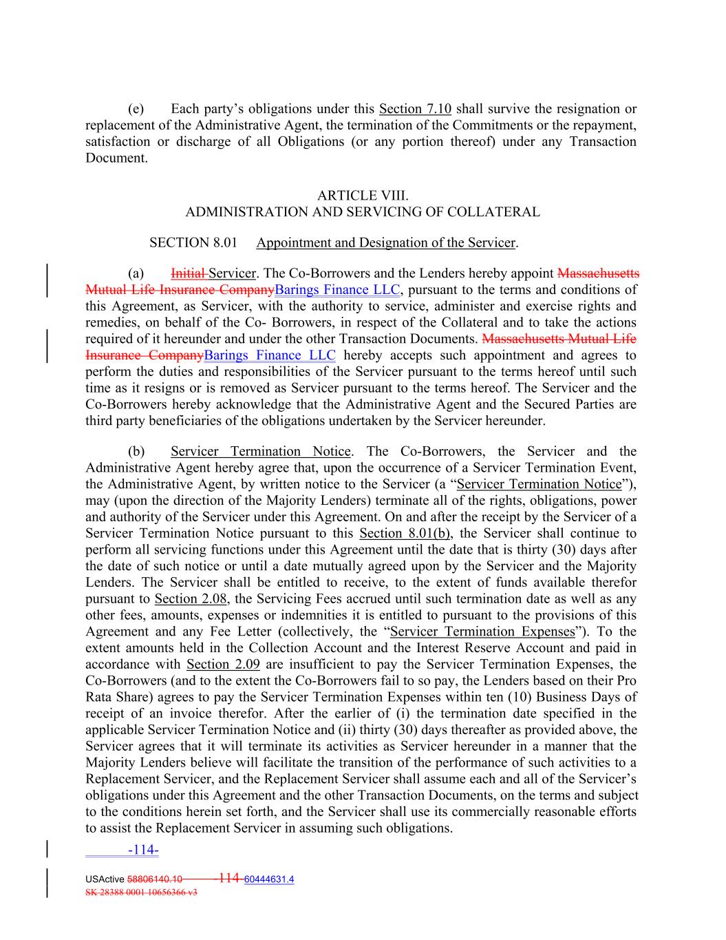(e) Each party’s obligations under this Section 7.10 shall survive the resignation or replacement of the Administrative Agent, the termination of the Commitments or the repayment, satisfaction or discharge of all Obligations (or any portion thereof) under any Transaction Document. ARTICLE VIII. ADMINISTRATION AND SERVICING OF COLLATERAL SECTION 8.01 Appointment and Designation of the Servicer. (a) Initial Servicer. The Co‐Borrowers and the Lenders hereby appoint Massachusetts Mutual Life Insurance CompanyBarings Finance LLC, pursuant to the terms and conditions of this Agreement, as Servicer, with the authority to service, administer and exercise rights and remedies, on behalf of the Co‐ Borrowers, in respect of the Collateral and to take the actions required of it hereunder and under the other Transaction Documents. Massachusetts Mutual Life Insurance CompanyBarings Finance LLC hereby accepts such appointment and agrees to perform the duties and responsibilities of the Servicer pursuant to the terms hereof until such time as it resigns or is removed as Servicer pursuant to the terms hereof. The Servicer and the Co‐Borrowers hereby acknowledge that the Administrative Agent and the Secured Parties are third party beneficiaries of the obligations undertaken by the Servicer hereunder. (b) Servicer Termination Notice. The Co‐Borrowers, the Servicer and the Administrative Agent hereby agree that, upon the occurrence of a Servicer Termination Event, the Administrative Agent, by written notice to the Servicer (a “Servicer Termination Notice”), may (upon the direction of the Majority Lenders) terminate all of the rights, obligations, power and authority of the Servicer under this Agreement. On and after the receipt by the Servicer of a Servicer Termination Notice pursuant to this Section 8.01(b), the Servicer shall continue to perform all servicing functions under this Agreement until the date that is thirty (30) days after the date of such notice or until a date mutually agreed upon by the Servicer and the Majority Lenders. The Servicer shall be entitled to receive, to the extent of funds available therefor pursuant to Section 2.08, the Servicing Fees accrued until such termination date as well as any other fees, amounts, expenses or indemnities it is entitled to pursuant to the provisions of this Agreement and any Fee Letter (collectively, the “Servicer Termination Expenses”). To the extent amounts held in the Collection Account and the Interest Reserve Account and paid in accordance with Section 2.09 are insufficient to pay the Servicer Termination Expenses, the Co‐Borrowers (and to the extent the Co‐Borrowers fail to so pay, the Lenders based on their Pro Rata Share) agrees to pay the Servicer Termination Expenses within ten (10) Business Days of receipt of an invoice therefor. After the earlier of (i) the termination date specified in the applicable Servicer Termination Notice and (ii) thirty (30) days thereafter as provided above, the Servicer agrees that it will terminate its activities as Servicer hereunder in a manner that the Majority Lenders believe will facilitate the transition of the performance of such activities to a Replacement Servicer, and the Replacement Servicer shall assume each and all of the Servicer’s obligations under this Agreement and the other Transaction Documents, on the terms and subject to the conditions herein set forth, and the Servicer shall use its commercially reasonable efforts to assist the Replacement Servicer in assuming such obligations. -114- USActive 58806140.10 -114-60444631.4 SK 28388 0001 10656366 v3