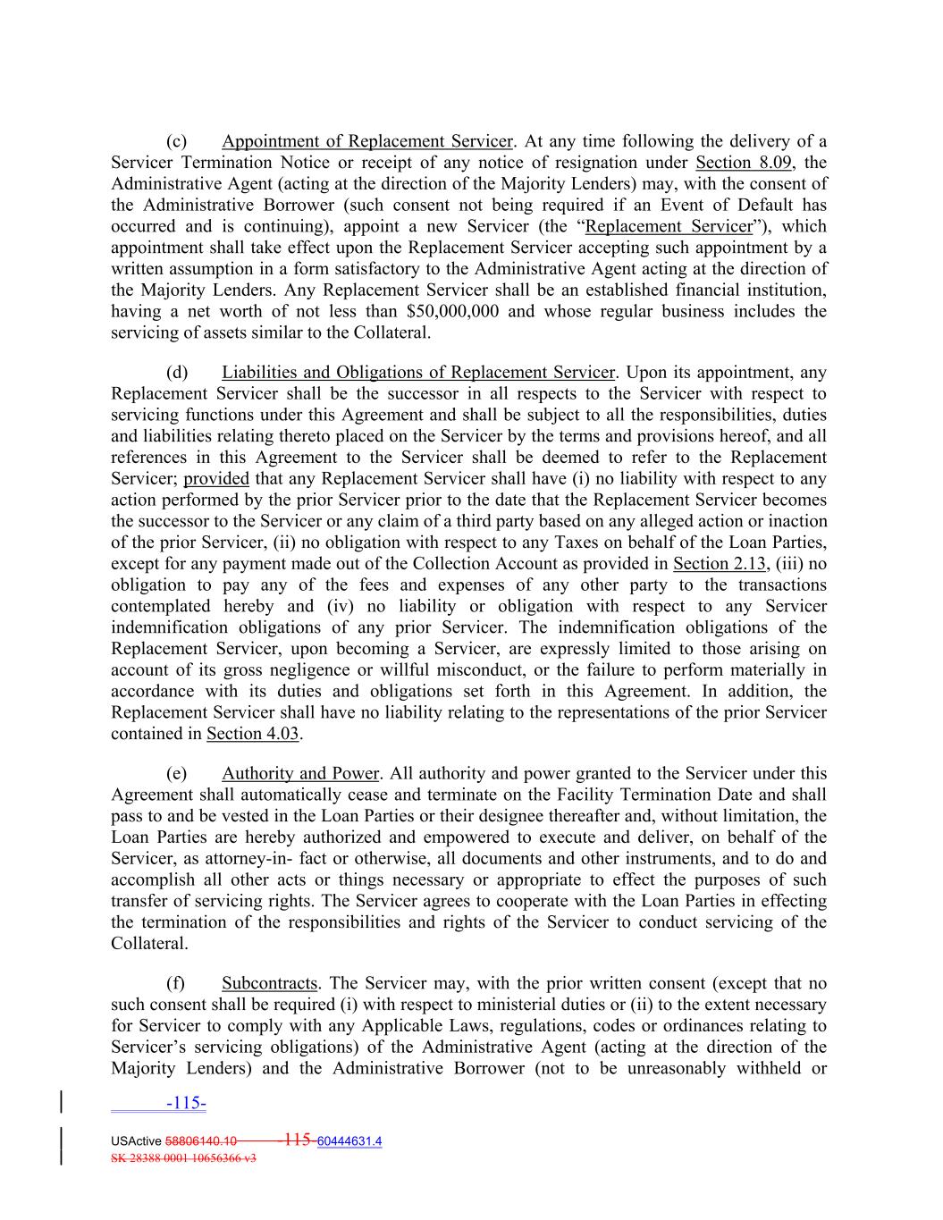(c) Appointment of Replacement Servicer. At any time following the delivery of a Servicer Termination Notice or receipt of any notice of resignation under Section 8.09, the Administrative Agent (acting at the direction of the Majority Lenders) may, with the consent of the Administrative Borrower (such consent not being required if an Event of Default has occurred and is continuing), appoint a new Servicer (the “Replacement Servicer”), which appointment shall take effect upon the Replacement Servicer accepting such appointment by a written assumption in a form satisfactory to the Administrative Agent acting at the direction of the Majority Lenders. Any Replacement Servicer shall be an established financial institution, having a net worth of not less than $50,000,000 and whose regular business includes the servicing of assets similar to the Collateral. (d) Liabilities and Obligations of Replacement Servicer. Upon its appointment, any Replacement Servicer shall be the successor in all respects to the Servicer with respect to servicing functions under this Agreement and shall be subject to all the responsibilities, duties and liabilities relating thereto placed on the Servicer by the terms and provisions hereof, and all references in this Agreement to the Servicer shall be deemed to refer to the Replacement Servicer; provided that any Replacement Servicer shall have (i) no liability with respect to any action performed by the prior Servicer prior to the date that the Replacement Servicer becomes the successor to the Servicer or any claim of a third party based on any alleged action or inaction of the prior Servicer, (ii) no obligation with respect to any Taxes on behalf of the Loan Parties, except for any payment made out of the Collection Account as provided in Section 2.13, (iii) no obligation to pay any of the fees and expenses of any other party to the transactions contemplated hereby and (iv) no liability or obligation with respect to any Servicer indemnification obligations of any prior Servicer. The indemnification obligations of the Replacement Servicer, upon becoming a Servicer, are expressly limited to those arising on account of its gross negligence or willful misconduct, or the failure to perform materially in accordance with its duties and obligations set forth in this Agreement. In addition, the Replacement Servicer shall have no liability relating to the representations of the prior Servicer contained in Section 4.03. (e) Authority and Power. All authority and power granted to the Servicer under this Agreement shall automatically cease and terminate on the Facility Termination Date and shall pass to and be vested in the Loan Parties or their designee thereafter and, without limitation, the Loan Parties are hereby authorized and empowered to execute and deliver, on behalf of the Servicer, as attorney‐in‐ fact or otherwise, all documents and other instruments, and to do and accomplish all other acts or things necessary or appropriate to effect the purposes of such transfer of servicing rights. The Servicer agrees to cooperate with the Loan Parties in effecting the termination of the responsibilities and rights of the Servicer to conduct servicing of the Collateral. (f) Subcontracts. The Servicer may, with the prior written consent (except that no such consent shall be required (i) with respect to ministerial duties or (ii) to the extent necessary for Servicer to comply with any Applicable Laws, regulations, codes or ordinances relating to Servicer’s servicing obligations) of the Administrative Agent (acting at the direction of the Majority Lenders) and the Administrative Borrower (not to be unreasonably withheld or -115- USActive 58806140.10 -115-60444631.4 SK 28388 0001 10656366 v3
