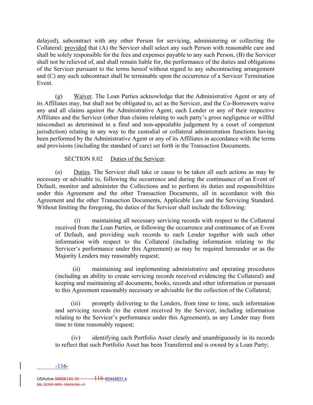 delayed), subcontract with any other Person for servicing, administering or collecting the Collateral; provided that (A) the Servicer shall select any such Person with reasonable care and shall be solely responsible for the fees and expenses payable to any such Person, (B) the Servicer shall not be relieved of, and shall remain liable for, the performance of the duties and obligations of the Servicer pursuant to the terms hereof without regard to any subcontracting arrangement and (C) any such subcontract shall be terminable upon the occurrence of a Servicer Termination Event. (g) Waiver. The Loan Parties acknowledge that the Administrative Agent or any of its Affiliates may, but shall not be obligated to, act as the Servicer, and the Co‐Borrowers waive any and all claims against the Administrative Agent, each Lender or any of their respective Affiliates and the Servicer (other than claims relating to such party’s gross negligence or willful misconduct as determined in a final and non‐appealable judgement by a court of competent jurisdiction) relating in any way to the custodial or collateral administration functions having been performed by the Administrative Agent or any of its Affiliates in accordance with the terms and provisions (including the standard of care) set forth in the Transaction Documents. SECTION 8.02 Duties of the Servicer. (a) Duties. The Servicer shall take or cause to be taken all such actions as may be necessary or advisable to, following the occurrence and during the continuance of an Event of Default, monitor and administer the Collections and to perform its duties and responsibilities under this Agreement and the other Transaction Documents, all in accordance with this Agreement and the other Transaction Documents, Applicable Law and the Servicing Standard. Without limiting the foregoing, the duties of the Servicer shall include the following: (i) maintaining all necessary servicing records with respect to the Collateral received from the Loan Parties, or following the occurrence and continuance of an Event of Default, and providing such records to each Lender together with such other information with respect to the Collateral (including information relating to the Servicer’s performance under this Agreement) as may be required hereunder or as the Majority Lenders may reasonably request; (ii) maintaining and implementing administrative and operating procedures (including an ability to create servicing records received evidencing the Collateral) and keeping and maintaining all documents, books, records and other information or pursuant to this Agreement reasonably necessary or advisable for the collection of the Collateral; (iii) promptly delivering to the Lenders, from time to time, such information and servicing records (to the extent received by the Servicer, including information relating to the Servicer’s performance under this Agreement), as any Lender may from time to time reasonably request; (iv) identifying each Portfolio Asset clearly and unambiguously in its records to reflect that such Portfolio Asset has been Transferred and is owned by a Loan Party; -116- USActive 58806140.10 -116-60444631.4 SK 28388 0001 10656366 v3