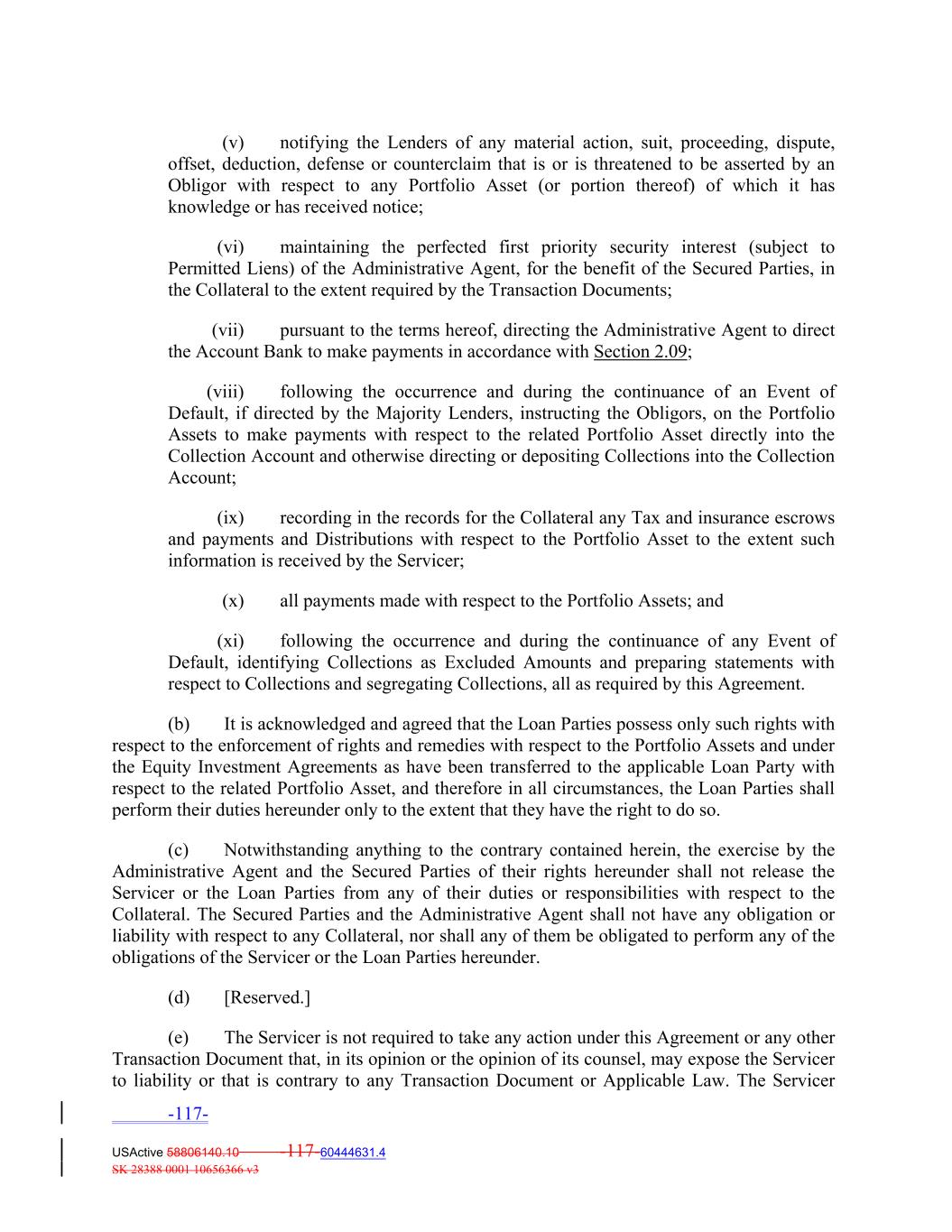 (v) notifying the Lenders of any material action, suit, proceeding, dispute, offset, deduction, defense or counterclaim that is or is threatened to be asserted by an Obligor with respect to any Portfolio Asset (or portion thereof) of which it has knowledge or has received notice; (vi) maintaining the perfected first priority security interest (subject to Permitted Liens) of the Administrative Agent, for the benefit of the Secured Parties, in the Collateral to the extent required by the Transaction Documents; (vii) pursuant to the terms hereof, directing the Administrative Agent to direct the Account Bank to make payments in accordance with Section 2.09; (viii) following the occurrence and during the continuance of an Event of Default, if directed by the Majority Lenders, instructing the Obligors, on the Portfolio Assets to make payments with respect to the related Portfolio Asset directly into the Collection Account and otherwise directing or depositing Collections into the Collection Account; (ix) recording in the records for the Collateral any Tax and insurance escrows and payments and Distributions with respect to the Portfolio Asset to the extent such information is received by the Servicer; (x) all payments made with respect to the Portfolio Assets; and (xi) following the occurrence and during the continuance of any Event of Default, identifying Collections as Excluded Amounts and preparing statements with respect to Collections and segregating Collections, all as required by this Agreement. (b) It is acknowledged and agreed that the Loan Parties possess only such rights with respect to the enforcement of rights and remedies with respect to the Portfolio Assets and under the Equity Investment Agreements as have been transferred to the applicable Loan Party with respect to the related Portfolio Asset, and therefore in all circumstances, the Loan Parties shall perform their duties hereunder only to the extent that they have the right to do so. (c) Notwithstanding anything to the contrary contained herein, the exercise by the Administrative Agent and the Secured Parties of their rights hereunder shall not release the Servicer or the Loan Parties from any of their duties or responsibilities with respect to the Collateral. The Secured Parties and the Administrative Agent shall not have any obligation or liability with respect to any Collateral, nor shall any of them be obligated to perform any of the obligations of the Servicer or the Loan Parties hereunder. (d) [Reserved.] (e) The Servicer is not required to take any action under this Agreement or any other Transaction Document that, in its opinion or the opinion of its counsel, may expose the Servicer to liability or that is contrary to any Transaction Document or Applicable Law. The Servicer -117- USActive 58806140.10 -117-60444631.4 SK 28388 0001 10656366 v3