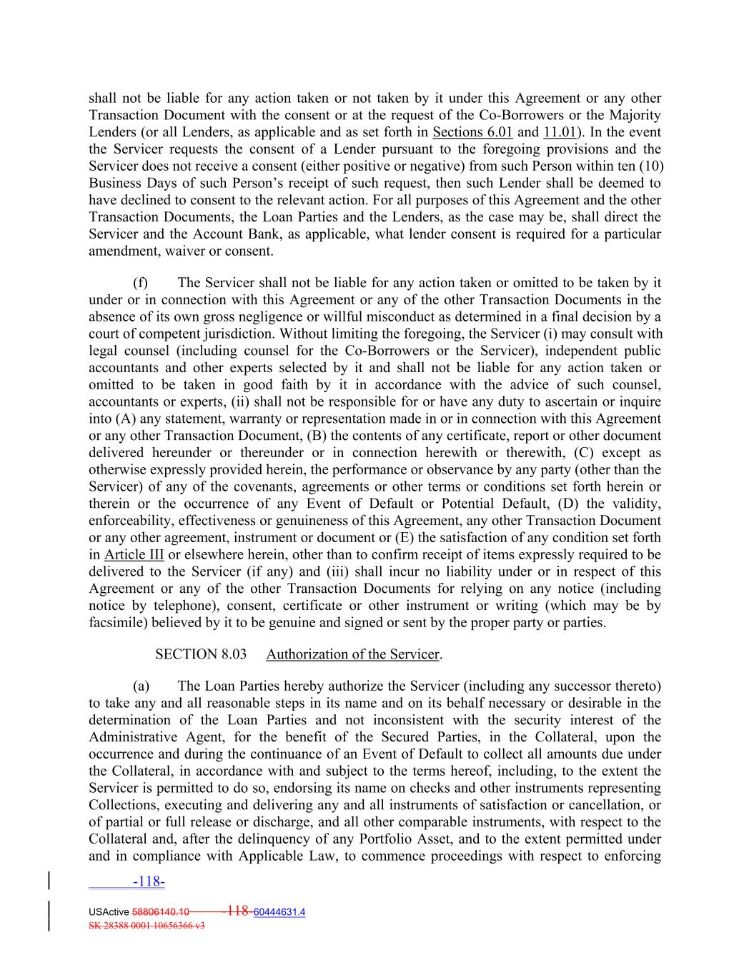shall not be liable for any action taken or not taken by it under this Agreement or any other Transaction Document with the consent or at the request of the Co‐Borrowers or the Majority Lenders (or all Lenders, as applicable and as set forth in Sections 6.01 and 11.01). In the event the Servicer requests the consent of a Lender pursuant to the foregoing provisions and the Servicer does not receive a consent (either positive or negative) from such Person within ten (10) Business Days of such Person’s receipt of such request, then such Lender shall be deemed to have declined to consent to the relevant action. For all purposes of this Agreement and the other Transaction Documents, the Loan Parties and the Lenders, as the case may be, shall direct the Servicer and the Account Bank, as applicable, what lender consent is required for a particular amendment, waiver or consent. (f) The Servicer shall not be liable for any action taken or omitted to be taken by it under or in connection with this Agreement or any of the other Transaction Documents in the absence of its own gross negligence or willful misconduct as determined in a final decision by a court of competent jurisdiction. Without limiting the foregoing, the Servicer (i) may consult with legal counsel (including counsel for the Co‐Borrowers or the Servicer), independent public accountants and other experts selected by it and shall not be liable for any action taken or omitted to be taken in good faith by it in accordance with the advice of such counsel, accountants or experts, (ii) shall not be responsible for or have any duty to ascertain or inquire into (A) any statement, warranty or representation made in or in connection with this Agreement or any other Transaction Document, (B) the contents of any certificate, report or other document delivered hereunder or thereunder or in connection herewith or therewith, (C) except as otherwise expressly provided herein, the performance or observance by any party (other than the Servicer) of any of the covenants, agreements or other terms or conditions set forth herein or therein or the occurrence of any Event of Default or Potential Default, (D) the validity, enforceability, effectiveness or genuineness of this Agreement, any other Transaction Document or any other agreement, instrument or document or (E) the satisfaction of any condition set forth in Article III or elsewhere herein, other than to confirm receipt of items expressly required to be delivered to the Servicer (if any) and (iii) shall incur no liability under or in respect of this Agreement or any of the other Transaction Documents for relying on any notice (including notice by telephone), consent, certificate or other instrument or writing (which may be by facsimile) believed by it to be genuine and signed or sent by the proper party or parties. SECTION 8.03 Authorization of the Servicer. (a) The Loan Parties hereby authorize the Servicer (including any successor thereto) to take any and all reasonable steps in its name and on its behalf necessary or desirable in the determination of the Loan Parties and not inconsistent with the security interest of the Administrative Agent, for the benefit of the Secured Parties, in the Collateral, upon the occurrence and during the continuance of an Event of Default to collect all amounts due under the Collateral, in accordance with and subject to the terms hereof, including, to the extent the Servicer is permitted to do so, endorsing its name on checks and other instruments representing Collections, executing and delivering any and all instruments of satisfaction or cancellation, or of partial or full release or discharge, and all other comparable instruments, with respect to the Collateral and, after the delinquency of any Portfolio Asset, and to the extent permitted under and in compliance with Applicable Law, to commence proceedings with respect to enforcing -118- USActive 58806140.10 -118-60444631.4 SK 28388 0001 10656366 v3