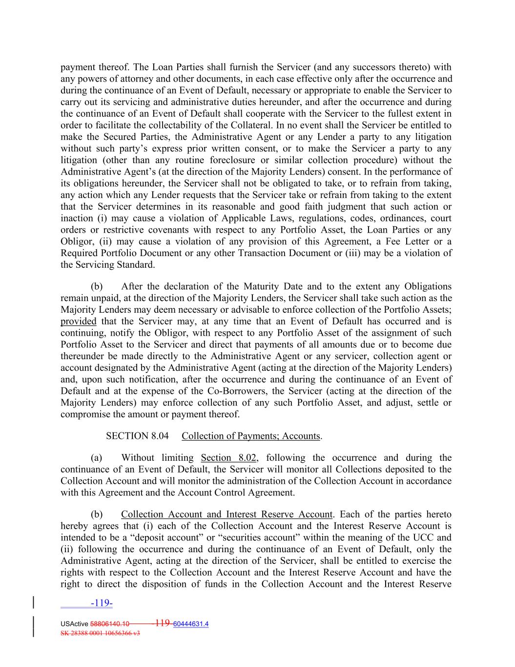 payment thereof. The Loan Parties shall furnish the Servicer (and any successors thereto) with any powers of attorney and other documents, in each case effective only after the occurrence and during the continuance of an Event of Default, necessary or appropriate to enable the Servicer to carry out its servicing and administrative duties hereunder, and after the occurrence and during the continuance of an Event of Default shall cooperate with the Servicer to the fullest extent in order to facilitate the collectability of the Collateral. In no event shall the Servicer be entitled to make the Secured Parties, the Administrative Agent or any Lender a party to any litigation without such party’s express prior written consent, or to make the Servicer a party to any litigation (other than any routine foreclosure or similar collection procedure) without the Administrative Agent’s (at the direction of the Majority Lenders) consent. In the performance of its obligations hereunder, the Servicer shall not be obligated to take, or to refrain from taking, any action which any Lender requests that the Servicer take or refrain from taking to the extent that the Servicer determines in its reasonable and good faith judgment that such action or inaction (i) may cause a violation of Applicable Laws, regulations, codes, ordinances, court orders or restrictive covenants with respect to any Portfolio Asset, the Loan Parties or any Obligor, (ii) may cause a violation of any provision of this Agreement, a Fee Letter or a Required Portfolio Document or any other Transaction Document or (iii) may be a violation of the Servicing Standard. (b) After the declaration of the Maturity Date and to the extent any Obligations remain unpaid, at the direction of the Majority Lenders, the Servicer shall take such action as the Majority Lenders may deem necessary or advisable to enforce collection of the Portfolio Assets; provided that the Servicer may, at any time that an Event of Default has occurred and is continuing, notify the Obligor, with respect to any Portfolio Asset of the assignment of such Portfolio Asset to the Servicer and direct that payments of all amounts due or to become due thereunder be made directly to the Administrative Agent or any servicer, collection agent or account designated by the Administrative Agent (acting at the direction of the Majority Lenders) and, upon such notification, after the occurrence and during the continuance of an Event of Default and at the expense of the Co‐Borrowers, the Servicer (acting at the direction of the Majority Lenders) may enforce collection of any such Portfolio Asset, and adjust, settle or compromise the amount or payment thereof. SECTION 8.04 Collection of Payments; Accounts. (a) Without limiting Section 8.02, following the occurrence and during the continuance of an Event of Default, the Servicer will monitor all Collections deposited to the Collection Account and will monitor the administration of the Collection Account in accordance with this Agreement and the Account Control Agreement. (b) Collection Account and Interest Reserve Account. Each of the parties hereto hereby agrees that (i) each of the Collection Account and the Interest Reserve Account is intended to be a “deposit account” or “securities account” within the meaning of the UCC and (ii) following the occurrence and during the continuance of an Event of Default, only the Administrative Agent, acting at the direction of the Servicer, shall be entitled to exercise the rights with respect to the Collection Account and the Interest Reserve Account and have the right to direct the disposition of funds in the Collection Account and the Interest Reserve -119- USActive 58806140.10 -119-60444631.4 SK 28388 0001 10656366 v3