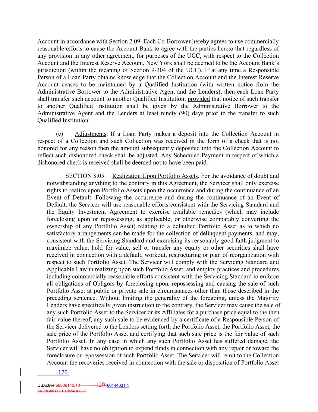 Account in accordance with Section 2.09. Each Co‐Borrower hereby agrees to use commercially reasonable efforts to cause the Account Bank to agree with the parties hereto that regardless of any provision in any other agreement, for purposes of the UCC, with respect to the Collection Account and the Interest Reserve Account, New York shall be deemed to be the Account Bank’s jurisdiction (within the meaning of Section 9‐304 of the UCC). If at any time a Responsible Person of a Loan Party obtains knowledge that the Collection Account and the Interest Reserve Account ceases to be maintained by a Qualified Institution (with written notice from the Administrative Borrower to the Administrative Agent and the Lenders), then each Loan Party shall transfer such account to another Qualified Institution; provided that notice of such transfer to another Qualified Institution shall be given by the Administrative Borrower to the Administrative Agent and the Lenders at least ninety (90) days prior to the transfer to such Qualified Institution. (c) Adjustments. If a Loan Party makes a deposit into the Collection Account in respect of a Collection and such Collection was received in the form of a check that is not honored for any reason then the amount subsequently deposited into the Collection Account to reflect such dishonored check shall be adjusted. Any Scheduled Payment in respect of which a dishonored check is received shall be deemed not to have been paid. SECTION 8.05 Realization Upon Portfolio Assets. For the avoidance of doubt and notwithstanding anything to the contrary in this Agreement, the Servicer shall only exercise rights to realize upon Portfolio Assets upon the occurrence and during the continuance of an Event of Default. Following the occurrence and during the continuance of an Event of Default, the Servicer will use reasonable efforts consistent with the Servicing Standard and the Equity Investment Agreement to exercise available remedies (which may include foreclosing upon or repossessing, as applicable, or otherwise comparably converting the ownership of any Portfolio Asset) relating to a defaulted Portfolio Asset as to which no satisfactory arrangements can be made for the collection of delinquent payments, and may, consistent with the Servicing Standard and exercising its reasonably good faith judgment to maximize value, hold for value, sell or transfer any equity or other securities shall have received in connection with a default, workout, restructuring or plan of reorganization with respect to such Portfolio Asset. The Servicer will comply with the Servicing Standard and Applicable Law in realizing upon such Portfolio Asset, and employ practices and procedures including commercially reasonable efforts consistent with the Servicing Standard to enforce all obligations of Obligors by foreclosing upon, repossessing and causing the sale of such Portfolio Asset at public or private sale in circumstances other than those described in the preceding sentence. Without limiting the generality of the foregoing, unless the Majority Lenders have specifically given instruction to the contrary, the Servicer may cause the sale of any such Portfolio Asset to the Servicer or its Affiliates for a purchase price equal to the then fair value thereof, any such sale to be evidenced by a certificate of a Responsible Person of the Servicer delivered to the Lenders setting forth the Portfolio Asset, the Portfolio Asset, the sale price of the Portfolio Asset and certifying that such sale price is the fair value of such Portfolio Asset. In any case in which any such Portfolio Asset has suffered damage, the Servicer will have no obligation to expend funds in connection with any repair or toward the foreclosure or repossession of such Portfolio Asset. The Servicer will remit to the Collection Account the recoveries received in connection with the sale or disposition of Portfolio Asset -120- USActive 58806140.10 -120-60444631.4 SK 28388 0001 10656366 v3