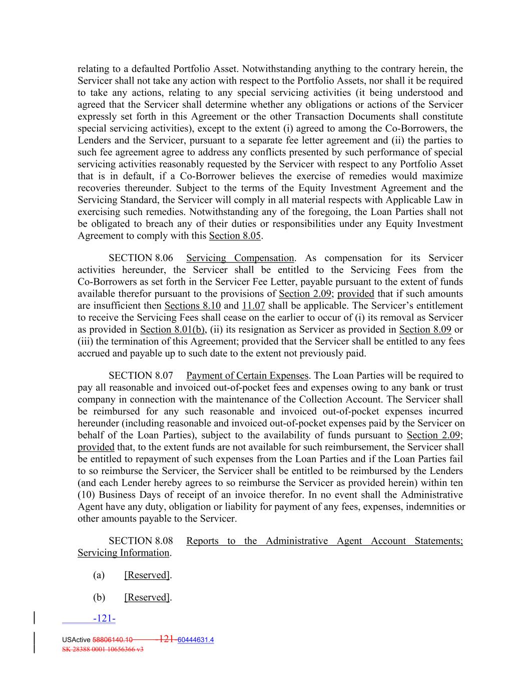 relating to a defaulted Portfolio Asset. Notwithstanding anything to the contrary herein, the Servicer shall not take any action with respect to the Portfolio Assets, nor shall it be required to take any actions, relating to any special servicing activities (it being understood and agreed that the Servicer shall determine whether any obligations or actions of the Servicer expressly set forth in this Agreement or the other Transaction Documents shall constitute special servicing activities), except to the extent (i) agreed to among the Co‐Borrowers, the Lenders and the Servicer, pursuant to a separate fee letter agreement and (ii) the parties to such fee agreement agree to address any conflicts presented by such performance of special servicing activities reasonably requested by the Servicer with respect to any Portfolio Asset that is in default, if a Co‐Borrower believes the exercise of remedies would maximize recoveries thereunder. Subject to the terms of the Equity Investment Agreement and the Servicing Standard, the Servicer will comply in all material respects with Applicable Law in exercising such remedies. Notwithstanding any of the foregoing, the Loan Parties shall not be obligated to breach any of their duties or responsibilities under any Equity Investment Agreement to comply with this Section 8.05. SECTION 8.06 Servicing Compensation. As compensation for its Servicer activities hereunder, the Servicer shall be entitled to the Servicing Fees from the Co‐Borrowers as set forth in the Servicer Fee Letter, payable pursuant to the extent of funds available therefor pursuant to the provisions of Section 2.09; provided that if such amounts are insufficient then Sections 8.10 and 11.07 shall be applicable. The Servicer’s entitlement to receive the Servicing Fees shall cease on the earlier to occur of (i) its removal as Servicer as provided in Section 8.01(b), (ii) its resignation as Servicer as provided in Section 8.09 or (iii) the termination of this Agreement; provided that the Servicer shall be entitled to any fees accrued and payable up to such date to the extent not previously paid. SECTION 8.07 Payment of Certain Expenses. The Loan Parties will be required to pay all reasonable and invoiced out‐of‐pocket fees and expenses owing to any bank or trust company in connection with the maintenance of the Collection Account. The Servicer shall be reimbursed for any such reasonable and invoiced out‐of‐pocket expenses incurred hereunder (including reasonable and invoiced out‐of‐pocket expenses paid by the Servicer on behalf of the Loan Parties), subject to the availability of funds pursuant to Section 2.09; provided that, to the extent funds are not available for such reimbursement, the Servicer shall be entitled to repayment of such expenses from the Loan Parties and if the Loan Parties fail to so reimburse the Servicer, the Servicer shall be entitled to be reimbursed by the Lenders (and each Lender hereby agrees to so reimburse the Servicer as provided herein) within ten (10) Business Days of receipt of an invoice therefor. In no event shall the Administrative Agent have any duty, obligation or liability for payment of any fees, expenses, indemnities or other amounts payable to the Servicer. SECTION 8.08 Reports to the Administrative Agent Account Statements; Servicing Information. (a) [Reserved]. (b) [Reserved]. -121- USActive 58806140.10 -121-60444631.4 SK 28388 0001 10656366 v3