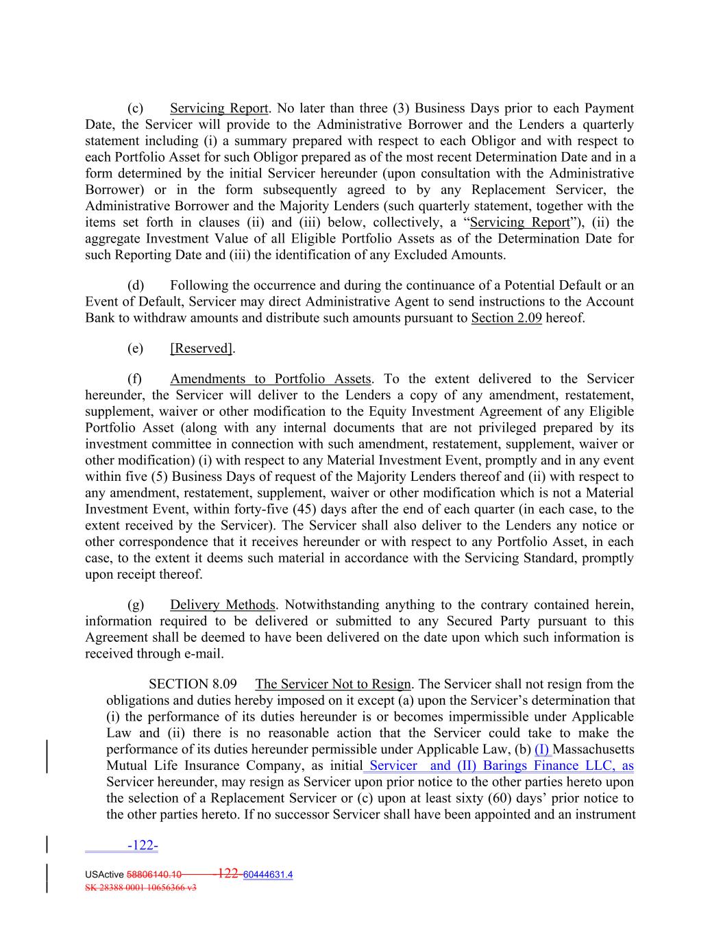 (c) Servicing Report. No later than three (3) Business Days prior to each Payment Date, the Servicer will provide to the Administrative Borrower and the Lenders a quarterly statement including (i) a summary prepared with respect to each Obligor and with respect to each Portfolio Asset for such Obligor prepared as of the most recent Determination Date and in a form determined by the initial Servicer hereunder (upon consultation with the Administrative Borrower) or in the form subsequently agreed to by any Replacement Servicer, the Administrative Borrower and the Majority Lenders (such quarterly statement, together with the items set forth in clauses (ii) and (iii) below, collectively, a “Servicing Report”), (ii) the aggregate Investment Value of all Eligible Portfolio Assets as of the Determination Date for such Reporting Date and (iii) the identification of any Excluded Amounts. (d) Following the occurrence and during the continuance of a Potential Default or an Event of Default, Servicer may direct Administrative Agent to send instructions to the Account Bank to withdraw amounts and distribute such amounts pursuant to Section 2.09 hereof. (e) [Reserved]. (f) Amendments to Portfolio Assets. To the extent delivered to the Servicer hereunder, the Servicer will deliver to the Lenders a copy of any amendment, restatement, supplement, waiver or other modification to the Equity Investment Agreement of any Eligible Portfolio Asset (along with any internal documents that are not privileged prepared by its investment committee in connection with such amendment, restatement, supplement, waiver or other modification) (i) with respect to any Material Investment Event, promptly and in any event within five (5) Business Days of request of the Majority Lenders thereof and (ii) with respect to any amendment, restatement, supplement, waiver or other modification which is not a Material Investment Event, within forty‐five (45) days after the end of each quarter (in each case, to the extent received by the Servicer). The Servicer shall also deliver to the Lenders any notice or other correspondence that it receives hereunder or with respect to any Portfolio Asset, in each case, to the extent it deems such material in accordance with the Servicing Standard, promptly upon receipt thereof. (g) Delivery Methods. Notwithstanding anything to the contrary contained herein, information required to be delivered or submitted to any Secured Party pursuant to this Agreement shall be deemed to have been delivered on the date upon which such information is received through e‐mail. SECTION 8.09 The Servicer Not to Resign. The Servicer shall not resign from the obligations and duties hereby imposed on it except (a) upon the Servicer’s determination that (i) the performance of its duties hereunder is or becomes impermissible under Applicable Law and (ii) there is no reasonable action that the Servicer could take to make the performance of its duties hereunder permissible under Applicable Law, (b) (I) Massachusetts Mutual Life Insurance Company, as initial Servicer and (II) Barings Finance LLC, as Servicer hereunder, may resign as Servicer upon prior notice to the other parties hereto upon the selection of a Replacement Servicer or (c) upon at least sixty (60) days’ prior notice to the other parties hereto. If no successor Servicer shall have been appointed and an instrument -122- USActive 58806140.10 -122-60444631.4 SK 28388 0001 10656366 v3