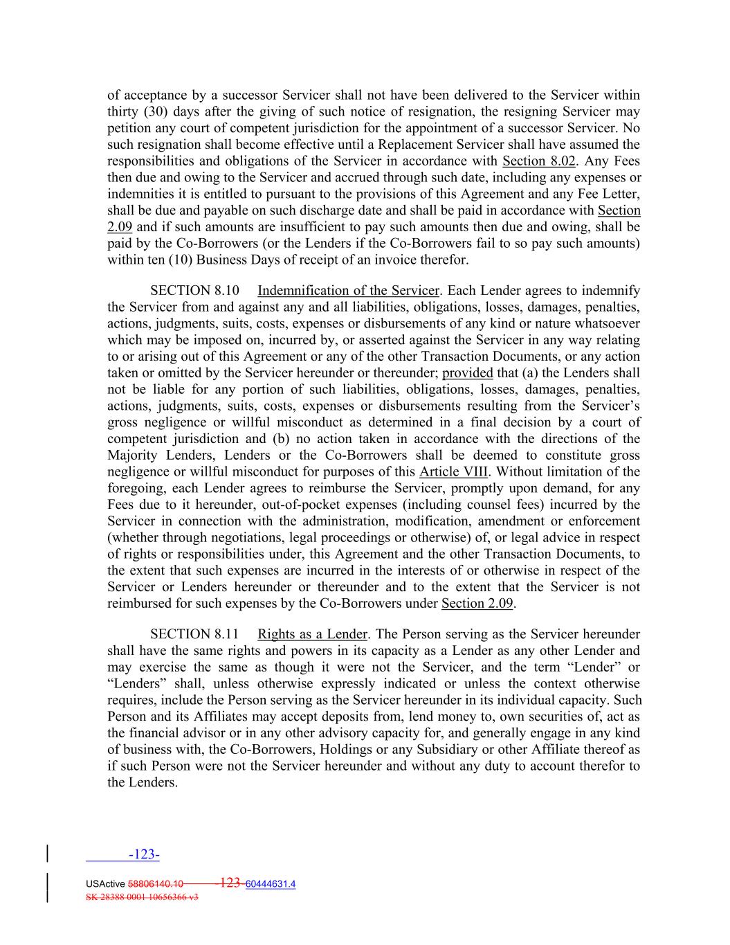 of acceptance by a successor Servicer shall not have been delivered to the Servicer within thirty (30) days after the giving of such notice of resignation, the resigning Servicer may petition any court of competent jurisdiction for the appointment of a successor Servicer. No such resignation shall become effective until a Replacement Servicer shall have assumed the responsibilities and obligations of the Servicer in accordance with Section 8.02. Any Fees then due and owing to the Servicer and accrued through such date, including any expenses or indemnities it is entitled to pursuant to the provisions of this Agreement and any Fee Letter, shall be due and payable on such discharge date and shall be paid in accordance with Section 2.09 and if such amounts are insufficient to pay such amounts then due and owing, shall be paid by the Co‐Borrowers (or the Lenders if the Co‐Borrowers fail to so pay such amounts) within ten (10) Business Days of receipt of an invoice therefor. SECTION 8.10 Indemnification of the Servicer. Each Lender agrees to indemnify the Servicer from and against any and all liabilities, obligations, losses, damages, penalties, actions, judgments, suits, costs, expenses or disbursements of any kind or nature whatsoever which may be imposed on, incurred by, or asserted against the Servicer in any way relating to or arising out of this Agreement or any of the other Transaction Documents, or any action taken or omitted by the Servicer hereunder or thereunder; provided that (a) the Lenders shall not be liable for any portion of such liabilities, obligations, losses, damages, penalties, actions, judgments, suits, costs, expenses or disbursements resulting from the Servicer’s gross negligence or willful misconduct as determined in a final decision by a court of competent jurisdiction and (b) no action taken in accordance with the directions of the Majority Lenders, Lenders or the Co‐Borrowers shall be deemed to constitute gross negligence or willful misconduct for purposes of this Article VIII. Without limitation of the foregoing, each Lender agrees to reimburse the Servicer, promptly upon demand, for any Fees due to it hereunder, out‐of‐pocket expenses (including counsel fees) incurred by the Servicer in connection with the administration, modification, amendment or enforcement (whether through negotiations, legal proceedings or otherwise) of, or legal advice in respect of rights or responsibilities under, this Agreement and the other Transaction Documents, to the extent that such expenses are incurred in the interests of or otherwise in respect of the Servicer or Lenders hereunder or thereunder and to the extent that the Servicer is not reimbursed for such expenses by the Co‐Borrowers under Section 2.09. SECTION 8.11 Rights as a Lender. The Person serving as the Servicer hereunder shall have the same rights and powers in its capacity as a Lender as any other Lender and may exercise the same as though it were not the Servicer, and the term “Lender” or “Lenders” shall, unless otherwise expressly indicated or unless the context otherwise requires, include the Person serving as the Servicer hereunder in its individual capacity. Such Person and its Affiliates may accept deposits from, lend money to, own securities of, act as the financial advisor or in any other advisory capacity for, and generally engage in any kind of business with, the Co‐Borrowers, Holdings or any Subsidiary or other Affiliate thereof as if such Person were not the Servicer hereunder and without any duty to account therefor to the Lenders. -123- USActive 58806140.10 -123-60444631.4 SK 28388 0001 10656366 v3