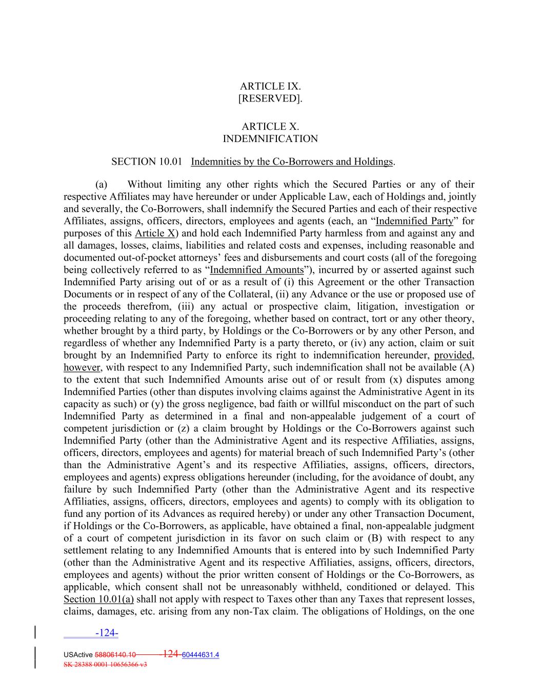 ARTICLE IX. [RESERVED]. ARTICLE X. INDEMNIFICATION SECTION 10.01 Indemnities by the Co‐Borrowers and Holdings. (a) Without limiting any other rights which the Secured Parties or any of their respective Affiliates may have hereunder or under Applicable Law, each of Holdings and, jointly and severally, the Co‐Borrowers, shall indemnify the Secured Parties and each of their respective Affiliates, assigns, officers, directors, employees and agents (each, an “Indemnified Party” for purposes of this Article X) and hold each Indemnified Party harmless from and against any and all damages, losses, claims, liabilities and related costs and expenses, including reasonable and documented out‐of‐pocket attorneys’ fees and disbursements and court costs (all of the foregoing being collectively referred to as “Indemnified Amounts”), incurred by or asserted against such Indemnified Party arising out of or as a result of (i) this Agreement or the other Transaction Documents or in respect of any of the Collateral, (ii) any Advance or the use or proposed use of the proceeds therefrom, (iii) any actual or prospective claim, litigation, investigation or proceeding relating to any of the foregoing, whether based on contract, tort or any other theory, whether brought by a third party, by Holdings or the Co‐Borrowers or by any other Person, and regardless of whether any Indemnified Party is a party thereto, or (iv) any action, claim or suit brought by an Indemnified Party to enforce its right to indemnification hereunder, provided, however, with respect to any Indemnified Party, such indemnification shall not be available (A) to the extent that such Indemnified Amounts arise out of or result from (x) disputes among Indemnified Parties (other than disputes involving claims against the Administrative Agent in its capacity as such) or (y) the gross negligence, bad faith or willful misconduct on the part of such Indemnified Party as determined in a final and non‐appealable judgement of a court of competent jurisdiction or (z) a claim brought by Holdings or the Co‐Borrowers against such Indemnified Party (other than the Administrative Agent and its respective Affiliaties, assigns, officers, directors, employees and agents) for material breach of such Indemnified Party’s (other than the Administrative Agent’s and its respective Affiliaties, assigns, officers, directors, employees and agents) express obligations hereunder (including, for the avoidance of doubt, any failure by such Indemnified Party (other than the Administrative Agent and its respective Affiliaties, assigns, officers, directors, employees and agents) to comply with its obligation to fund any portion of its Advances as required hereby) or under any other Transaction Document, if Holdings or the Co‐Borrowers, as applicable, have obtained a final, non‐appealable judgment of a court of competent jurisdiction in its favor on such claim or (B) with respect to any settlement relating to any Indemnified Amounts that is entered into by such Indemnified Party (other than the Administrative Agent and its respective Affiliaties, assigns, officers, directors, employees and agents) without the prior written consent of Holdings or the Co‐Borrowers, as applicable, which consent shall not be unreasonably withheld, conditioned or delayed. This Section 10.01(a) shall not apply with respect to Taxes other than any Taxes that represent losses, claims, damages, etc. arising from any non‐Tax claim. The obligations of Holdings, on the one -124- USActive 58806140.10 -124-60444631.4 SK 28388 0001 10656366 v3