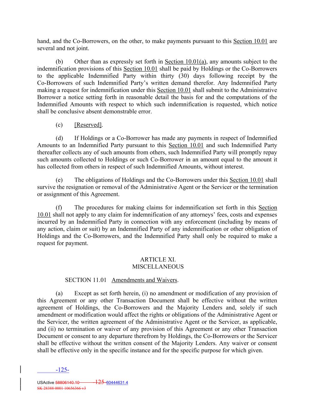 hand, and the Co‐Borrowers, on the other, to make payments pursuant to this Section 10.01 are several and not joint. (b) Other than as expressly set forth in Section 10.01(a), any amounts subject to the indemnification provisions of this Section 10.01 shall be paid by Holdings or the Co‐Borrowers to the applicable Indemnified Party within thirty (30) days following receipt by the Co‐Borrowers of such Indemnified Party’s written demand therefor. Any Indemnified Party making a request for indemnification under this Section 10.01 shall submit to the Administrative Borrower a notice setting forth in reasonable detail the basis for and the computations of the Indemnified Amounts with respect to which such indemnification is requested, which notice shall be conclusive absent demonstrable error. (c) [Reserved]. (d) If Holdings or a Co‐Borrower has made any payments in respect of Indemnified Amounts to an Indemnified Party pursuant to this Section 10.01 and such Indemnified Party thereafter collects any of such amounts from others, such Indemnified Party will promptly repay such amounts collected to Holdings or such Co‐Borrower in an amount equal to the amount it has collected from others in respect of such Indemnified Amounts, without interest. (e) The obligations of Holdings and the Co‐Borrowers under this Section 10.01 shall survive the resignation or removal of the Administrative Agent or the Servicer or the termination or assignment of this Agreement. (f) The procedures for making claims for indemnification set forth in this Section 10.01 shall not apply to any claim for indemnification of any attorneys’ fees, costs and expenses incurred by an Indemnified Party in connection with any enforcement (including by means of any action, claim or suit) by an Indemnified Party of any indemnification or other obligation of Holdings and the Co‐Borrowers, and the Indemnified Party shall only be required to make a request for payment. ARTICLE XI. MISCELLANEOUS SECTION 11.01 Amendments and Waivers. (a) Except as set forth herein, (i) no amendment or modification of any provision of this Agreement or any other Transaction Document shall be effective without the written agreement of Holdings, the Co‐Borrowers and the Majority Lenders and, solely if such amendment or modification would affect the rights or obligations of the Administrative Agent or the Servicer, the written agreement of the Administrative Agent or the Servicer, as applicable, and (ii) no termination or waiver of any provision of this Agreement or any other Transaction Document or consent to any departure therefrom by Holdings, the Co‐Borrowers or the Servicer shall be effective without the written consent of the Majority Lenders. Any waiver or consent shall be effective only in the specific instance and for the specific purpose for which given. -125- USActive 58806140.10 -125-60444631.4 SK 28388 0001 10656366 v3