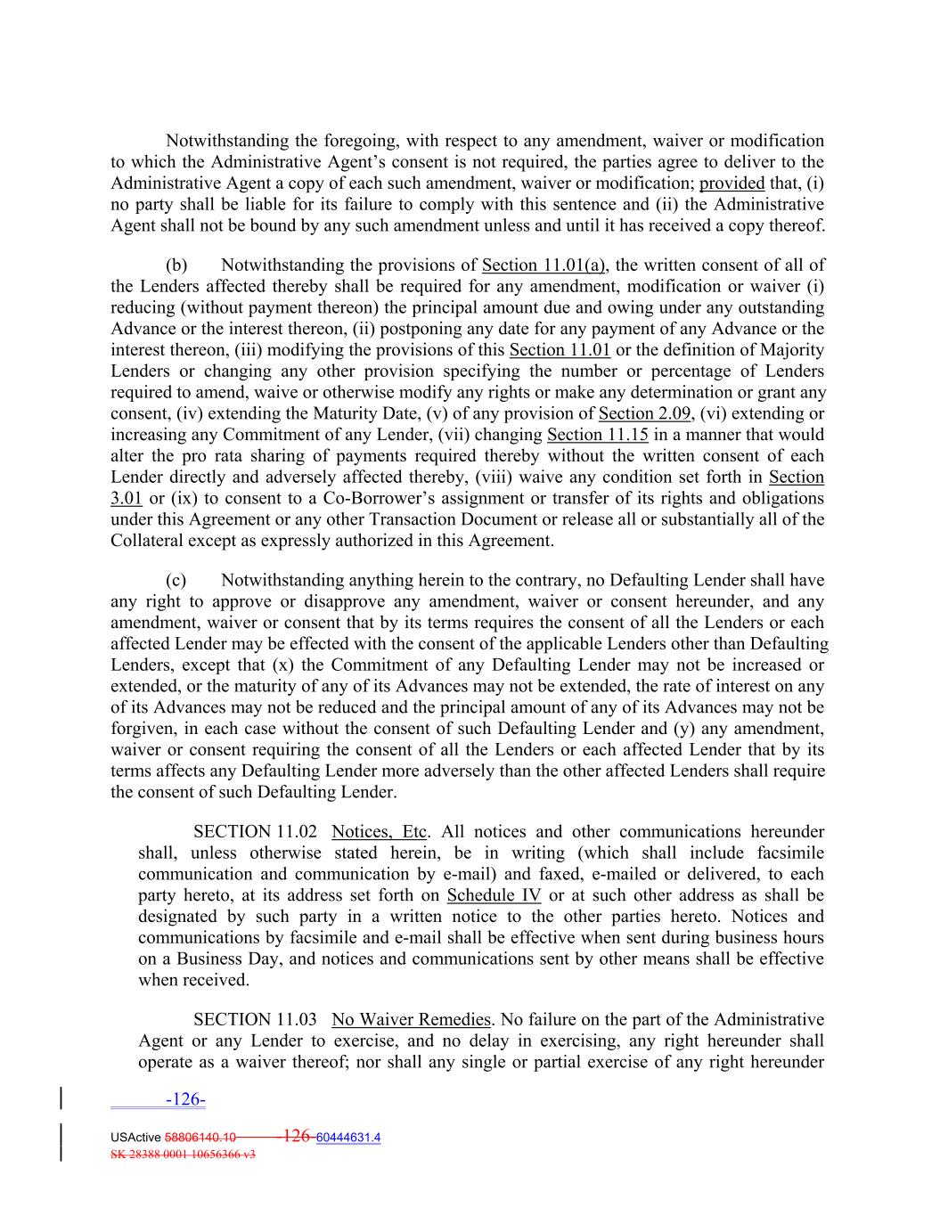Notwithstanding the foregoing, with respect to any amendment, waiver or modification to which the Administrative Agent’s consent is not required, the parties agree to deliver to the Administrative Agent a copy of each such amendment, waiver or modification; provided that, (i) no party shall be liable for its failure to comply with this sentence and (ii) the Administrative Agent shall not be bound by any such amendment unless and until it has received a copy thereof. (b) Notwithstanding the provisions of Section 11.01(a), the written consent of all of the Lenders affected thereby shall be required for any amendment, modification or waiver (i) reducing (without payment thereon) the principal amount due and owing under any outstanding Advance or the interest thereon, (ii) postponing any date for any payment of any Advance or the interest thereon, (iii) modifying the provisions of this Section 11.01 or the definition of Majority Lenders or changing any other provision specifying the number or percentage of Lenders required to amend, waive or otherwise modify any rights or make any determination or grant any consent, (iv) extending the Maturity Date, (v) of any provision of Section 2.09, (vi) extending or increasing any Commitment of any Lender, (vii) changing Section 11.15 in a manner that would alter the pro rata sharing of payments required thereby without the written consent of each Lender directly and adversely affected thereby, (viii) waive any condition set forth in Section 3.01 or (ix) to consent to a Co‐Borrower’s assignment or transfer of its rights and obligations under this Agreement or any other Transaction Document or release all or substantially all of the Collateral except as expressly authorized in this Agreement. (c) Notwithstanding anything herein to the contrary, no Defaulting Lender shall have any right to approve or disapprove any amendment, waiver or consent hereunder, and any amendment, waiver or consent that by its terms requires the consent of all the Lenders or each affected Lender may be effected with the consent of the applicable Lenders other than Defaulting Lenders, except that (x) the Commitment of any Defaulting Lender may not be increased or extended, or the maturity of any of its Advances may not be extended, the rate of interest on any of its Advances may not be reduced and the principal amount of any of its Advances may not be forgiven, in each case without the consent of such Defaulting Lender and (y) any amendment, waiver or consent requiring the consent of all the Lenders or each affected Lender that by its terms affects any Defaulting Lender more adversely than the other affected Lenders shall require the consent of such Defaulting Lender. SECTION 11.02 Notices, Etc. All notices and other communications hereunder shall, unless otherwise stated herein, be in writing (which shall include facsimile communication and communication by e‐mail) and faxed, e‐mailed or delivered, to each party hereto, at its address set forth on Schedule IV or at such other address as shall be designated by such party in a written notice to the other parties hereto. Notices and communications by facsimile and e‐mail shall be effective when sent during business hours on a Business Day, and notices and communications sent by other means shall be effective when received. SECTION 11.03 No Waiver Remedies. No failure on the part of the Administrative Agent or any Lender to exercise, and no delay in exercising, any right hereunder shall operate as a waiver thereof; nor shall any single or partial exercise of any right hereunder -126- USActive 58806140.10 -126-60444631.4 SK 28388 0001 10656366 v3