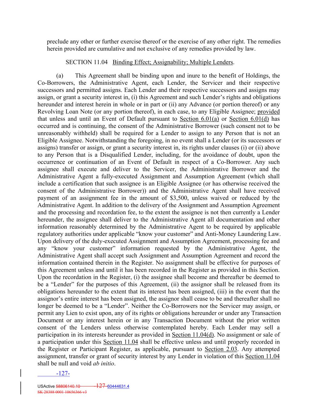 preclude any other or further exercise thereof or the exercise of any other right. The remedies herein provided are cumulative and not exclusive of any remedies provided by law. SECTION 11.04 Binding Effect; Assignability; Multiple Lenders. (a) This Agreement shall be binding upon and inure to the benefit of Holdings, the Co‐Borrowers, the Administrative Agent, each Lender, the Servicer and their respective successors and permitted assigns. Each Lender and their respective successors and assigns may assign, or grant a security interest in, (i) this Agreement and such Lender’s rights and obligations hereunder and interest herein in whole or in part or (ii) any Advance (or portion thereof) or any Revolving Loan Note (or any portion thereof), in each case, to any Eligible Assignee; provided that unless and until an Event of Default pursuant to Section 6.01(a) or Section 6.01(d) has occurred and is continuing, the consent of the Administrative Borrower (such consent not to be unreasonably withheld) shall be required for a Lender to assign to any Person that is not an Eligible Assignee. Notwithstanding the foregoing, in no event shall a Lender (or its successors or assigns) transfer or assign, or grant a security interest in, its rights under clauses (i) or (ii) above to any Person that is a Disqualified Lender, including, for the avoidance of doubt, upon the occurrence or continuation of an Event of Default in respect of a Co‐Borrower. Any such assignee shall execute and deliver to the Servicer, the Administrative Borrower and the Administrative Agent a fully‐executed Assignment and Assumption Agreement (which shall include a certification that such assignee is an Eligible Assignee (or has otherwise received the consent of the Administrative Borrower)) and the Administrative Agent shall have received payment of an assignment fee in the amount of $3,500, unless waived or reduced by the Administrative Agent. In addition to the delivery of the Assignment and Assumption Agreement and the processing and recordation fee, to the extent the assignee is not then currently a Lender hereunder, the assignee shall deliver to the Administrative Agent all documentation and other information reasonably determined by the Administrative Agent to be required by applicable regulatory authorities under applicable “know your customer” and Anti‐Money Laundering Law. Upon delivery of the duly‐executed Assignment and Assumption Agreement, processing fee and any “know your customer” information requested by the Administrative Agent, the Administrative Agent shall accept such Assignment and Assumption Agreement and record the information contained therein in the Register. No assignment shall be effective for purposes of this Agreement unless and until it has been recorded in the Register as provided in this Section. Upon the recordation in the Register, (i) the assignee shall become and thereafter be deemed to be a “Lender” for the purposes of this Agreement, (ii) the assignor shall be released from its obligations hereunder to the extent that its interest has been assigned, (iii) in the event that the assignor’s entire interest has been assigned, the assignor shall cease to be and thereafter shall no longer be deemed to be a “Lender”. Neither the Co‐Borrowers nor the Servicer may assign, or permit any Lien to exist upon, any of its rights or obligations hereunder or under any Transaction Document or any interest herein or in any Transaction Document without the prior written consent of the Lenders unless otherwise contemplated hereby. Each Lender may sell a participation in its interests hereunder as provided in Section 11.04(d). No assignment or sale of a participation under this Section 11.04 shall be effective unless and until properly recorded in the Register or Participant Register, as applicable, pursuant to Section 2.03. Any attempted assignment, transfer or grant of security interest by any Lender in violation of this Section 11.04 shall be null and void ab initio. -127- USActive 58806140.10 -127-60444631.4 SK 28388 0001 10656366 v3