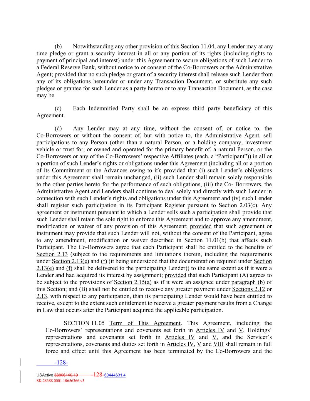 (b) Notwithstanding any other provision of this Section 11.04, any Lender may at any time pledge or grant a security interest in all or any portion of its rights (including rights to payment of principal and interest) under this Agreement to secure obligations of such Lender to a Federal Reserve Bank, without notice to or consent of the Co‐Borrowers or the Administrative Agent; provided that no such pledge or grant of a security interest shall release such Lender from any of its obligations hereunder or under any Transaction Document, or substitute any such pledgee or grantee for such Lender as a party hereto or to any Transaction Document, as the case may be. (c) Each Indemnified Party shall be an express third party beneficiary of this Agreement. (d) Any Lender may at any time, without the consent of, or notice to, the Co‐Borrowers or without the consent of, but with notice to, the Administrative Agent, sell participations to any Person (other than a natural Person, or a holding company, investment vehicle or trust for, or owned and operated for the primary benefit of, a natural Person, or the Co‐Borrowers or any of the Co‐Borrowers’ respective Affiliates (each, a “Participant”)) in all or a portion of such Lender’s rights or obligations under this Agreement (including all or a portion of its Commitment or the Advances owing to it); provided that (i) such Lender’s obligations under this Agreement shall remain unchanged, (ii) such Lender shall remain solely responsible to the other parties hereto for the performance of such obligations, (iii) the Co‐ Borrowers, the Administrative Agent and Lenders shall continue to deal solely and directly with such Lender in connection with such Lender’s rights and obligations under this Agreement and (iv) such Lender shall register such participation in its Participant Register pursuant to Section 2.03(c). Any agreement or instrument pursuant to which a Lender sells such a participation shall provide that such Lender shall retain the sole right to enforce this Agreement and to approve any amendment, modification or waiver of any provision of this Agreement; provided that such agreement or instrument may provide that such Lender will not, without the consent of the Participant, agree to any amendment, modification or waiver described in Section 11.01(b) that affects such Participant. The Co‐Borrowers agree that each Participant shall be entitled to the benefits of Section 2.13 (subject to the requirements and limitations therein, including the requirements under Section 2.13(e) and (f) (it being understood that the documentation required under Section 2.13(e) and (f) shall be delivered to the participating Lender)) to the same extent as if it were a Lender and had acquired its interest by assignment; provided that such Participant (A) agrees to be subject to the provisions of Section 2.15(a) as if it were an assignee under paragraph (b) of this Section; and (B) shall not be entitled to receive any greater payment under Sections 2.12 or 2.13, with respect to any participation, than its participating Lender would have been entitled to receive, except to the extent such entitlement to receive a greater payment results from a Change in Law that occurs after the Participant acquired the applicable participation. SECTION 11.05 Term of This Agreement. This Agreement, including the Co‐Borrowers’ representations and covenants set forth in Articles IV and V, Holdings’ representations and covenants set forth in Articles IV and V, and the Servicer’s representations, covenants and duties set forth in Articles IV, V and VIII shall remain in full force and effect until this Agreement has been terminated by the Co‐Borrowers and the -128- USActive 58806140.10 -128-60444631.4 SK 28388 0001 10656366 v3