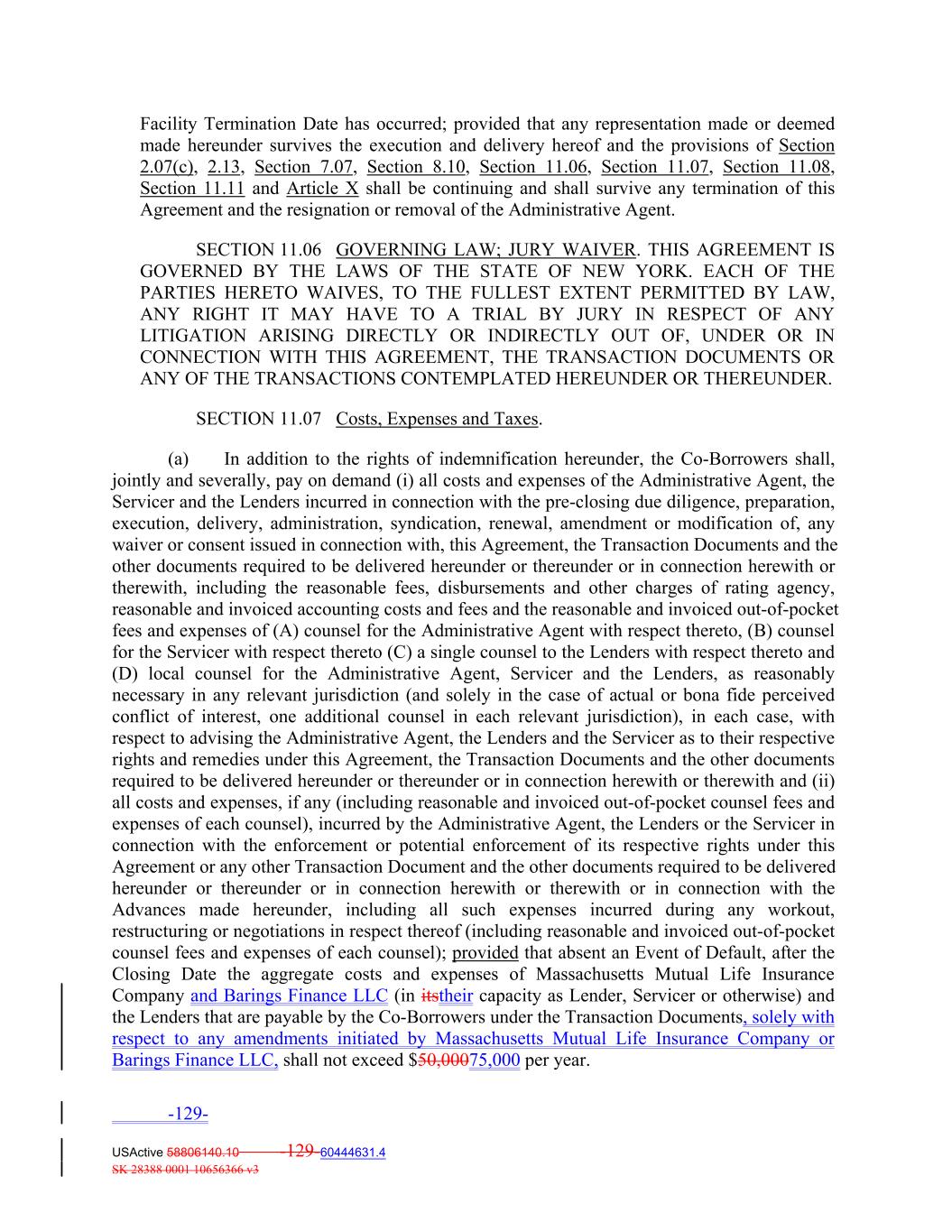 Facility Termination Date has occurred; provided that any representation made or deemed made hereunder survives the execution and delivery hereof and the provisions of Section 2.07(c), 2.13, Section 7.07, Section 8.10, Section 11.06, Section 11.07, Section 11.08, Section 11.11 and Article X shall be continuing and shall survive any termination of this Agreement and the resignation or removal of the Administrative Agent. SECTION 11.06 GOVERNING LAW; JURY WAIVER. THIS AGREEMENT IS GOVERNED BY THE LAWS OF THE STATE OF NEW YORK. EACH OF THE PARTIES HERETO WAIVES, TO THE FULLEST EXTENT PERMITTED BY LAW, ANY RIGHT IT MAY HAVE TO A TRIAL BY JURY IN RESPECT OF ANY LITIGATION ARISING DIRECTLY OR INDIRECTLY OUT OF, UNDER OR IN CONNECTION WITH THIS AGREEMENT, THE TRANSACTION DOCUMENTS OR ANY OF THE TRANSACTIONS CONTEMPLATED HEREUNDER OR THEREUNDER. SECTION 11.07 Costs, Expenses and Taxes. (a) In addition to the rights of indemnification hereunder, the Co‐Borrowers shall, jointly and severally, pay on demand (i) all costs and expenses of the Administrative Agent, the Servicer and the Lenders incurred in connection with the pre‐closing due diligence, preparation, execution, delivery, administration, syndication, renewal, amendment or modification of, any waiver or consent issued in connection with, this Agreement, the Transaction Documents and the other documents required to be delivered hereunder or thereunder or in connection herewith or therewith, including the reasonable fees, disbursements and other charges of rating agency, reasonable and invoiced accounting costs and fees and the reasonable and invoiced out‐of‐pocket fees and expenses of (A) counsel for the Administrative Agent with respect thereto, (B) counsel for the Servicer with respect thereto (C) a single counsel to the Lenders with respect thereto and (D) local counsel for the Administrative Agent, Servicer and the Lenders, as reasonably necessary in any relevant jurisdiction (and solely in the case of actual or bona fide perceived conflict of interest, one additional counsel in each relevant jurisdiction), in each case, with respect to advising the Administrative Agent, the Lenders and the Servicer as to their respective rights and remedies under this Agreement, the Transaction Documents and the other documents required to be delivered hereunder or thereunder or in connection herewith or therewith and (ii) all costs and expenses, if any (including reasonable and invoiced out‐of‐pocket counsel fees and expenses of each counsel), incurred by the Administrative Agent, the Lenders or the Servicer in connection with the enforcement or potential enforcement of its respective rights under this Agreement or any other Transaction Document and the other documents required to be delivered hereunder or thereunder or in connection herewith or therewith or in connection with the Advances made hereunder, including all such expenses incurred during any workout, restructuring or negotiations in respect thereof (including reasonable and invoiced out‐of‐pocket counsel fees and expenses of each counsel); provided that absent an Event of Default, after the Closing Date the aggregate costs and expenses of Massachusetts Mutual Life Insurance Company and Barings Finance LLC (in itstheir capacity as Lender, Servicer or otherwise) and the Lenders that are payable by the Co‐Borrowers under the Transaction Documents, solely with respect to any amendments initiated by Massachusetts Mutual Life Insurance Company or Barings Finance LLC, shall not exceed $50,00075,000 per year. -129- USActive 58806140.10 -129-60444631.4 SK 28388 0001 10656366 v3