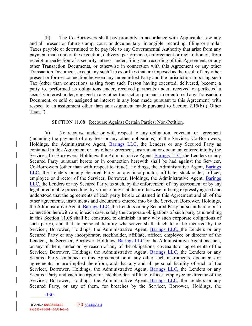 (b) The Co‐Borrowers shall pay promptly in accordance with Applicable Law any and all present or future stamp, court or documentary, intangible, recording, filing or similar Taxes payable or determined to be payable to any Governmental Authority that arise from any payment made under, the execution, delivery, performance, enforcement or registration of, from receipt or perfection of a security interest under, filing and recording of this Agreement, or any other Transaction Documents, or otherwise in connection with this Agreement or any other Transaction Document, except any such Taxes or fees that are imposed as the result of any other present or former connection between any Indemnified Party and the jurisdiction imposing such Tax (other than connections arising from such Person having executed, delivered, become a party to, performed its obligations under, received payments under, received or perfected a security interest under, engaged in any other transaction pursuant to or enforced any Transaction Document, or sold or assigned an interest in any loan made pursuant to this Agreement) with respect to an assignment other than an assignment made pursuant to Section 2.15(b) (“Other Taxes”). SECTION 11.08 Recourse Against Certain Parties; Non‐Petition. (a) No recourse under or with respect to any obligation, covenant or agreement (including the payment of any fees or any other obligations) of the Servicer, Co‐Borrowers, Holdings, the Administrative Agent, Barings LLC, the Lenders or any Secured Party as contained in this Agreement or any other agreement, instrument or document entered into by the Servicer, Co‐Borrowers, Holdings, the Administrative Agent, Barings LLC, the Lenders or any Secured Party pursuant hereto or in connection herewith shall be had against the Servicer, Co‐Borrowers (other than with respect to fraud), Holdings, the Administrative Agent, Barings LLC, the Lenders or any Secured Party or any incorporator, affiliate, stockholder, officer, employee or director of the Servicer, Borrower, Holdings, the Administrative Agent, Barings LLC, the Lenders or any Secured Party, as such, by the enforcement of any assessment or by any legal or equitable proceeding, by virtue of any statute or otherwise; it being expressly agreed and understood that the agreements of each party hereto contained in this Agreement and all of the other agreements, instruments and documents entered into by the Servicer, Borrower, Holdings, the Administrative Agent, Barings LLC, the Lenders or any Secured Party pursuant hereto or in connection herewith are, in each case, solely the corporate obligations of such party (and nothing in this Section 11.08 shall be construed to diminish in any way such corporate obligations of such party), and that no personal liability whatsoever shall attach to or be incurred by the Servicer, Borrower, Holdings, the Administrative Agent, Barings LLC, the Lenders or any Secured Party or any incorporator, stockholder, affiliate, officer, employee or director of the Lenders, the Servicer, Borrower, Holdings, Barings LLC or the Administrative Agent, as such, or any of them, under or by reason of any of the obligations, covenants or agreements of the Servicer, Borrower, Holdings, the Administrative Agent, Barings LLC, the Lenders or any Secured Party contained in this Agreement or in any other such instruments, documents or agreements, or are implied therefrom, and that any and all personal liability of each of the Servicer, Borrower, Holdings, the Administrative Agent, Barings LLC, the Lenders or any Secured Party and each incorporator, stockholder, affiliate, officer, employee or director of the Servicer, Borrower, Holdings, the Administrative Agent, Barings LLC, the Lenders or any Secured Party, or any of them, for breaches by the Servicer, Borrower, Holdings, the -130- USActive 58806140.10 -130-60444631.4 SK 28388 0001 10656366 v3