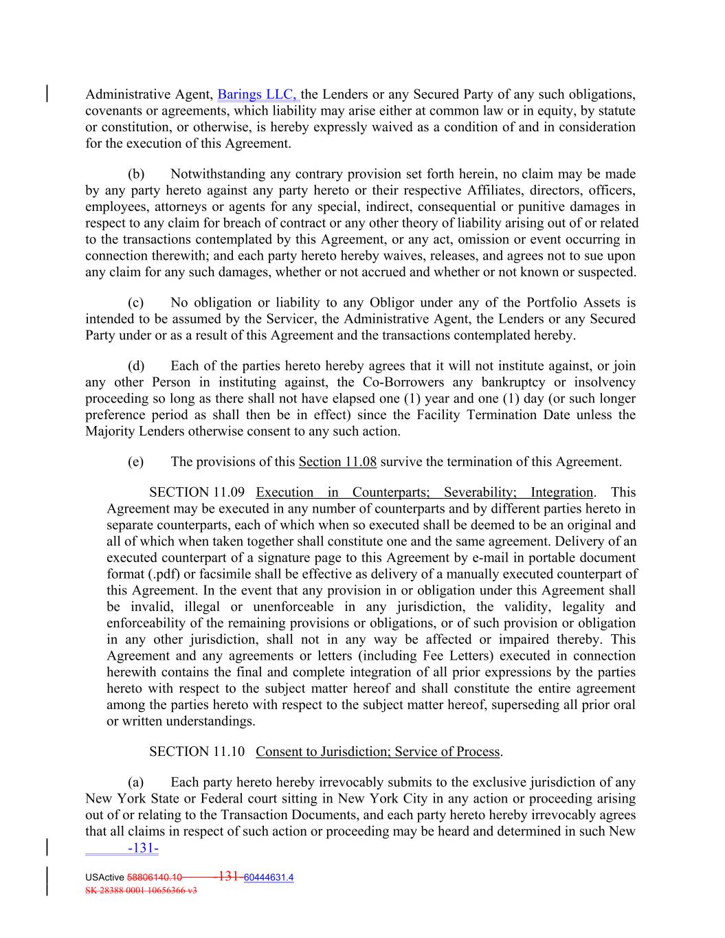 Administrative Agent, Barings LLC, the Lenders or any Secured Party of any such obligations, covenants or agreements, which liability may arise either at common law or in equity, by statute or constitution, or otherwise, is hereby expressly waived as a condition of and in consideration for the execution of this Agreement. (b) Notwithstanding any contrary provision set forth herein, no claim may be made by any party hereto against any party hereto or their respective Affiliates, directors, officers, employees, attorneys or agents for any special, indirect, consequential or punitive damages in respect to any claim for breach of contract or any other theory of liability arising out of or related to the transactions contemplated by this Agreement, or any act, omission or event occurring in connection therewith; and each party hereto hereby waives, releases, and agrees not to sue upon any claim for any such damages, whether or not accrued and whether or not known or suspected. (c) No obligation or liability to any Obligor under any of the Portfolio Assets is intended to be assumed by the Servicer, the Administrative Agent, the Lenders or any Secured Party under or as a result of this Agreement and the transactions contemplated hereby. (d) Each of the parties hereto hereby agrees that it will not institute against, or join any other Person in instituting against, the Co‐Borrowers any bankruptcy or insolvency proceeding so long as there shall not have elapsed one (1) year and one (1) day (or such longer preference period as shall then be in effect) since the Facility Termination Date unless the Majority Lenders otherwise consent to any such action. (e) The provisions of this Section 11.08 survive the termination of this Agreement. SECTION 11.09 Execution in Counterparts; Severability; Integration. This Agreement may be executed in any number of counterparts and by different parties hereto in separate counterparts, each of which when so executed shall be deemed to be an original and all of which when taken together shall constitute one and the same agreement. Delivery of an executed counterpart of a signature page to this Agreement by e‐mail in portable document format (.pdf) or facsimile shall be effective as delivery of a manually executed counterpart of this Agreement. In the event that any provision in or obligation under this Agreement shall be invalid, illegal or unenforceable in any jurisdiction, the validity, legality and enforceability of the remaining provisions or obligations, or of such provision or obligation in any other jurisdiction, shall not in any way be affected or impaired thereby. This Agreement and any agreements or letters (including Fee Letters) executed in connection herewith contains the final and complete integration of all prior expressions by the parties hereto with respect to the subject matter hereof and shall constitute the entire agreement among the parties hereto with respect to the subject matter hereof, superseding all prior oral or written understandings. SECTION 11.10 Consent to Jurisdiction; Service of Process. (a) Each party hereto hereby irrevocably submits to the exclusive jurisdiction of any New York State or Federal court sitting in New York City in any action or proceeding arising out of or relating to the Transaction Documents, and each party hereto hereby irrevocably agrees that all claims in respect of such action or proceeding may be heard and determined in such New -131- USActive 58806140.10 -131-60444631.4 SK 28388 0001 10656366 v3