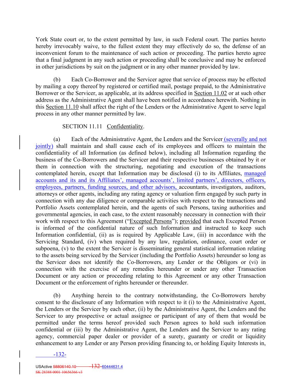 York State court or, to the extent permitted by law, in such Federal court. The parties hereto hereby irrevocably waive, to the fullest extent they may effectively do so, the defense of an inconvenient forum to the maintenance of such action or proceeding. The parties hereto agree that a final judgment in any such action or proceeding shall be conclusive and may be enforced in other jurisdictions by suit on the judgment or in any other manner provided by law. (b) Each Co‐Borrower and the Servicer agree that service of process may be effected by mailing a copy thereof by registered or certified mail, postage prepaid, to the Administrative Borrower or the Servicer, as applicable, at its address specified in Section 11.02 or at such other address as the Administrative Agent shall have been notified in accordance herewith. Nothing in this Section 11.10 shall affect the right of the Lenders or the Administrative Agent to serve legal process in any other manner permitted by law. SECTION 11.11 Confidentiality. (a) Each of the Administrative Agent, the Lenders and the Servicer (severally and not jointly) shall maintain and shall cause each of its employees and officers to maintain the confidentiality of all Information (as defined below), including all Information regarding the business of the Co‐Borrowers and the Servicer and their respective businesses obtained by it or them in connection with the structuring, negotiating and execution of the transactions contemplated herein, except that Information may be disclosed (i) to its Affiliates, managed accounts and its and its Affiliates’, managed accounts’, limited partners’, directors, officers, employees, partners, funding sources, and other advisors, accountants, investigators, auditors, attorneys or other agents, including any rating agency or valuation firm engaged by such party in connection with any due diligence or comparable activities with respect to the transactions and Portfolio Assets contemplated herein, and the agents of such Persons, taxing authorities and governmental agencies, in each case, to the extent reasonably necessary in connection with their work with respect to this Agreement (“Excepted Persons”); provided that each Excepted Person is informed of the confidential nature of such Information and instructed to keep such Information confidential, (ii) as is required by Applicable Law, (iii) in accordance with the Servicing Standard, (iv) when required by any law, regulation, ordinance, court order or subpoena, (v) to the extent the Servicer is disseminating general statistical information relating to the assets being serviced by the Servicer (including the Portfolio Assets) hereunder so long as the Servicer does not identify the Co‐Borrowers, any Lender or the Obligors or (vi) in connection with the exercise of any remedies hereunder or under any other Transaction Document or any action or proceeding relating to this Agreement or any other Transaction Document or the enforcement of rights hereunder or thereunder. (b) Anything herein to the contrary notwithstanding, the Co‐Borrowers hereby consent to the disclosure of any Information with respect to it (i) to the Administrative Agent, the Lenders or the Servicer by each other, (ii) by the Administrative Agent, the Lenders and the Servicer to any prospective or actual assignee or participant of any of them that would be permitted under the terms hereof provided such Person agrees to hold such information confidential or (iii) by the Administrative Agent, the Lenders and the Servicer to any rating agency, commercial paper dealer or provider of a surety, guaranty or credit or liquidity enhancement to any Lender or any Person providing financing to, or holding Equity Interests in, -132- USActive 58806140.10 -132-60444631.4 SK 28388 0001 10656366 v3