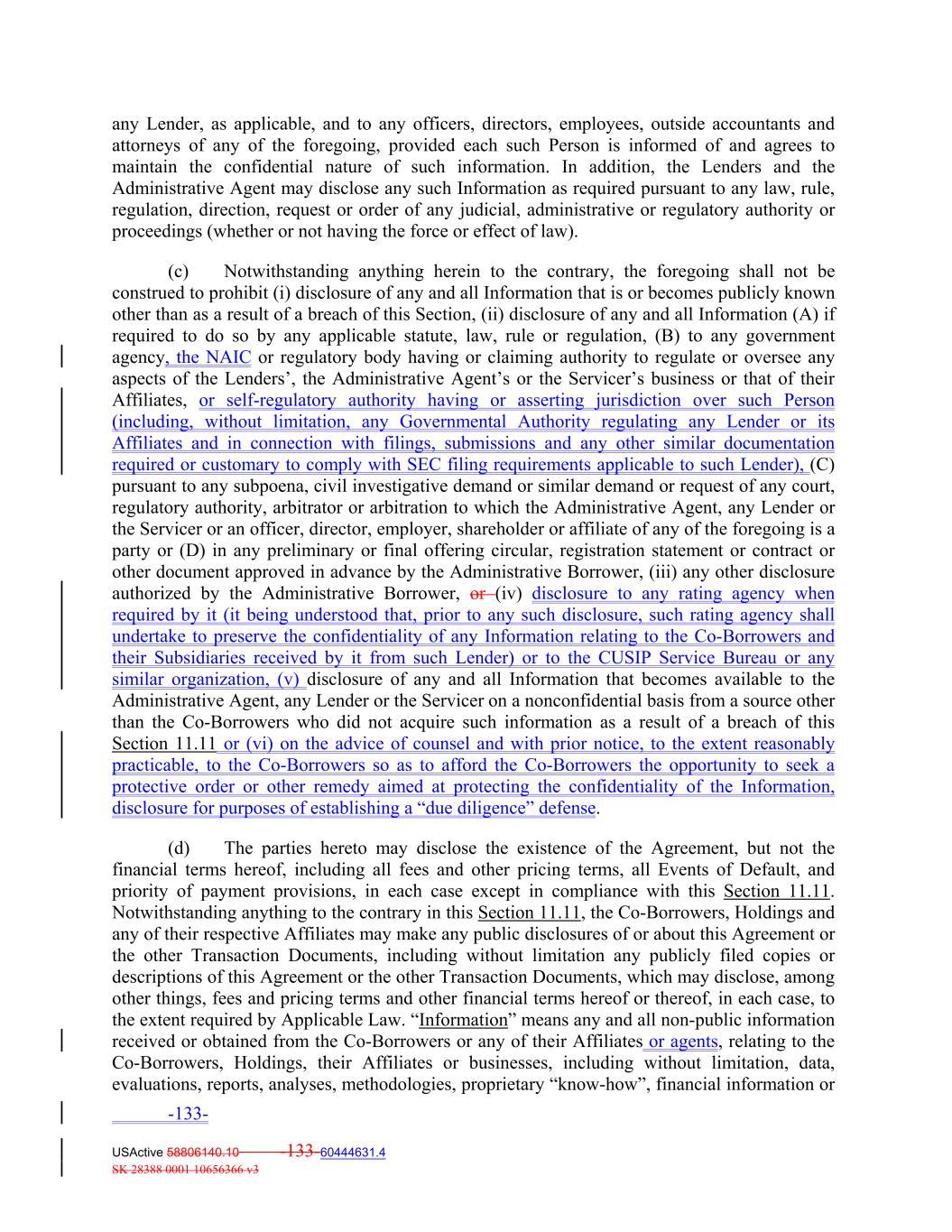 any Lender, as applicable, and to any officers, directors, employees, outside accountants and attorneys of any of the foregoing, provided each such Person is informed of and agrees to maintain the confidential nature of such information. In addition, the Lenders and the Administrative Agent may disclose any such Information as required pursuant to any law, rule, regulation, direction, request or order of any judicial, administrative or regulatory authority or proceedings (whether or not having the force or effect of law). (c) Notwithstanding anything herein to the contrary, the foregoing shall not be construed to prohibit (i) disclosure of any and all Information that is or becomes publicly known other than as a result of a breach of this Section, (ii) disclosure of any and all Information (A) if required to do so by any applicable statute, law, rule or regulation, (B) to any government agency, the NAIC or regulatory body having or claiming authority to regulate or oversee any aspects of the Lenders’, the Administrative Agent’s or the Servicer’s business or that of their Affiliates, or self-regulatory authority having or asserting jurisdiction over such Person (including, without limitation, any Governmental Authority regulating any Lender or its Affiliates and in connection with filings, submissions and any other similar documentation required or customary to comply with SEC filing requirements applicable to such Lender), (C) pursuant to any subpoena, civil investigative demand or similar demand or request of any court, regulatory authority, arbitrator or arbitration to which the Administrative Agent, any Lender or the Servicer or an officer, director, employer, shareholder or affiliate of any of the foregoing is a party or (D) in any preliminary or final offering circular, registration statement or contract or other document approved in advance by the Administrative Borrower, (iii) any other disclosure authorized by the Administrative Borrower, or (iv) disclosure to any rating agency when required by it (it being understood that, prior to any such disclosure, such rating agency shall undertake to preserve the confidentiality of any Information relating to the Co-Borrowers and their Subsidiaries received by it from such Lender) or to the CUSIP Service Bureau or any similar organization, (v) disclosure of any and all Information that becomes available to the Administrative Agent, any Lender or the Servicer on a nonconfidential basis from a source other than the Co‐Borrowers who did not acquire such information as a result of a breach of this Section 11.11 or (vi) on the advice of counsel and with prior notice, to the extent reasonably practicable, to the Co-Borrowers so as to afford the Co-Borrowers the opportunity to seek a protective order or other remedy aimed at protecting the confidentiality of the Information, disclosure for purposes of establishing a “due diligence” defense. (d) The parties hereto may disclose the existence of the Agreement, but not the financial terms hereof, including all fees and other pricing terms, all Events of Default, and priority of payment provisions, in each case except in compliance with this Section 11.11. Notwithstanding anything to the contrary in this Section 11.11, the Co‐Borrowers, Holdings and any of their respective Affiliates may make any public disclosures of or about this Agreement or the other Transaction Documents, including without limitation any publicly filed copies or descriptions of this Agreement or the other Transaction Documents, which may disclose, among other things, fees and pricing terms and other financial terms hereof or thereof, in each case, to the extent required by Applicable Law. “Information” means any and all non‐public information received or obtained from the Co‐Borrowers or any of their Affiliates or agents, relating to the Co‐Borrowers, Holdings, their Affiliates or businesses, including without limitation, data, evaluations, reports, analyses, methodologies, proprietary “know‐how”, financial information or -133- USActive 58806140.10 -133-60444631.4 SK 28388 0001 10656366 v3