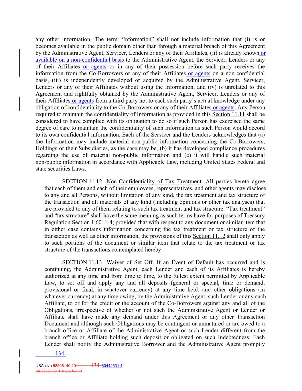 any other information. The term “Information” shall not include information that (i) is or becomes available in the public domain other than through a material breach of this Agreement by the Administrative Agent, Servicer, Lenders or any of their Affiliates, (ii) is already known or available on a non-confidential basis to the Administrative Agent, the Servicer, Lenders or any of their Affiliates or agents or in any of their possession before such party receives the information from the Co‐Borrowers or any of their Affiliates or agents on a non‐confidential basis, (iii) is independently developed or acquired by the Administrative Agent, Servicer, Lenders or any of their Affiliates without using the Information, and (iv) is unrelated to this Agreement and rightfully obtained by the Administrative Agent, Servicer, Lenders or any of their Affiliates or agents from a third party not to each such party’s actual knowledge under any obligation of confidentiality to the Co‐Borrowers or any of their Affiliates or agents. Any Person required to maintain the confidentiality of Information as provided in this Section 11.11 shall be considered to have complied with its obligation to do so if such Person has exercised the same degree of care to maintain the confidentiality of such Information as such Person would accord to its own confidential information. Each of the Servicer and the Lenders acknowledges that (a) the Information may include material non‐public information concerning the Co‐Borrowers, Holdings or their Subsidiaries, as the case may be, (b) it has developed compliance procedures regarding the use of material non‐public information and (c) it will handle such material non‐public information in accordance with Applicable Law, including United States Federal and state securities Laws. SECTION 11.12 Non‐Confidentiality of Tax Treatment. All parties hereto agree that each of them and each of their employees, representatives, and other agents may disclose to any and all Persons, without limitation of any kind, the tax treatment and tax structure of the transaction and all materials of any kind (including opinions or other tax analyses) that are provided to any of them relating to such tax treatment and tax structure. “Tax treatment” and “tax structure” shall have the same meaning as such terms have for purposes of Treasury Regulation Section 1.6011‐4; provided that with respect to any document or similar item that in either case contains information concerning the tax treatment or tax structure of the transaction as well as other information, the provisions of this Section 11.12 shall only apply to such portions of the document or similar item that relate to the tax treatment or tax structure of the transactions contemplated hereby. SECTION 11.13 Waiver of Set Off. If an Event of Default has occurred and is continuing, the Administrative Agent, each Lender and each of its Affiliates is hereby authorized at any time and from time to time, to the fullest extent permitted by Applicable Law, to set off and apply any and all deposits (general or special, time or demand, provisional or final, in whatever currency) at any time held, and other obligations (in whatever currency) at any time owing, by the Administrative Agent, such Lender or any such Affiliate, to or for the credit or the account of the Co‐Borrowers against any and all of the Obligations, irrespective of whether or not such the Administrative Agent or Lender or Affiliate shall have made any demand under this Agreement or any other Transaction Document and although such Obligations may be contingent or unmatured or are owed to a branch office or Affiliate of the Administrative Agent or such Lender different from the branch office or Affiliate holding such deposit or obligated on such Indebtedness. Each Lender shall notify the Administrative Borrower and the Administrative Agent promptly -134- USActive 58806140.10 -134-60444631.4 SK 28388 0001 10656366 v3