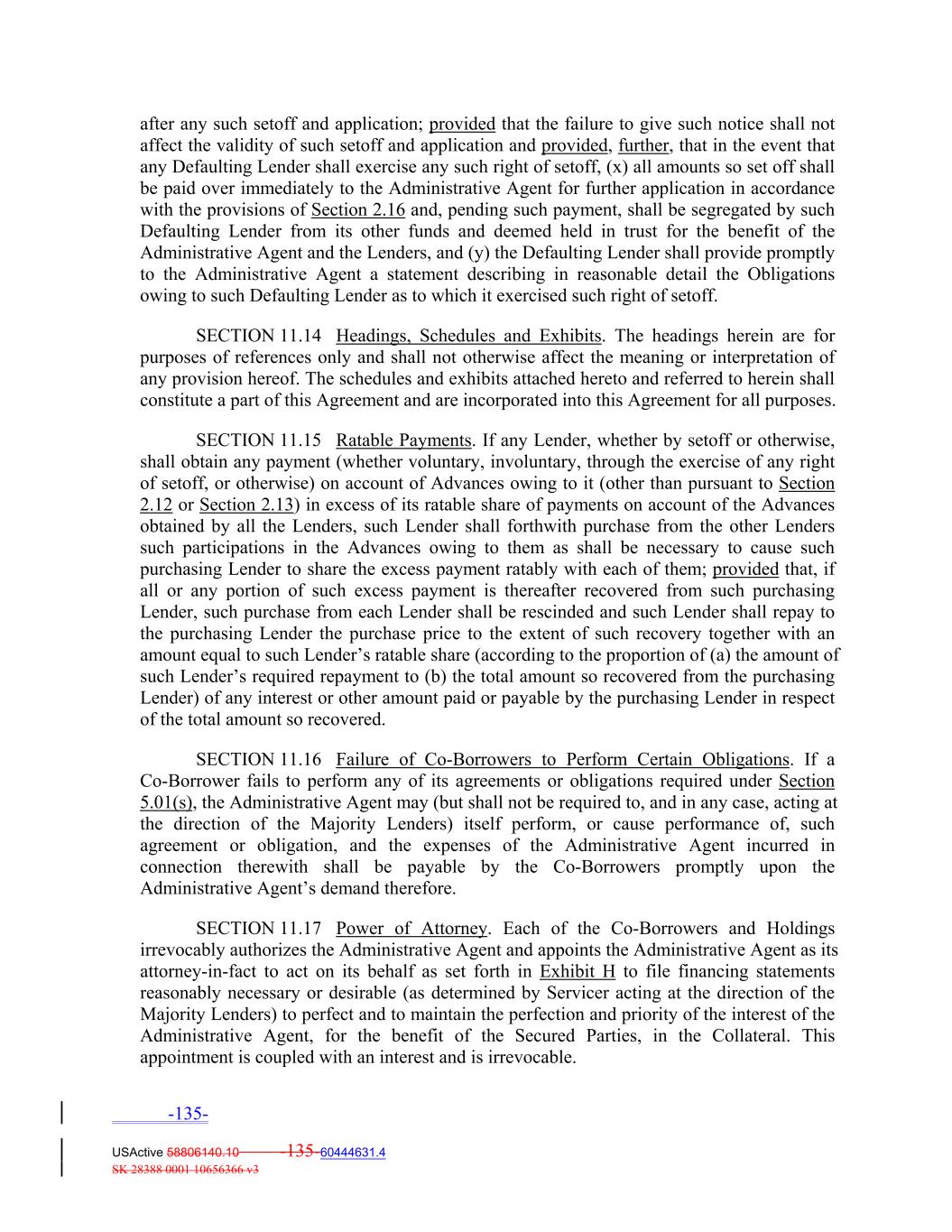after any such setoff and application; provided that the failure to give such notice shall not affect the validity of such setoff and application and provided, further, that in the event that any Defaulting Lender shall exercise any such right of setoff, (x) all amounts so set off shall be paid over immediately to the Administrative Agent for further application in accordance with the provisions of Section 2.16 and, pending such payment, shall be segregated by such Defaulting Lender from its other funds and deemed held in trust for the benefit of the Administrative Agent and the Lenders, and (y) the Defaulting Lender shall provide promptly to the Administrative Agent a statement describing in reasonable detail the Obligations owing to such Defaulting Lender as to which it exercised such right of setoff. SECTION 11.14 Headings, Schedules and Exhibits. The headings herein are for purposes of references only and shall not otherwise affect the meaning or interpretation of any provision hereof. The schedules and exhibits attached hereto and referred to herein shall constitute a part of this Agreement and are incorporated into this Agreement for all purposes. SECTION 11.15 Ratable Payments. If any Lender, whether by setoff or otherwise, shall obtain any payment (whether voluntary, involuntary, through the exercise of any right of setoff, or otherwise) on account of Advances owing to it (other than pursuant to Section 2.12 or Section 2.13) in excess of its ratable share of payments on account of the Advances obtained by all the Lenders, such Lender shall forthwith purchase from the other Lenders such participations in the Advances owing to them as shall be necessary to cause such purchasing Lender to share the excess payment ratably with each of them; provided that, if all or any portion of such excess payment is thereafter recovered from such purchasing Lender, such purchase from each Lender shall be rescinded and such Lender shall repay to the purchasing Lender the purchase price to the extent of such recovery together with an amount equal to such Lender’s ratable share (according to the proportion of (a) the amount of such Lender’s required repayment to (b) the total amount so recovered from the purchasing Lender) of any interest or other amount paid or payable by the purchasing Lender in respect of the total amount so recovered. SECTION 11.16 Failure of Co‐Borrowers to Perform Certain Obligations. If a Co‐Borrower fails to perform any of its agreements or obligations required under Section 5.01(s), the Administrative Agent may (but shall not be required to, and in any case, acting at the direction of the Majority Lenders) itself perform, or cause performance of, such agreement or obligation, and the expenses of the Administrative Agent incurred in connection therewith shall be payable by the Co‐Borrowers promptly upon the Administrative Agent’s demand therefore. SECTION 11.17 Power of Attorney. Each of the Co‐Borrowers and Holdings irrevocably authorizes the Administrative Agent and appoints the Administrative Agent as its attorney‐in‐fact to act on its behalf as set forth in Exhibit H to file financing statements reasonably necessary or desirable (as determined by Servicer acting at the direction of the Majority Lenders) to perfect and to maintain the perfection and priority of the interest of the Administrative Agent, for the benefit of the Secured Parties, in the Collateral. This appointment is coupled with an interest and is irrevocable. -135- USActive 58806140.10 -135-60444631.4 SK 28388 0001 10656366 v3